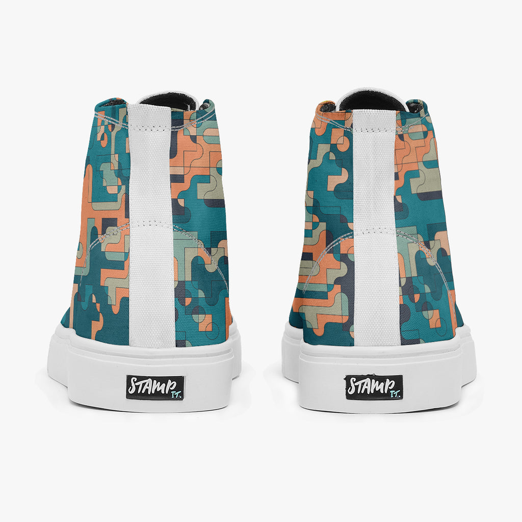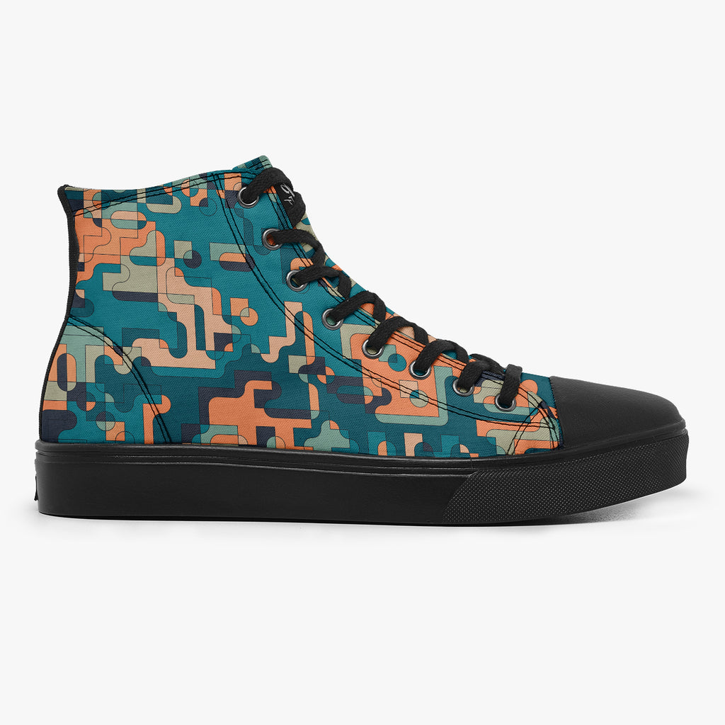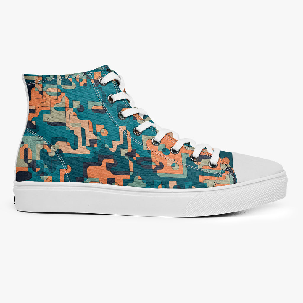Tênis Cano Alto Azul Pattern Formas Geométricas Onduladas Abstrato, confeccionado em lona, com cores e estampas exclusivas.