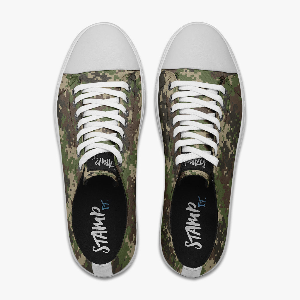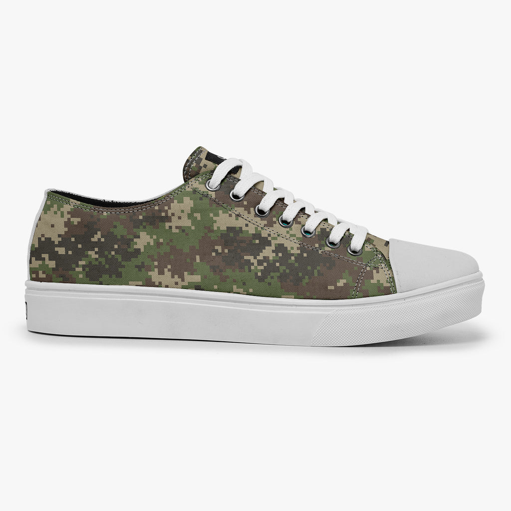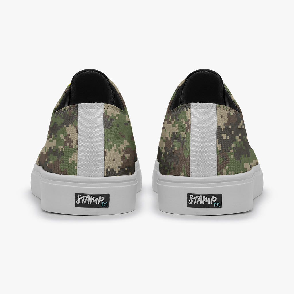 Tênis Cano Baixo Verde Camuflado 8 Bits Abstrato, confeccionado em lona, com cores e estampas exclusivas.