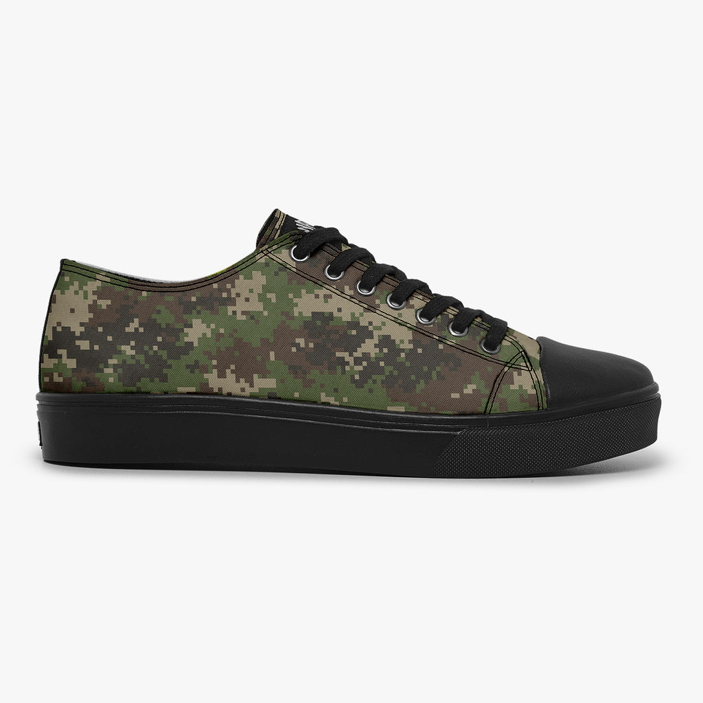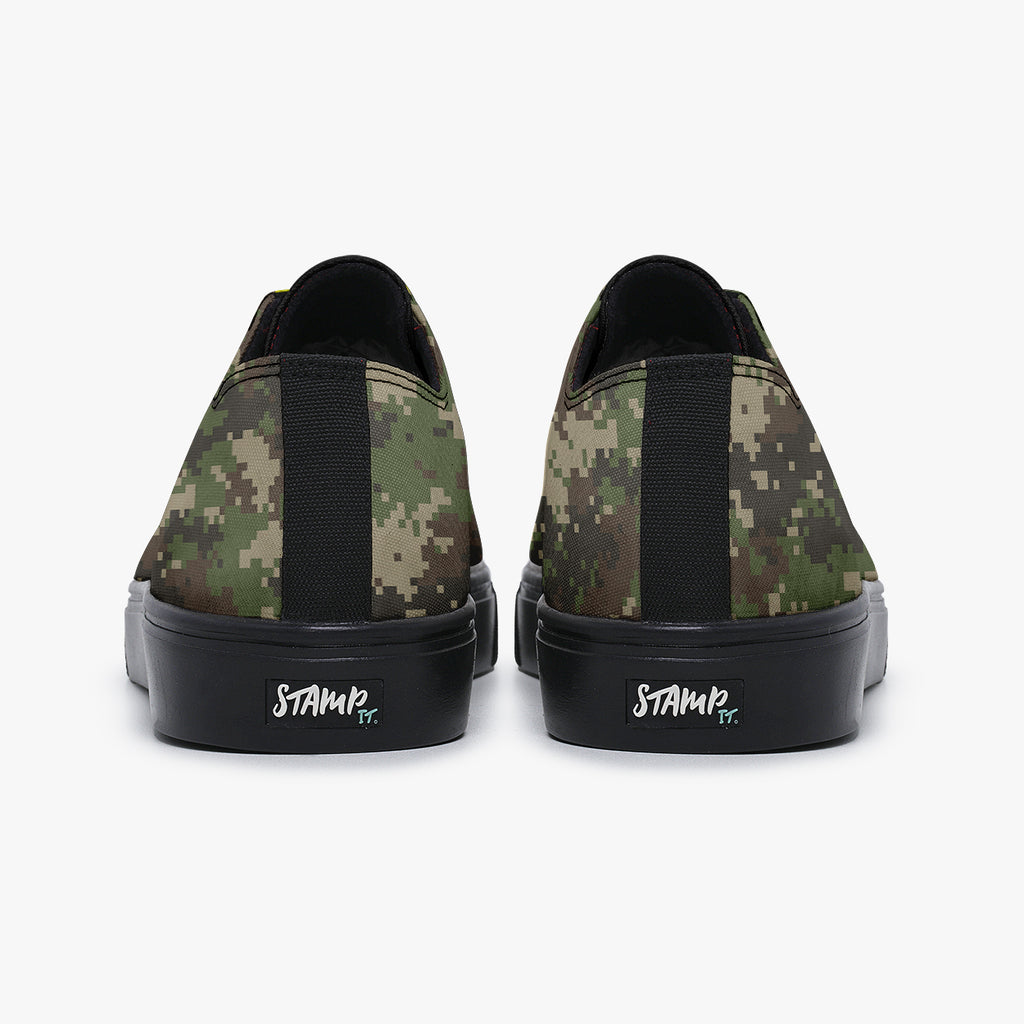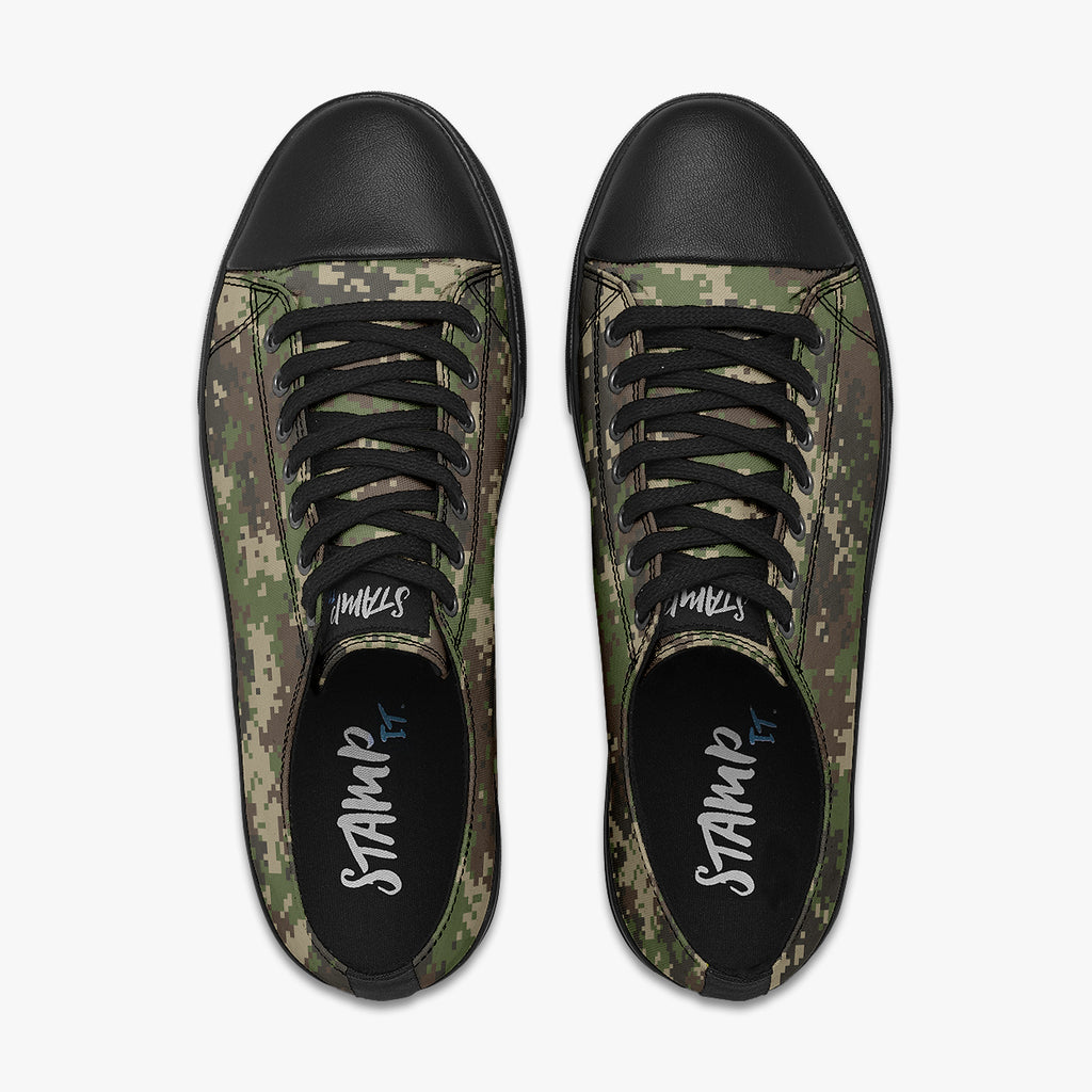 Tênis Cano Baixo Verde Camuflado 8 Bits Abstrato, confeccionado em lona, com cores e estampas exclusivas.