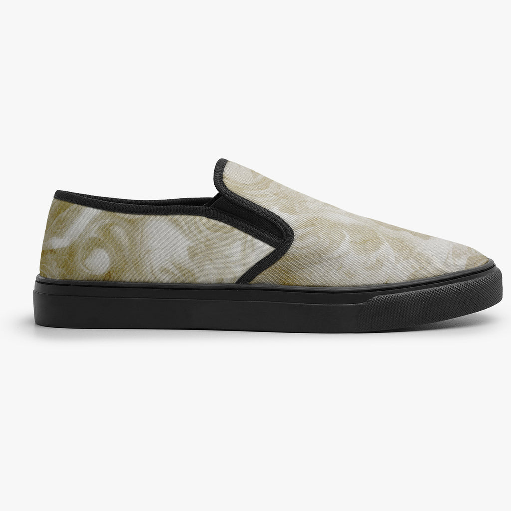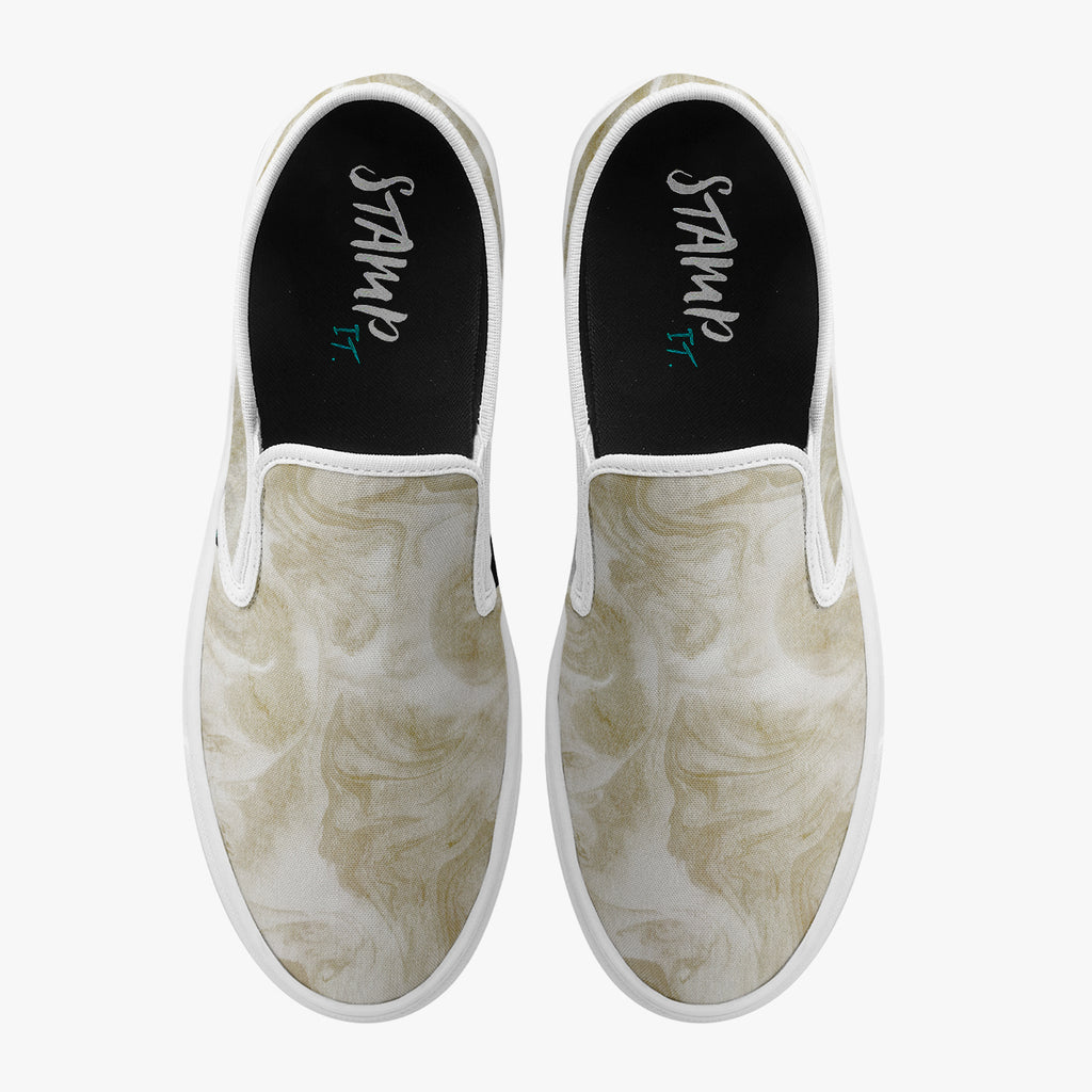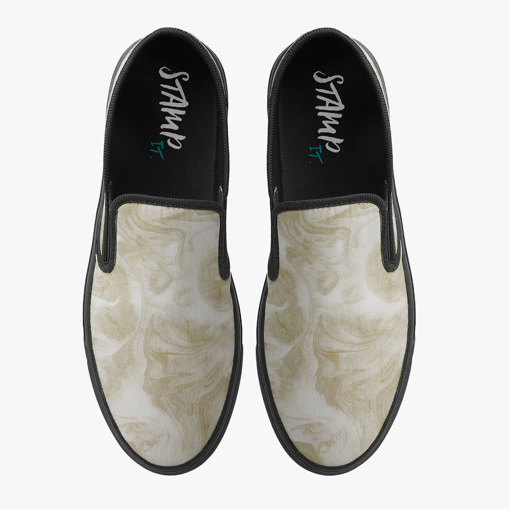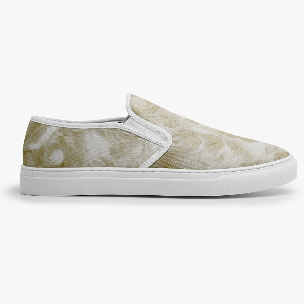 Tênis Slip On Bege Branco Textura Aquarela Abstrato, confeccionado em lona, com cores e estampas exclusivas.