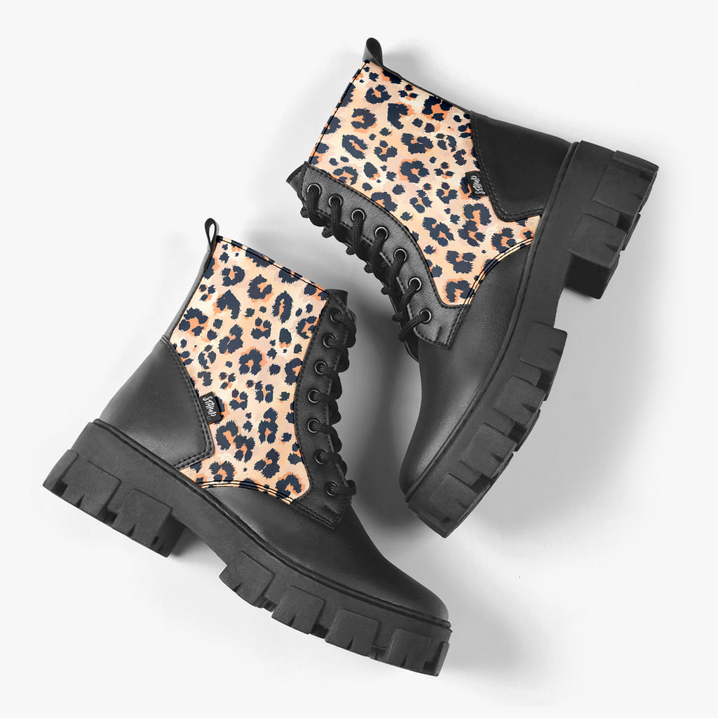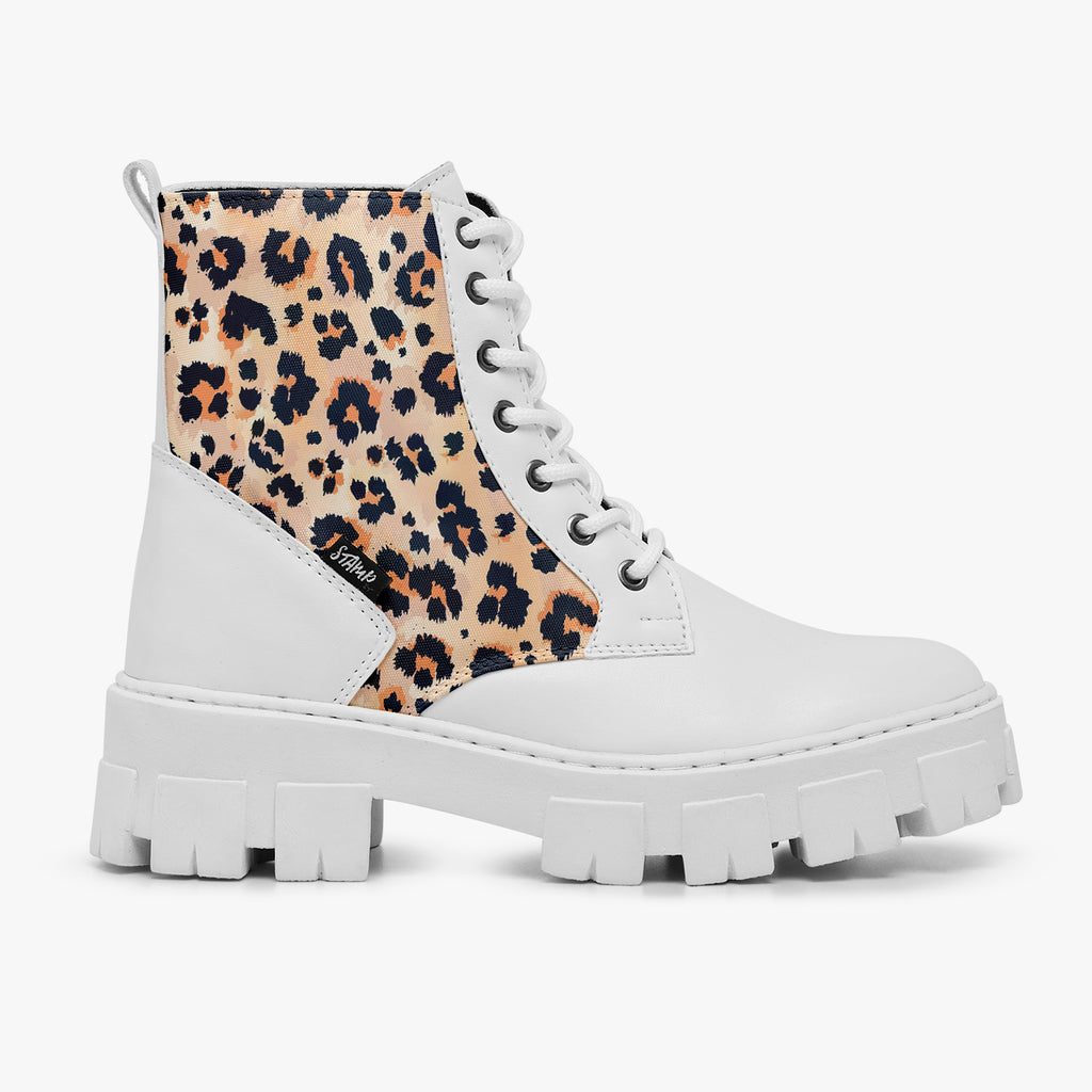 Bota Coturno Tratorada Cano Médio Animal Print Leopardo Abstrato Tons Pastéis Creme Animal Print, confeccionado em lona e couro sintético com cores e estampas exclusivas.