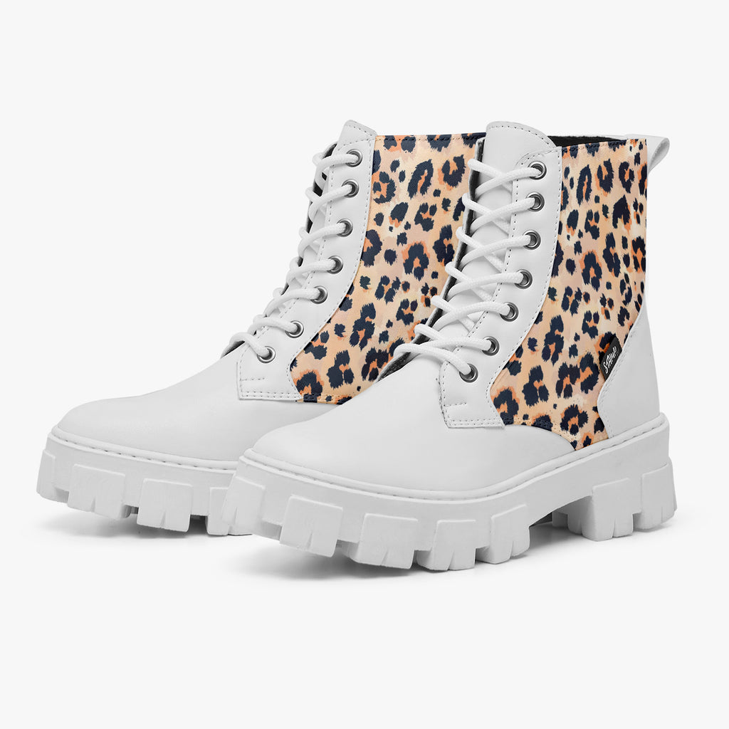 Bota Coturno Tratorada Cano Médio Animal Print Leopardo Abstrato Tons Pastéis Creme Animal Print