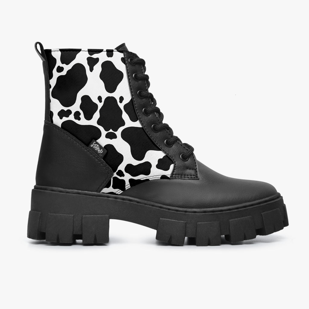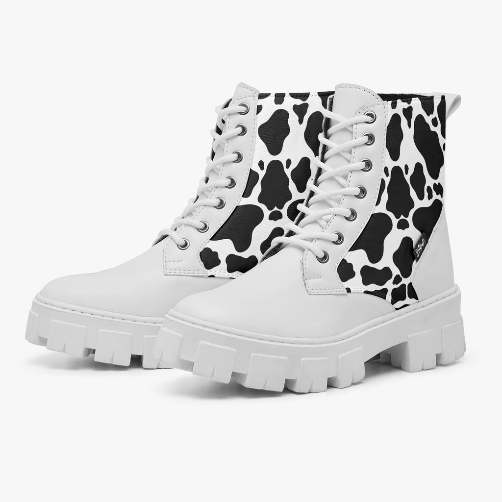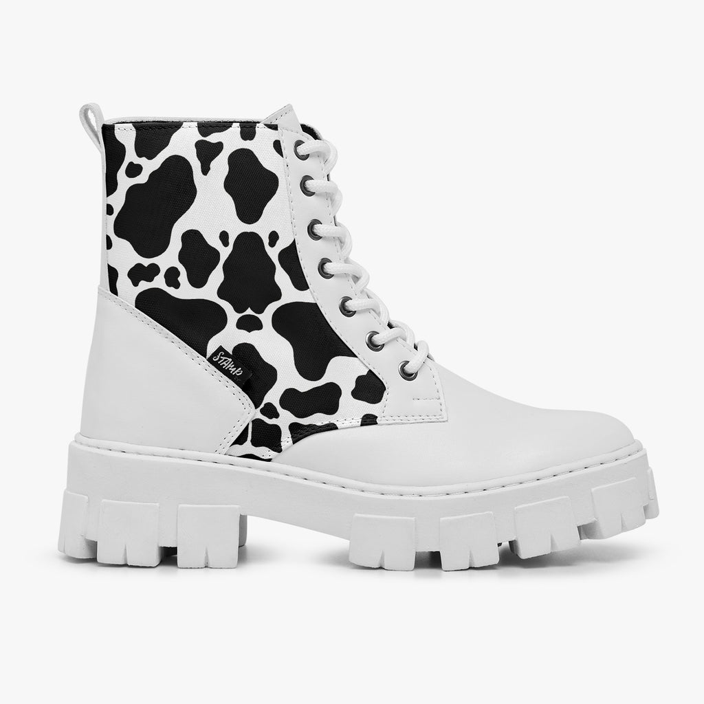 Bota Coturno Tratorada Cano Médio Animal Print Vaca CowTradicional Branco Animal Print, confeccionado em lona e couro sintético com cores e estampas exclusivas.