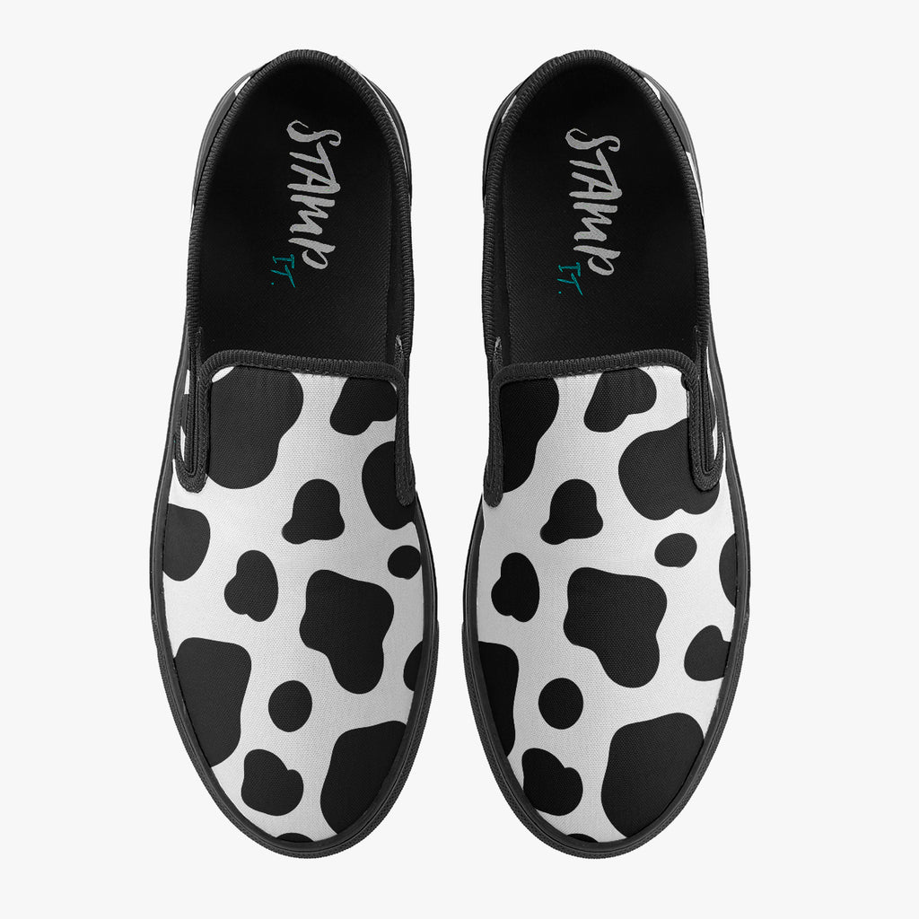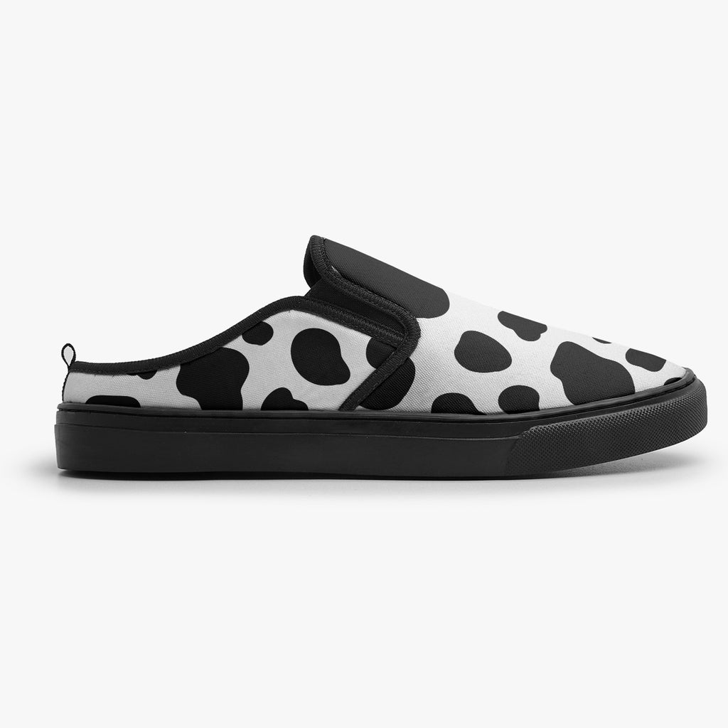 Tênis Mule Preto e Branco Vaquinha Animais, confeccionado em lona, com cores e estampas exclusivas.