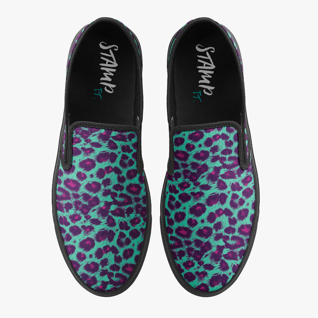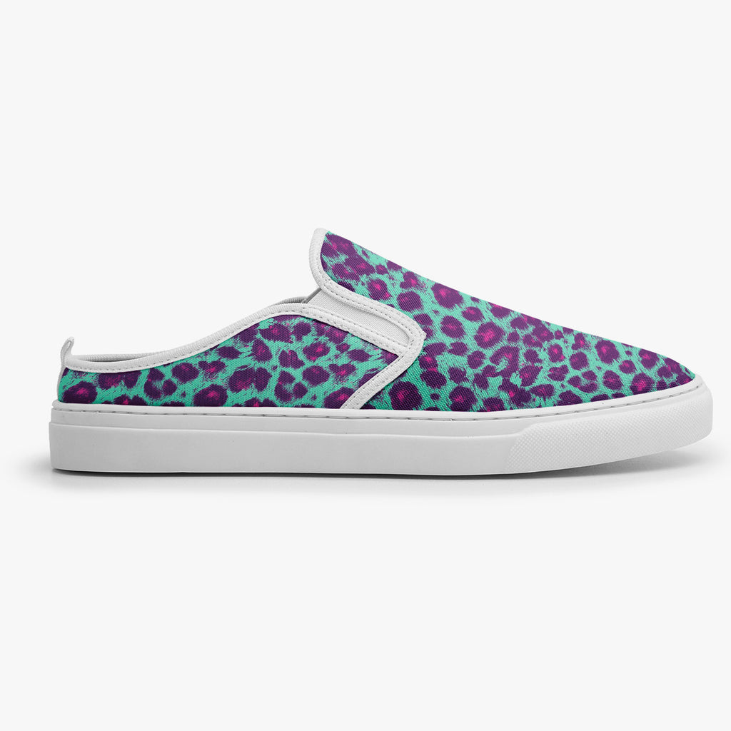 Calçado Mule Roxo Oncinha Animal Print Onça Neon Animais, confeccionado em lona, com cores e estampas exclusivas.