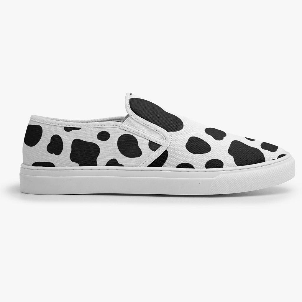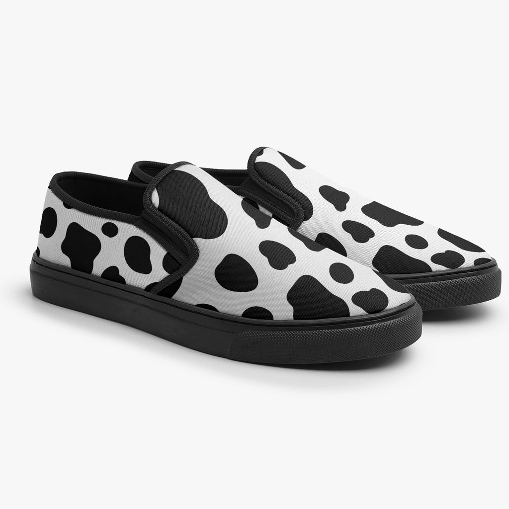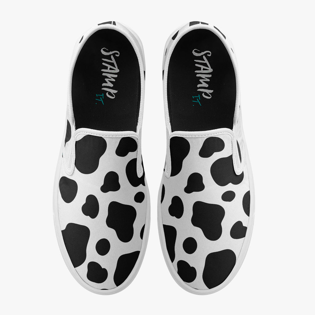 Tênis Slip On Preto e Branco Vaquinha Animais, confeccionado em lona, com cores e estampas exclusivas.