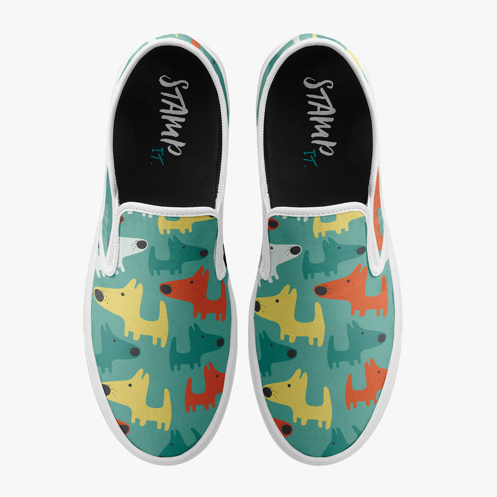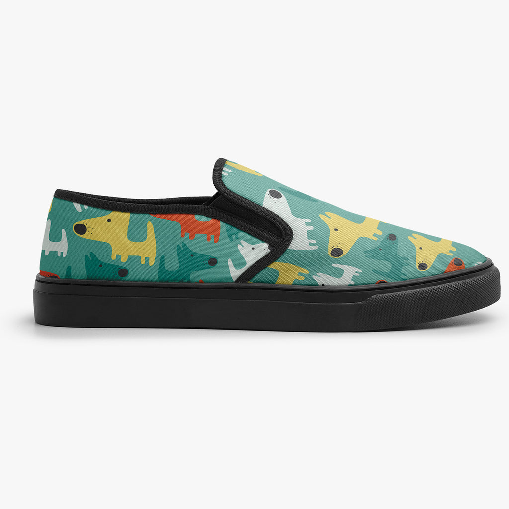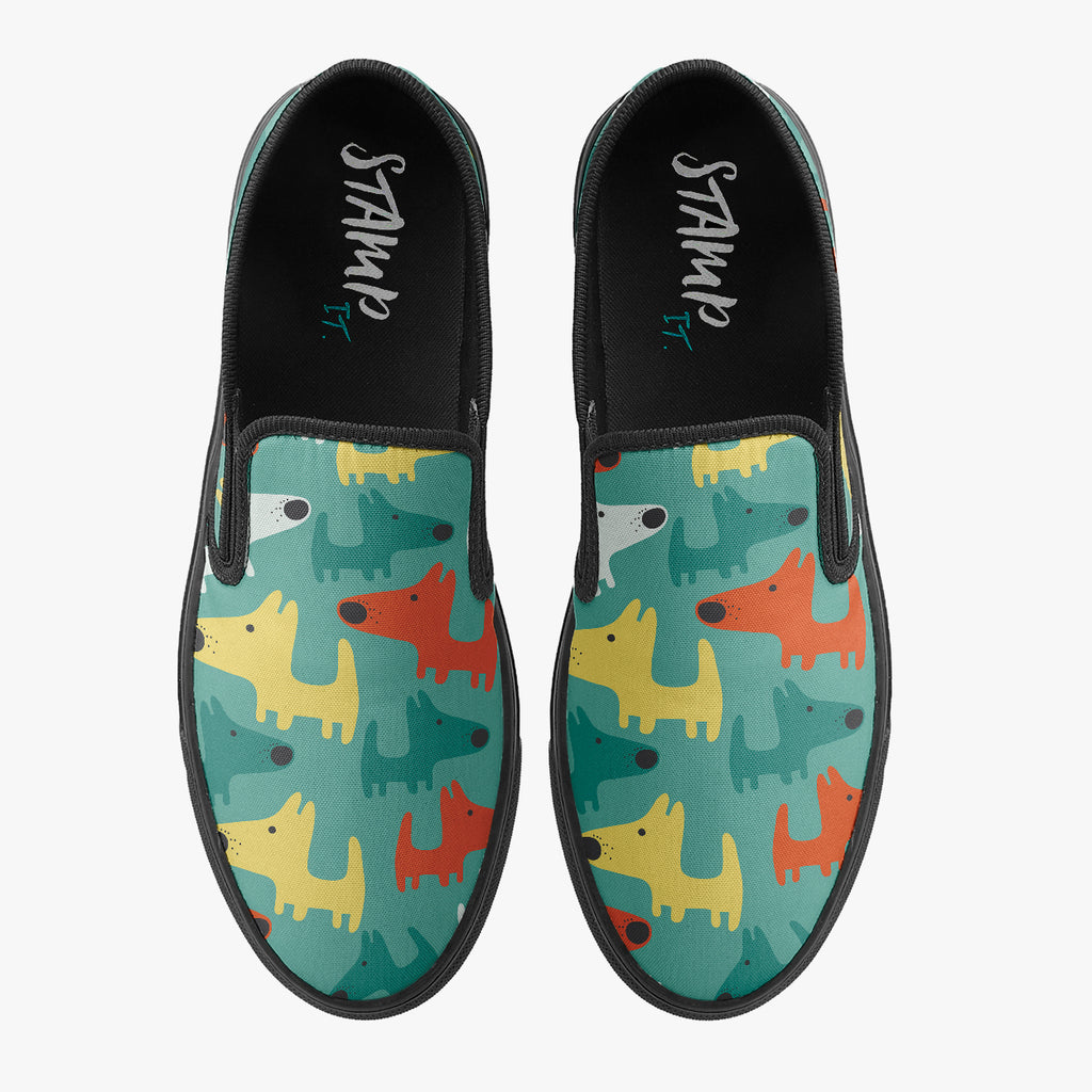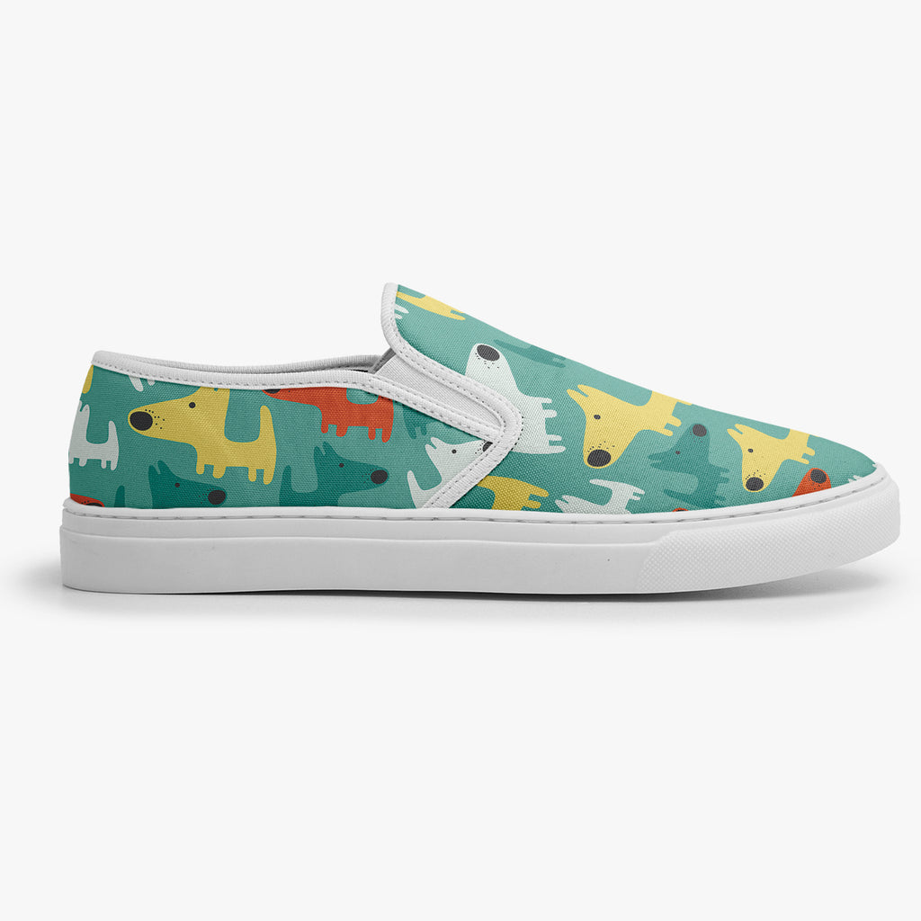 Tênis Slip On Verde Cachorros Amarelo Laranja Animais, confeccionado em lona, com cores e estampas exclusivas.
