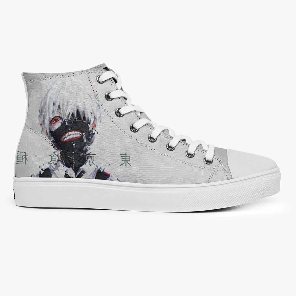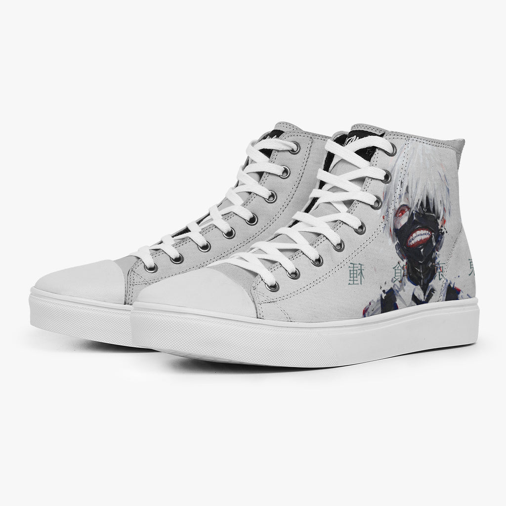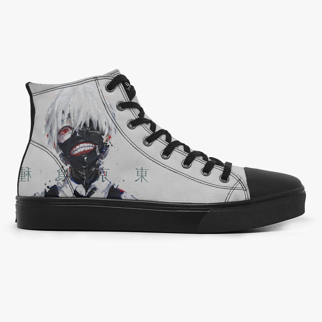 Tênis Cano Alto Cinza Tokyo Ghoul Ken Kaneki Escrito Japonês Anime, confeccionado em lona, com cores e estampas exclusivas.