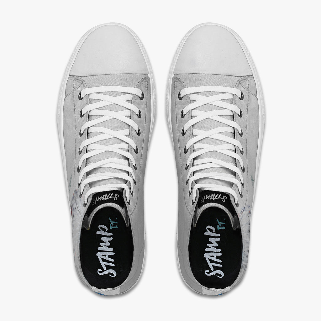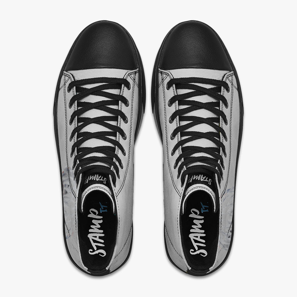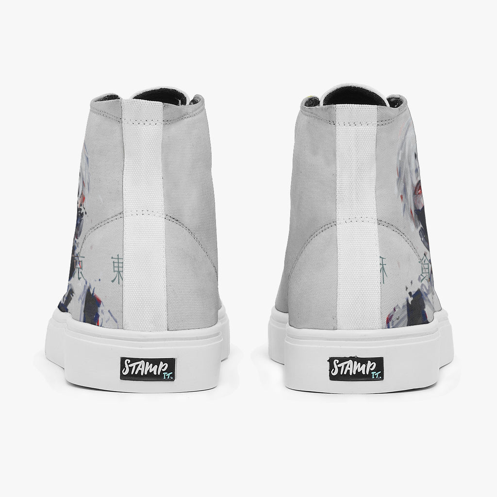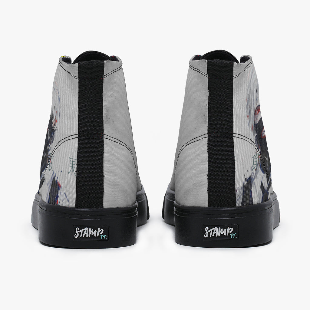 Tênis Cano Alto Cinza Tokyo Ghoul Ken Kaneki Escrito Japonês Anime, confeccionado em lona, com cores e estampas exclusivas.