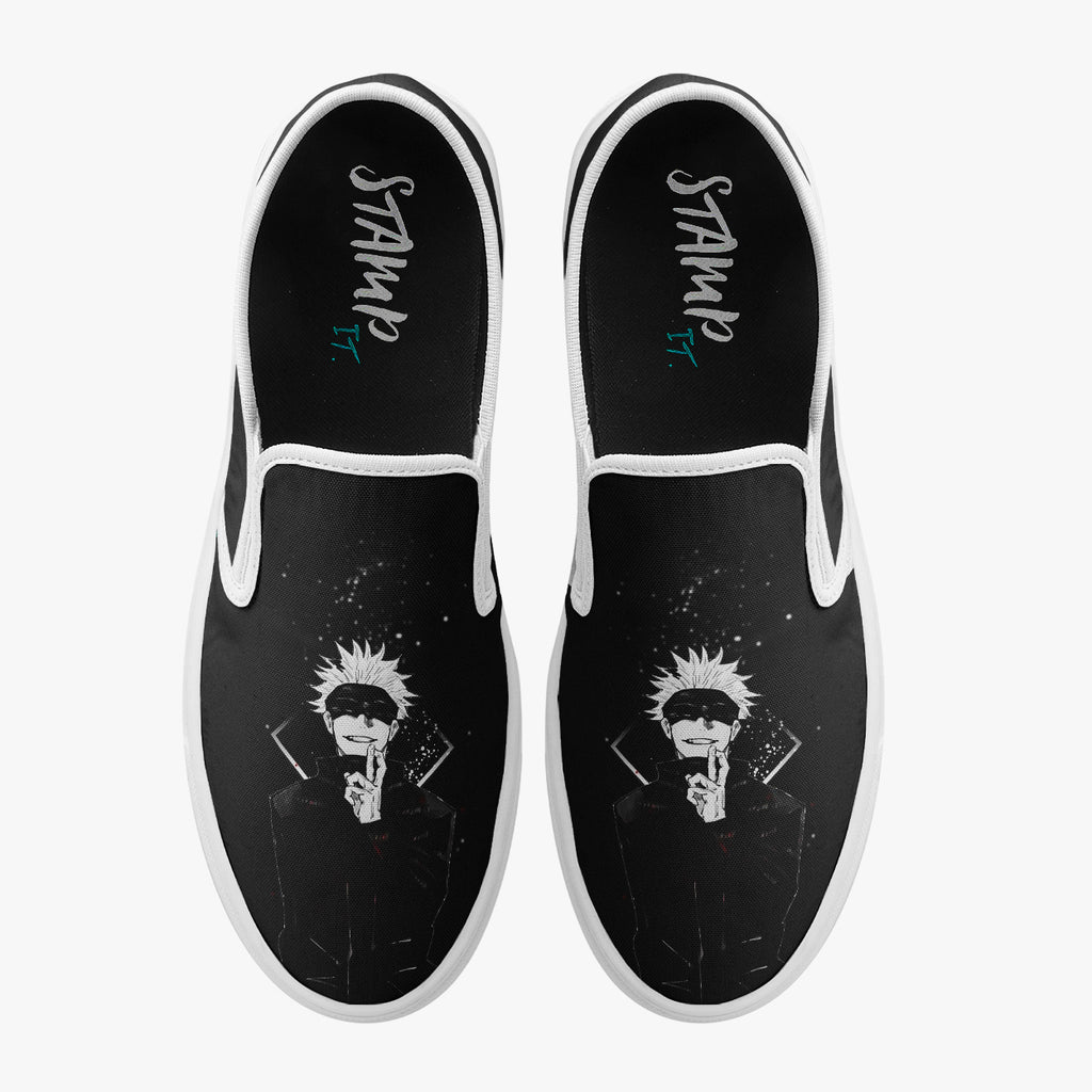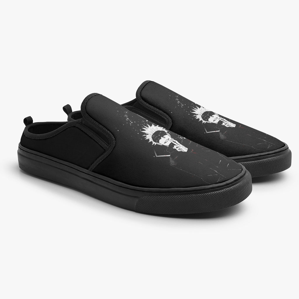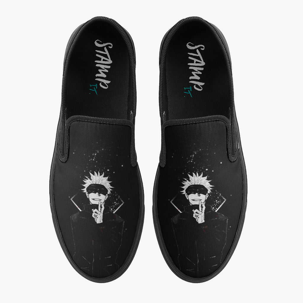 Tênis Mule Preto Jujutsu Kaisen Satoru Gojo Anime, confeccionado em lona, com cores e estampas exclusivas.