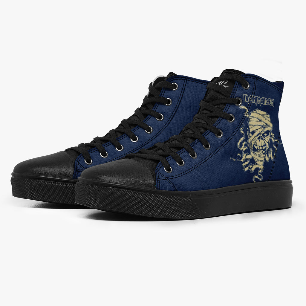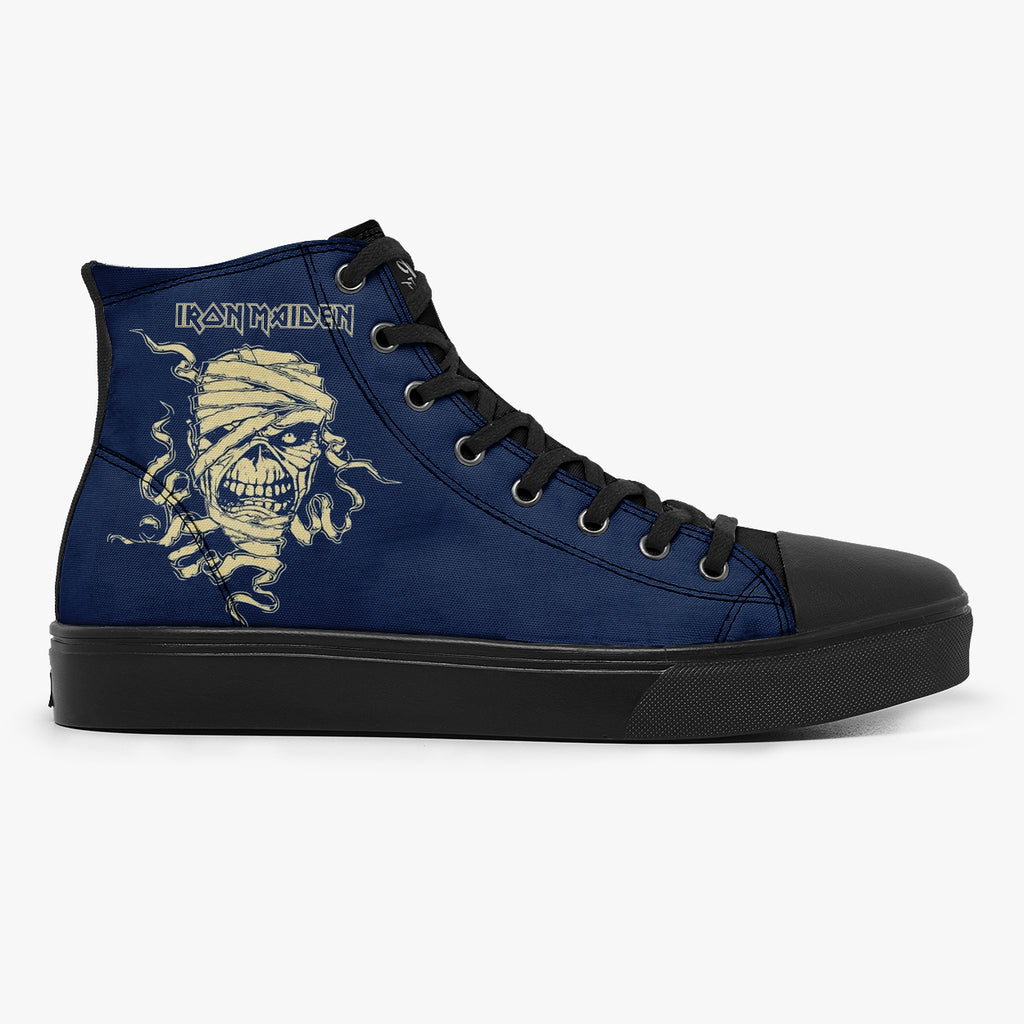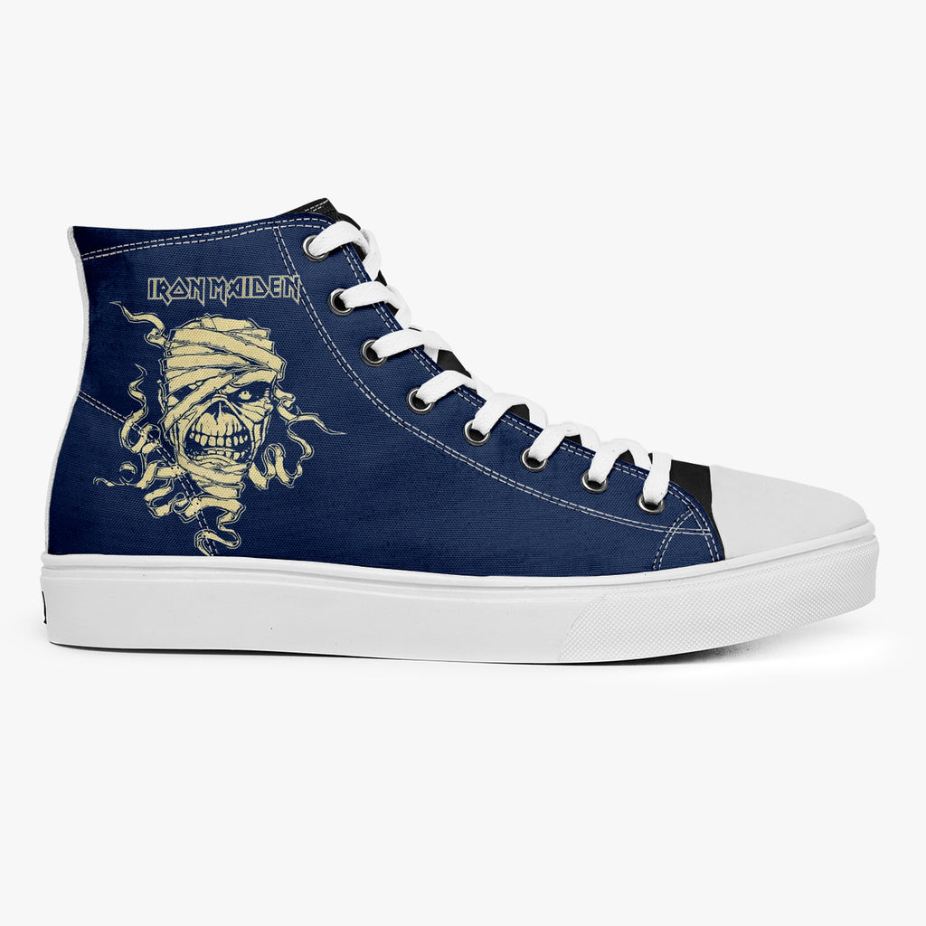 Tênis Cano Alto Azul Eddie Heavy Metal Iron Maiden Múmia Powerslave Bandas de Rock, confeccionado em lona, com cores e estampas exclusivas.