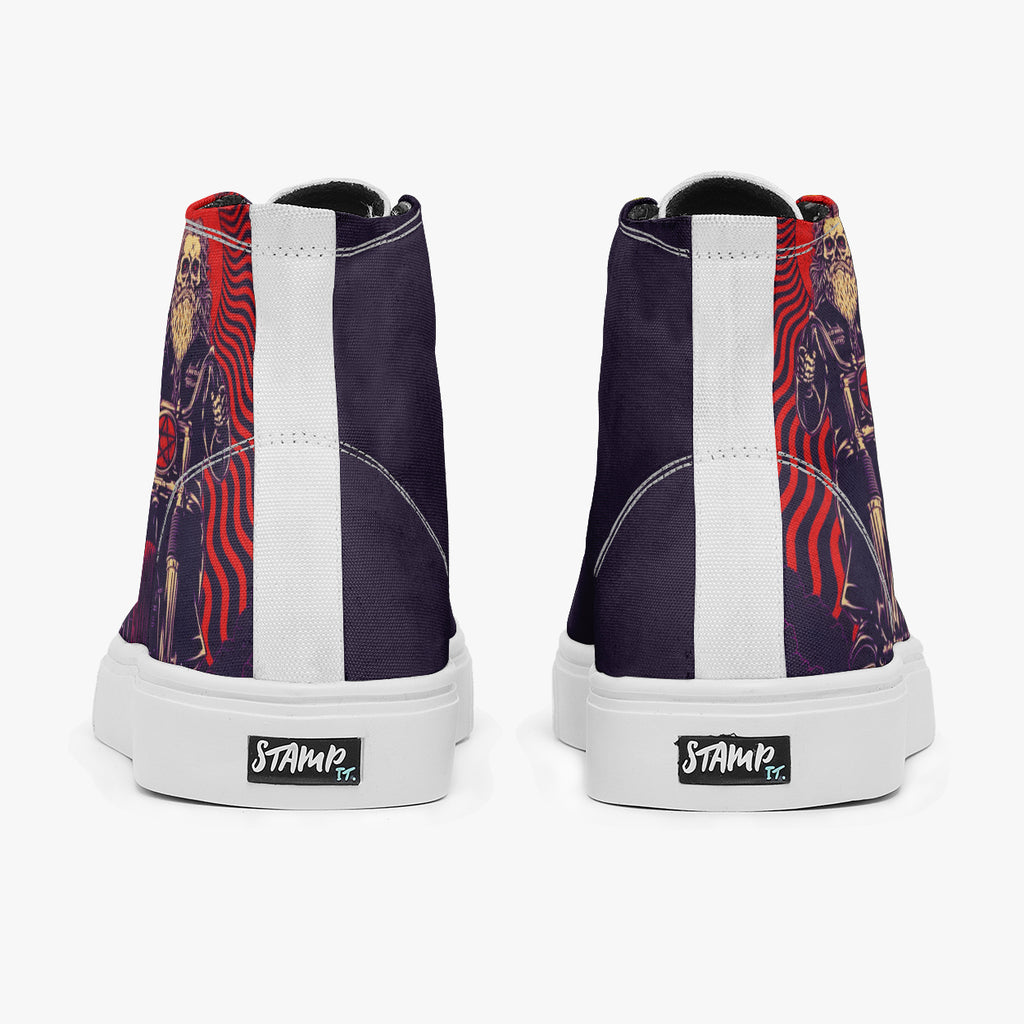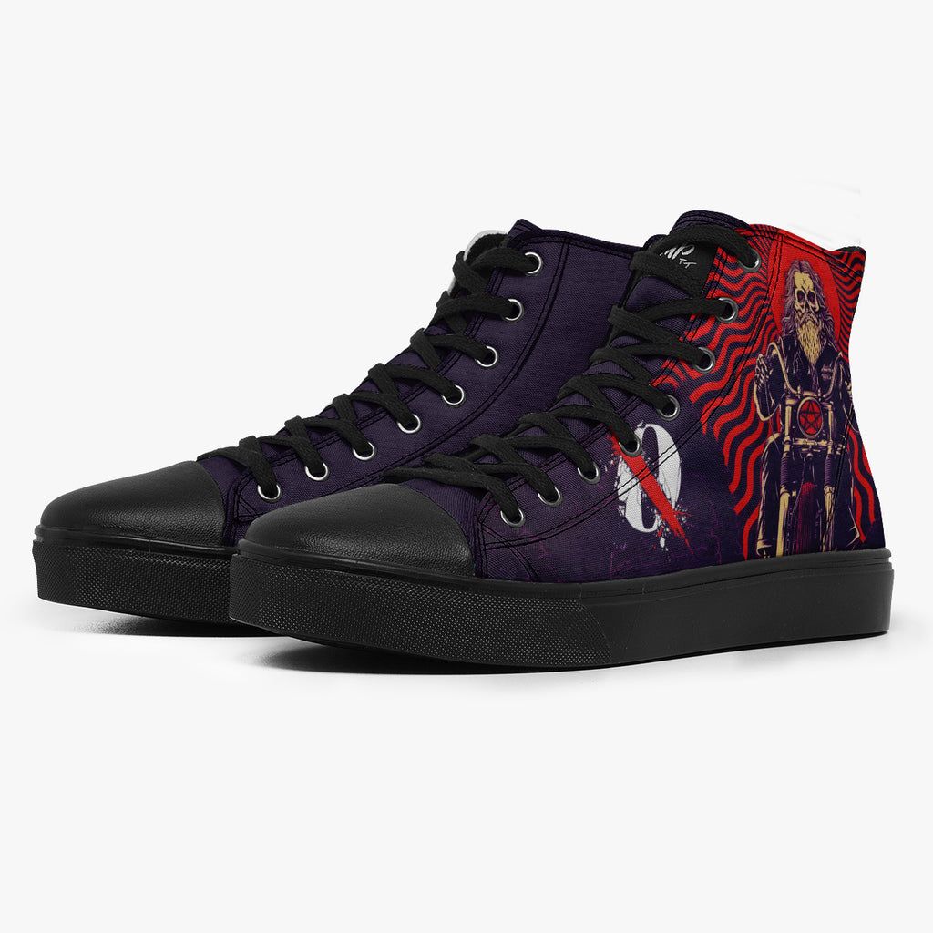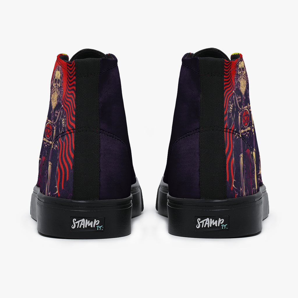 Tênis Cano Alto Roxo Queens of the Stone Age Motorcycle Bandas de Rock, confeccionado em lona, com cores e estampas exclusivas.