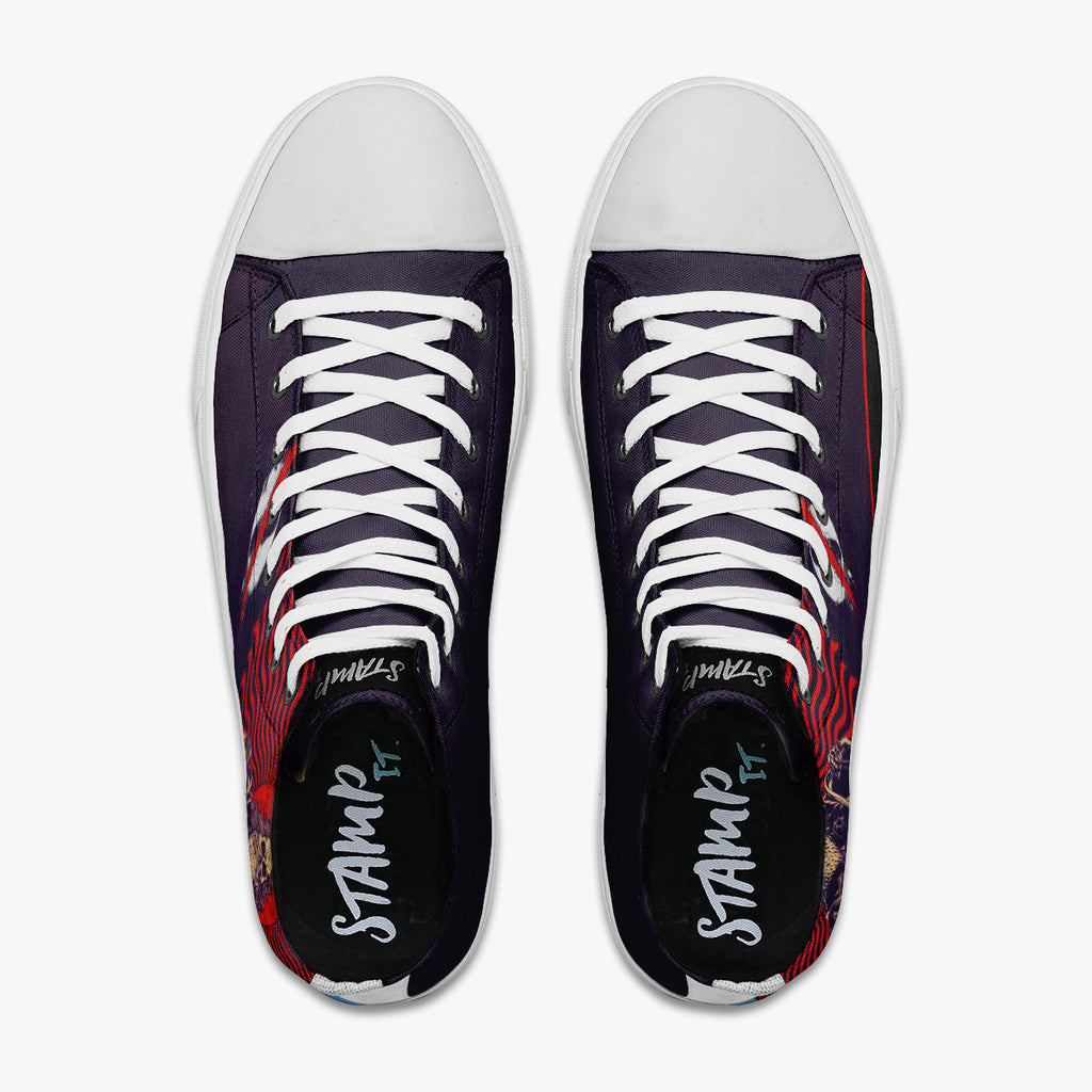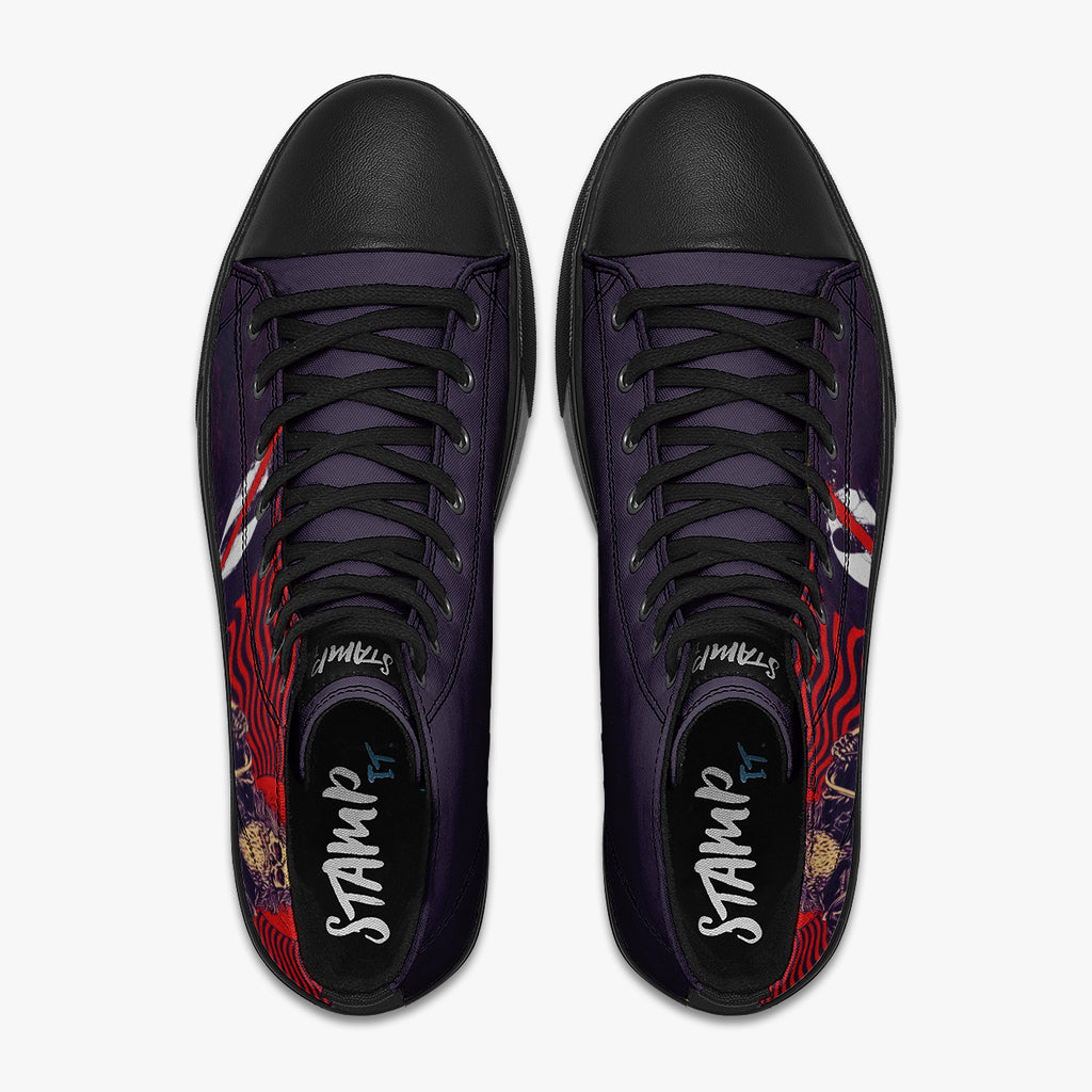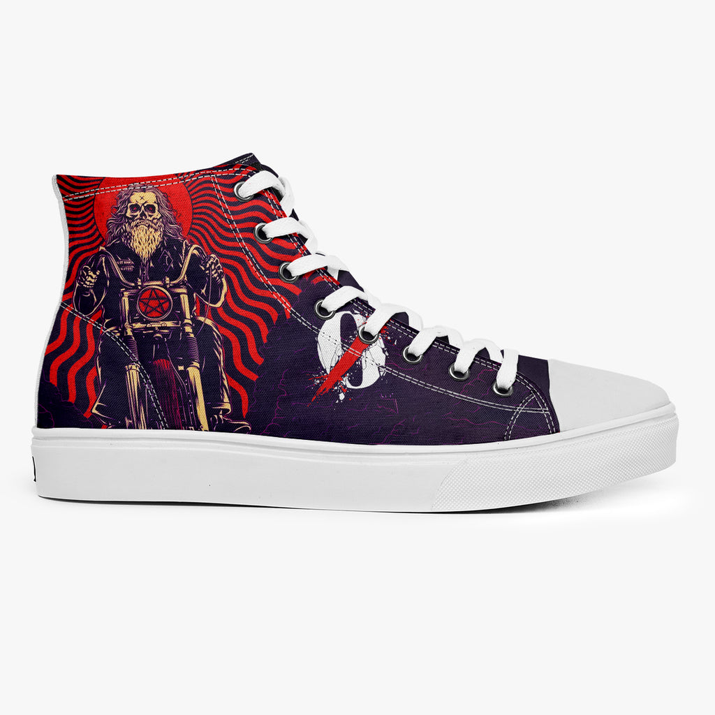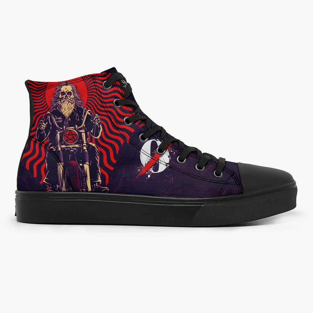 Tênis Cano Alto Roxo Queens of the Stone Age Motorcycle Bandas de Rock, confeccionado em lona, com cores e estampas exclusivas.