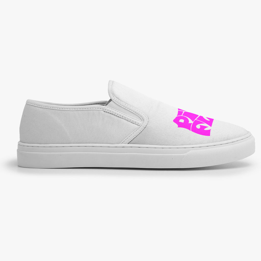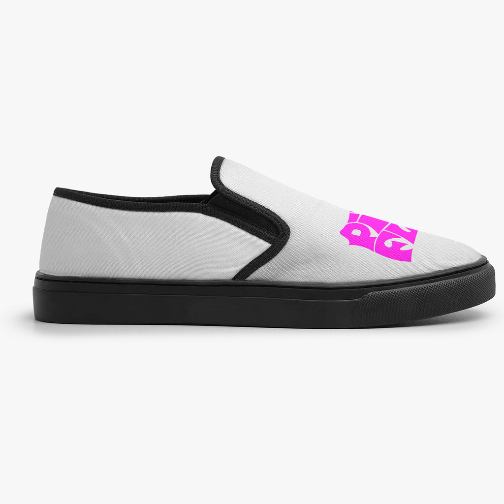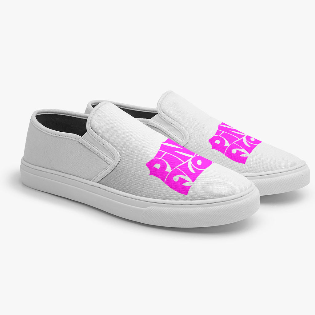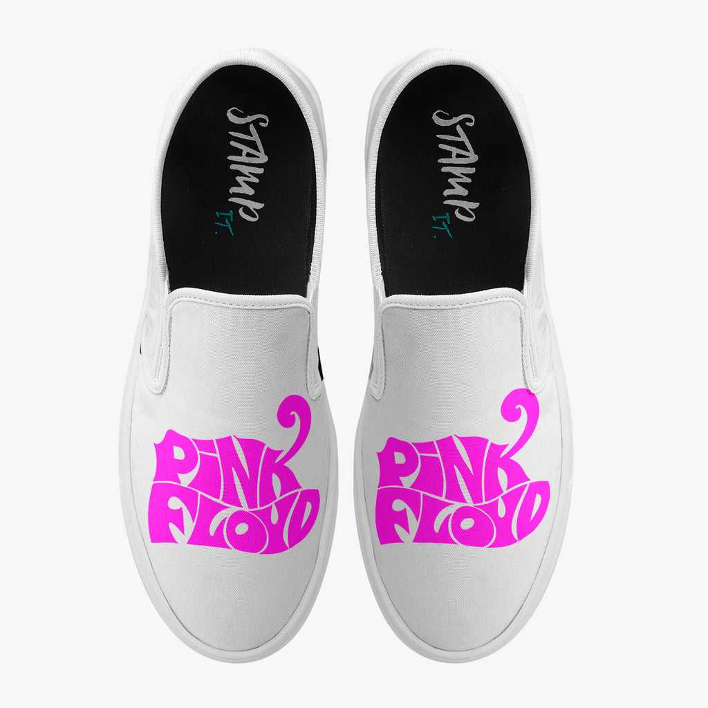 Tênis Slip On Branco Pink Floyd Caligrafia Rosa Bandas de Rock, confeccionado em lona, com cores e estampas exclusivas.