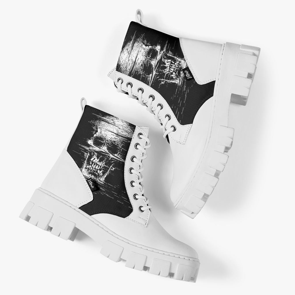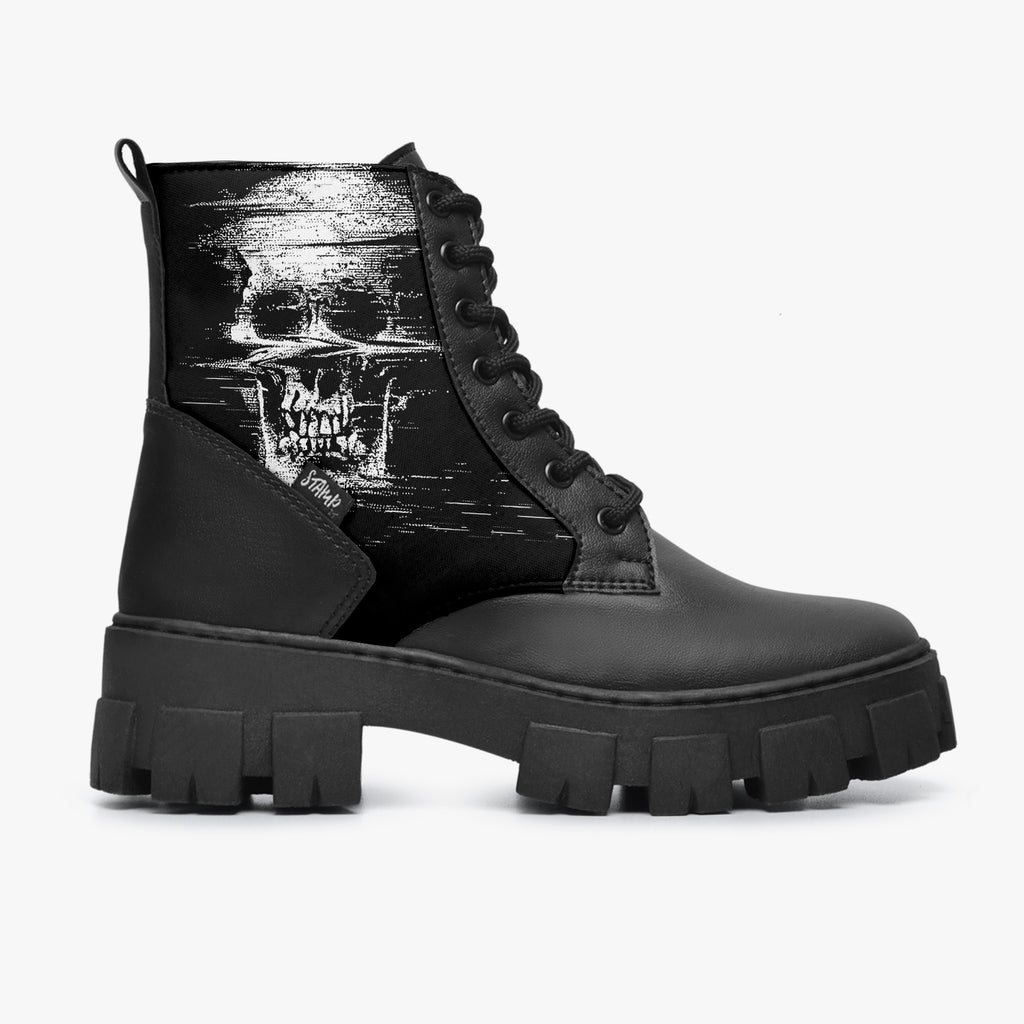 Bota Coturno Tratorada Cano Médio Caveira Psicodélica No Sigal Preto Caveiras, confeccionado em lona e couro sintético com cores e estampas exclusivas.