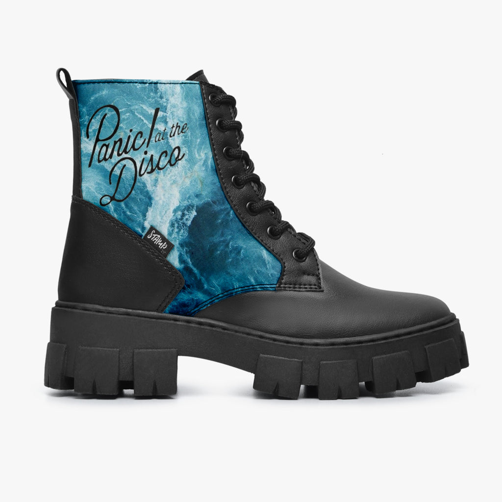 Bota Coturno Tratorada Cano Médio Rock N Roll Panic! At the Disco in the Sea Azul Bandas de Rock, confeccionado em lona e couro sintético com cores e estampas exclusivas.
