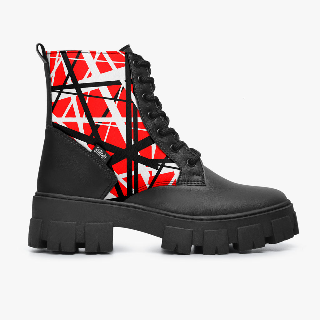 Bota Coturno Tratorada Cano Médio Rock N Roll Van Halen Guitarra Vermelha Bandas de Rock, confeccionado em lona e couro sintético com cores e estampas exclusivas.