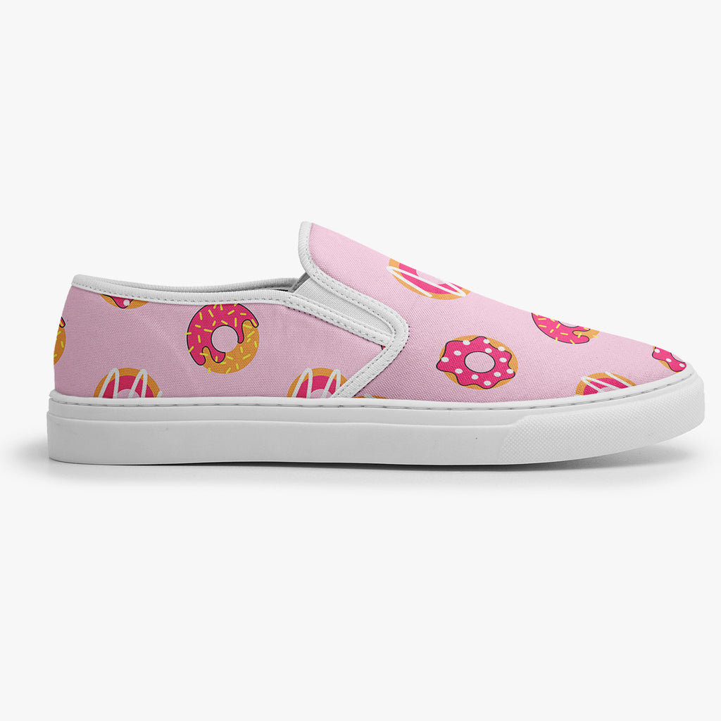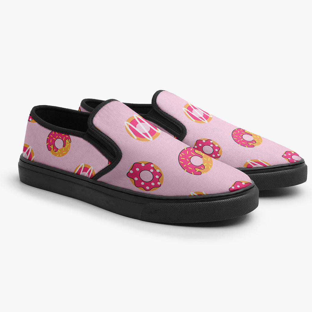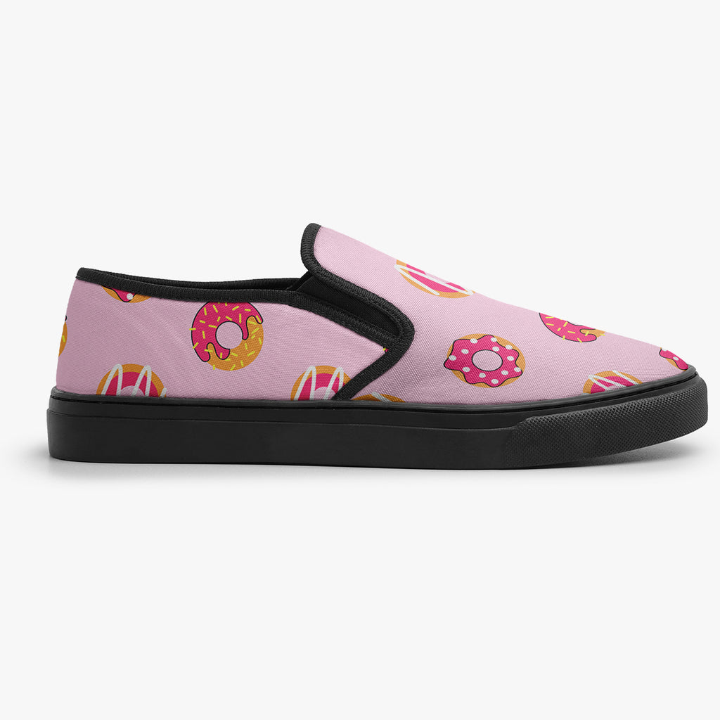 Tênis Slip On Rosa Rosquinha e Donuts Abstrato, confeccionado em lona, com cores e estampas exclusivas.