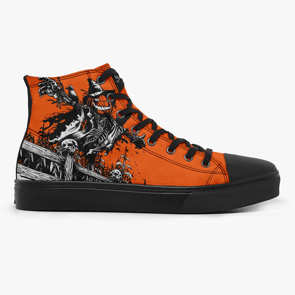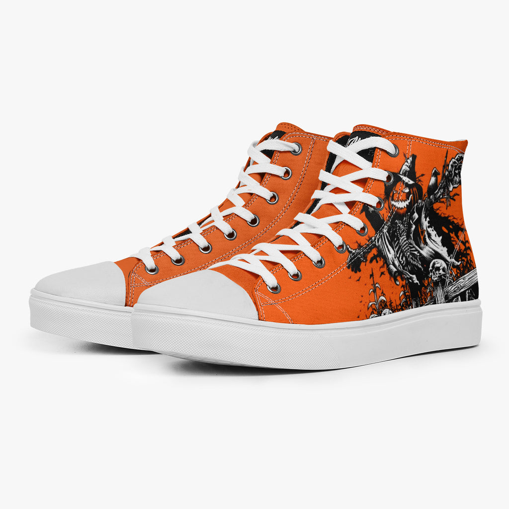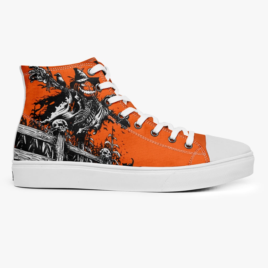Tênis Cano Alto Laranja Espantalho Cabeça de Abóbora Halloween, confeccionado em lona, com cores e estampas exclusivas.