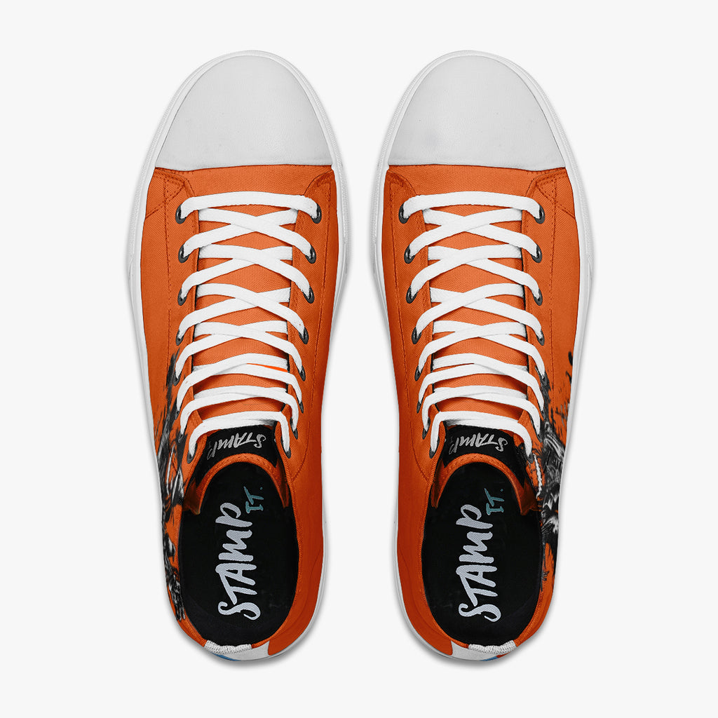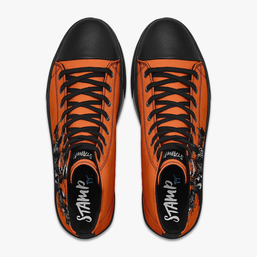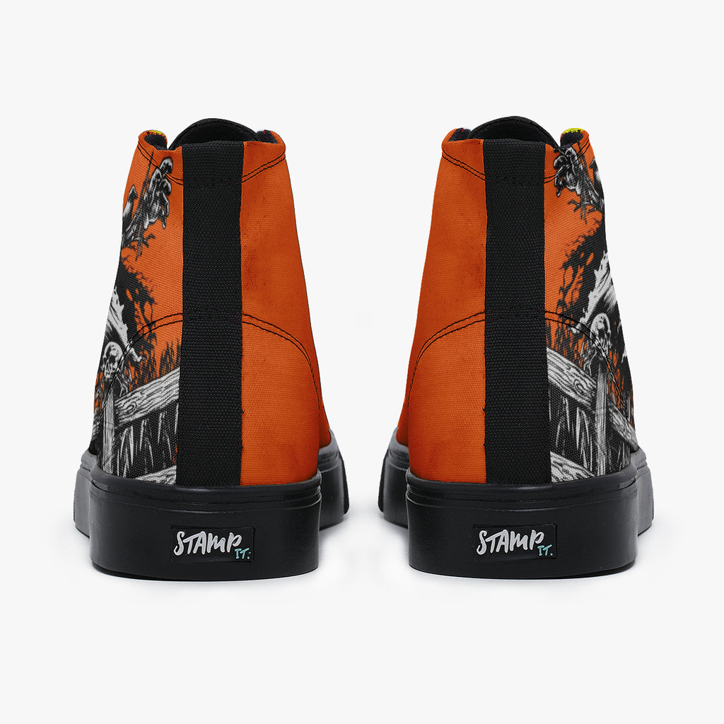 Tênis Cano Alto Laranja Espantalho Cabeça de Abóbora Halloween, confeccionado em lona, com cores e estampas exclusivas.