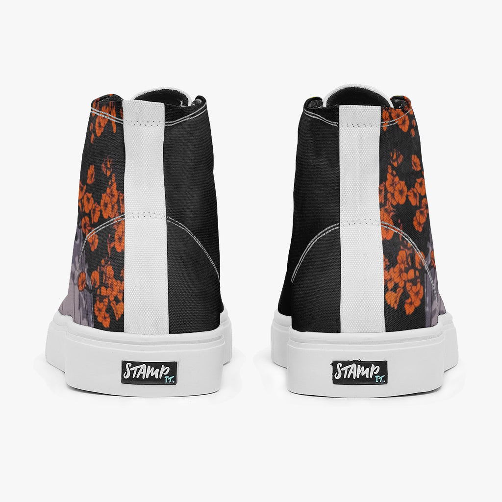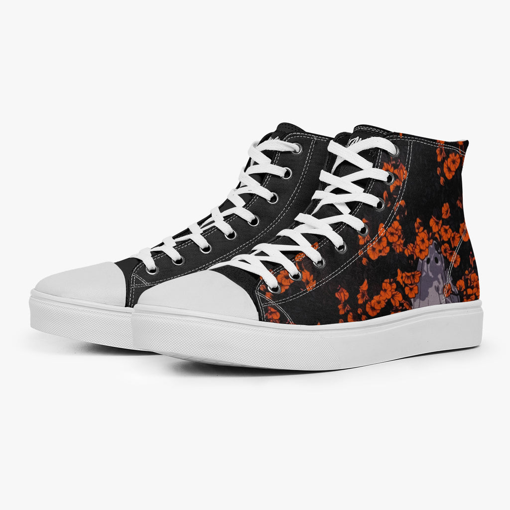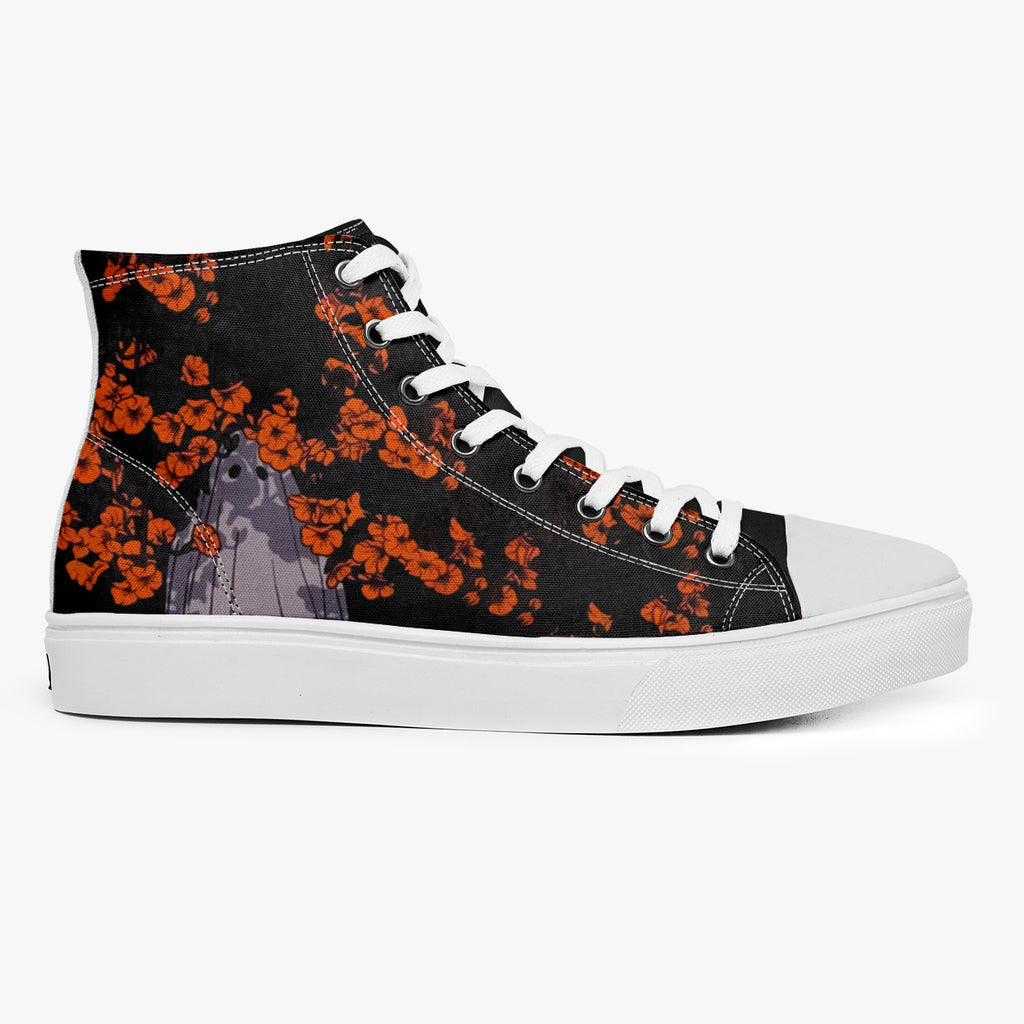Tênis Cano Alto Preto Fantasma de Lençol Terror Halloween, confeccionado em lona, com cores e estampas exclusivas.