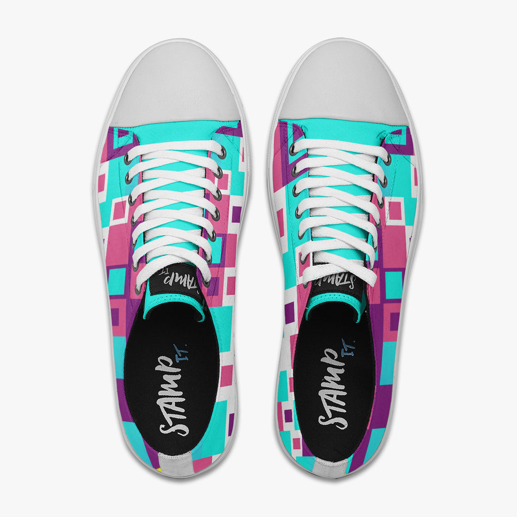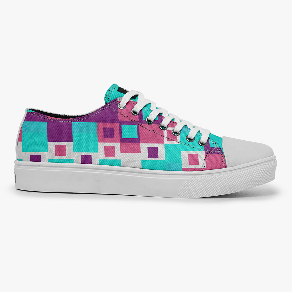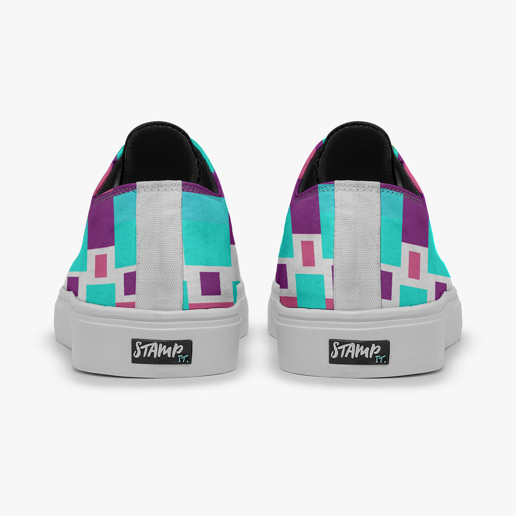Tênis Cano Baixo Azul Formas Geométricas Retas Abstrato, confeccionado em lona, com cores e estampas exclusivas.