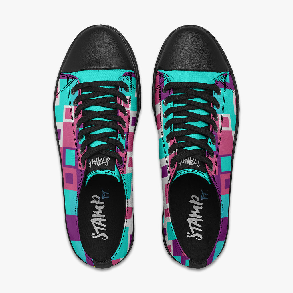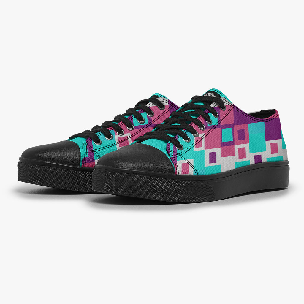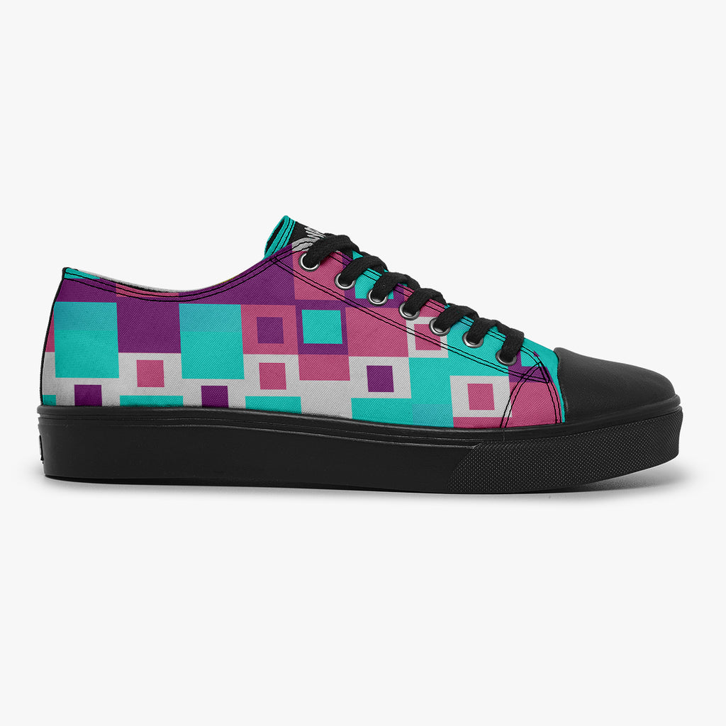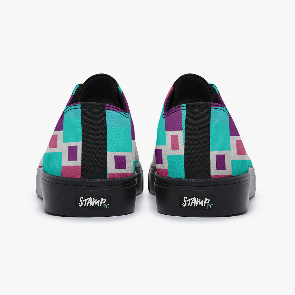 Tênis Cano Baixo Azul Formas Geométricas Retas Abstrato, confeccionado em lona, com cores e estampas exclusivas.