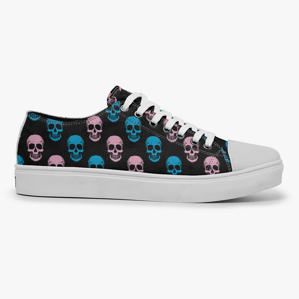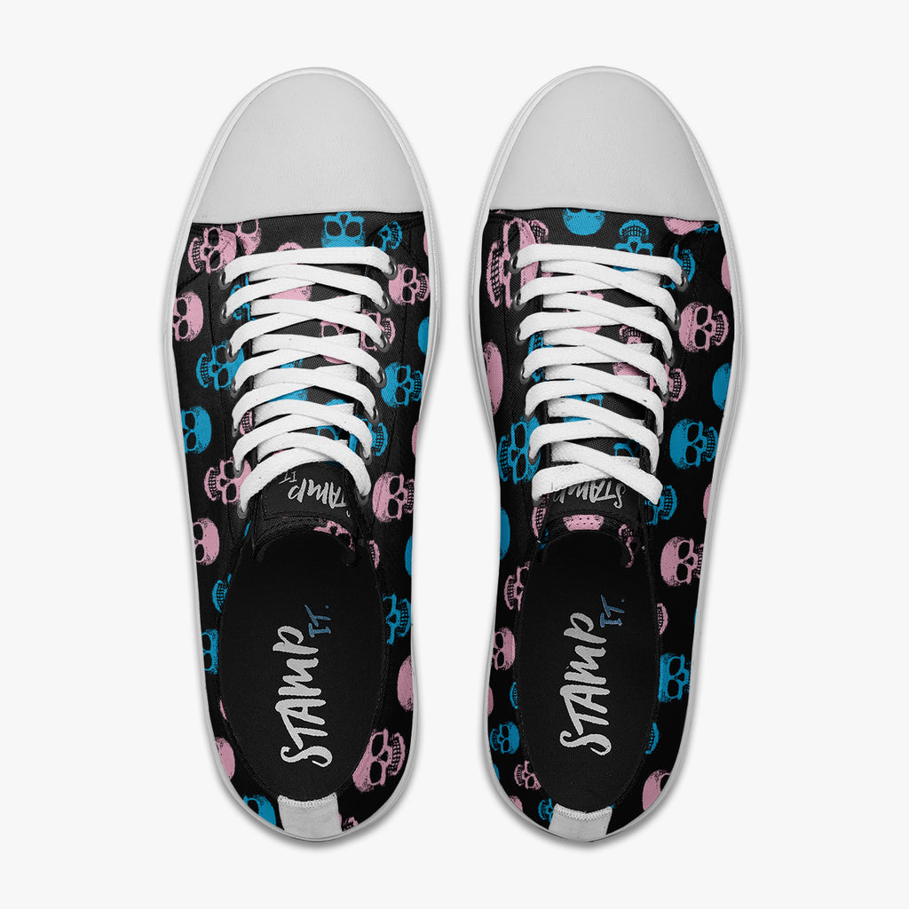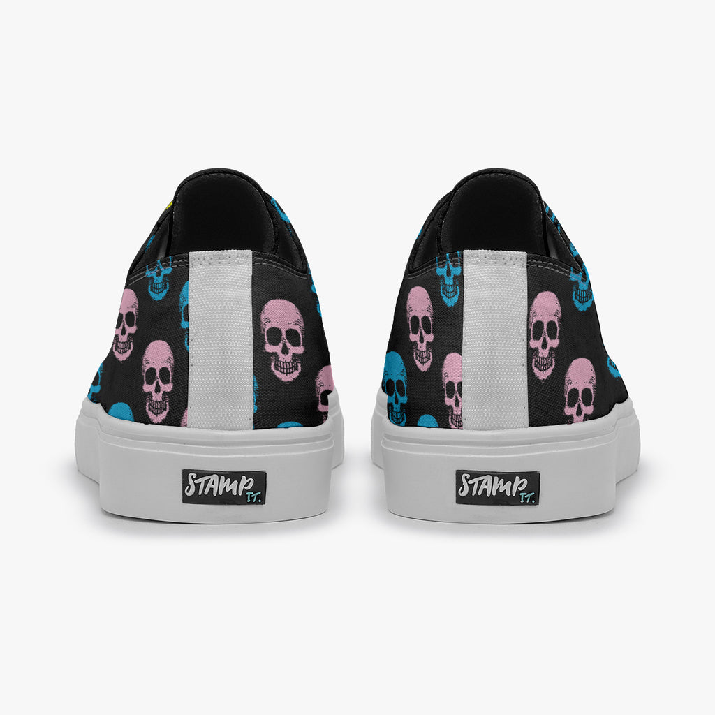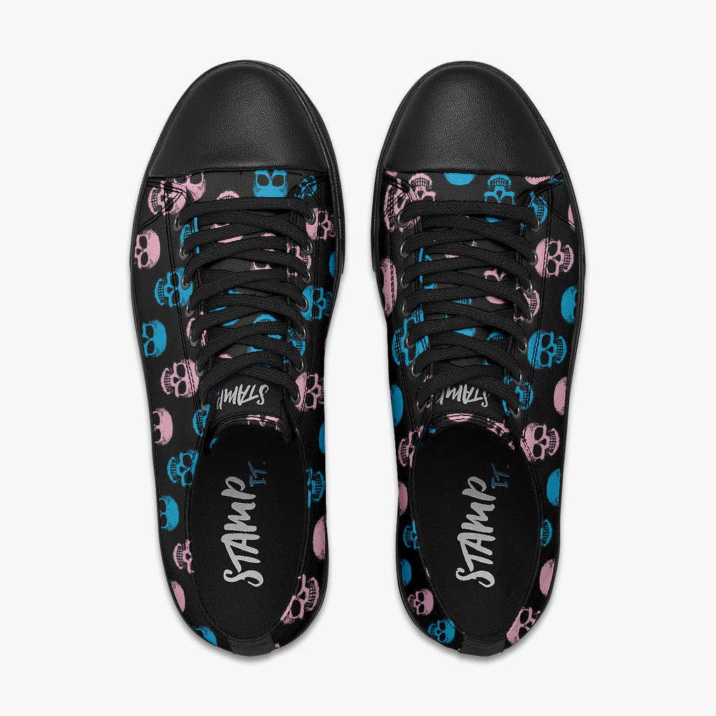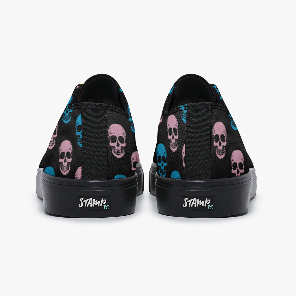 Tênis Cano Baixo Preto Caveiras Coloridas, confeccionado em lona, com cores e estampas exclusivas.