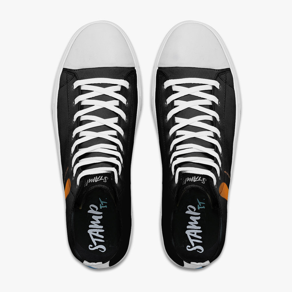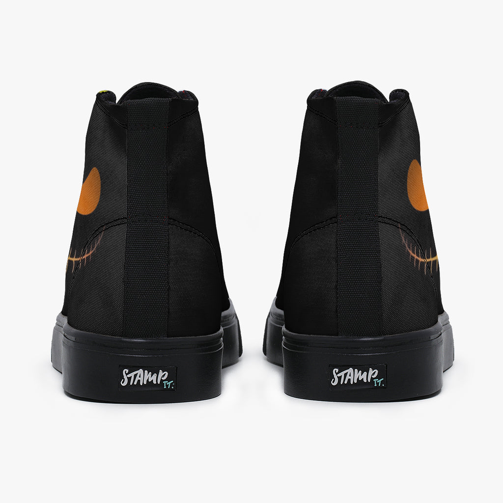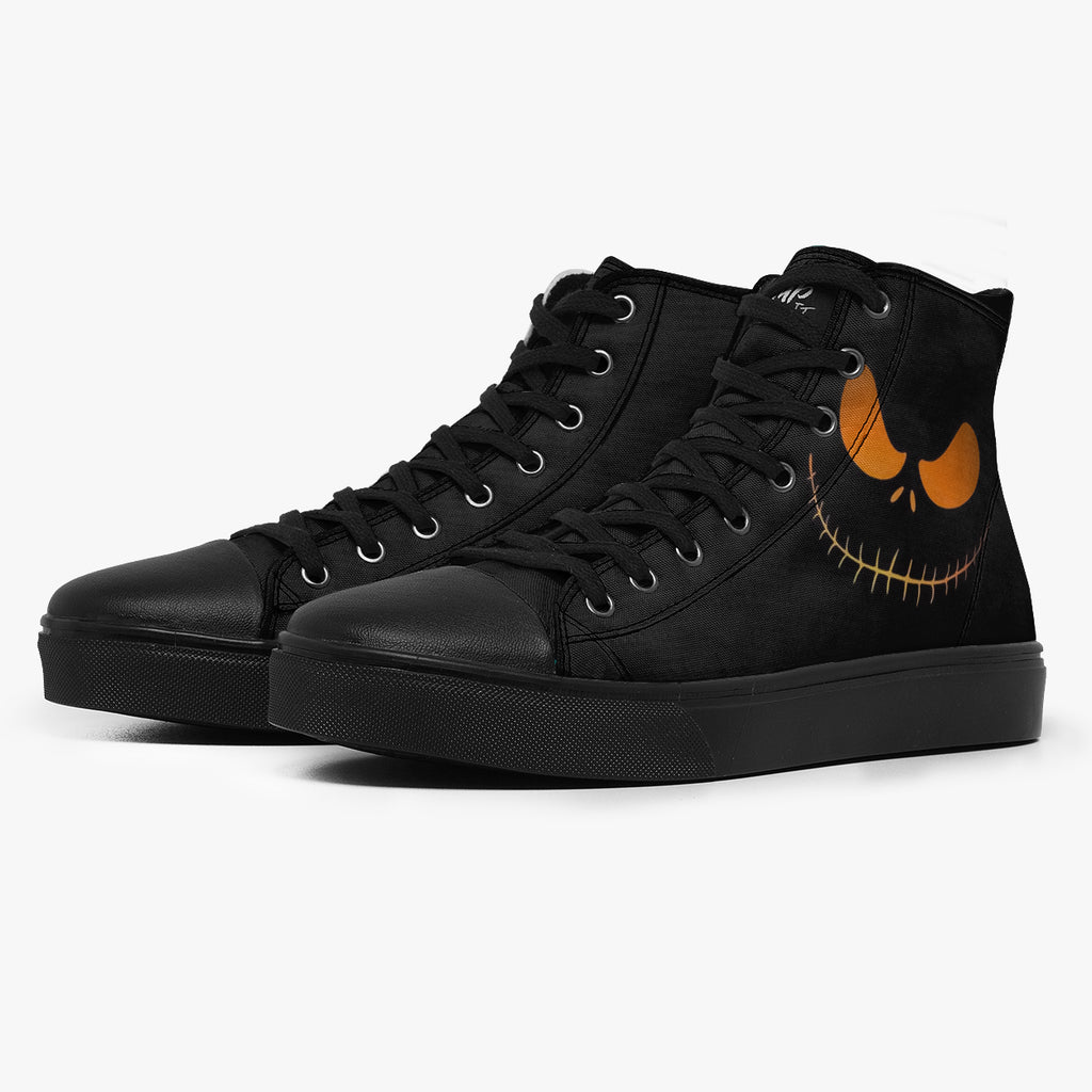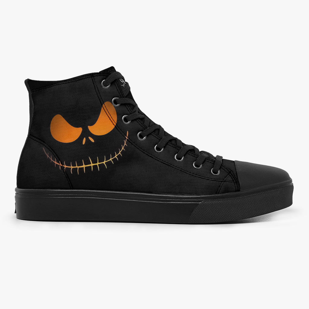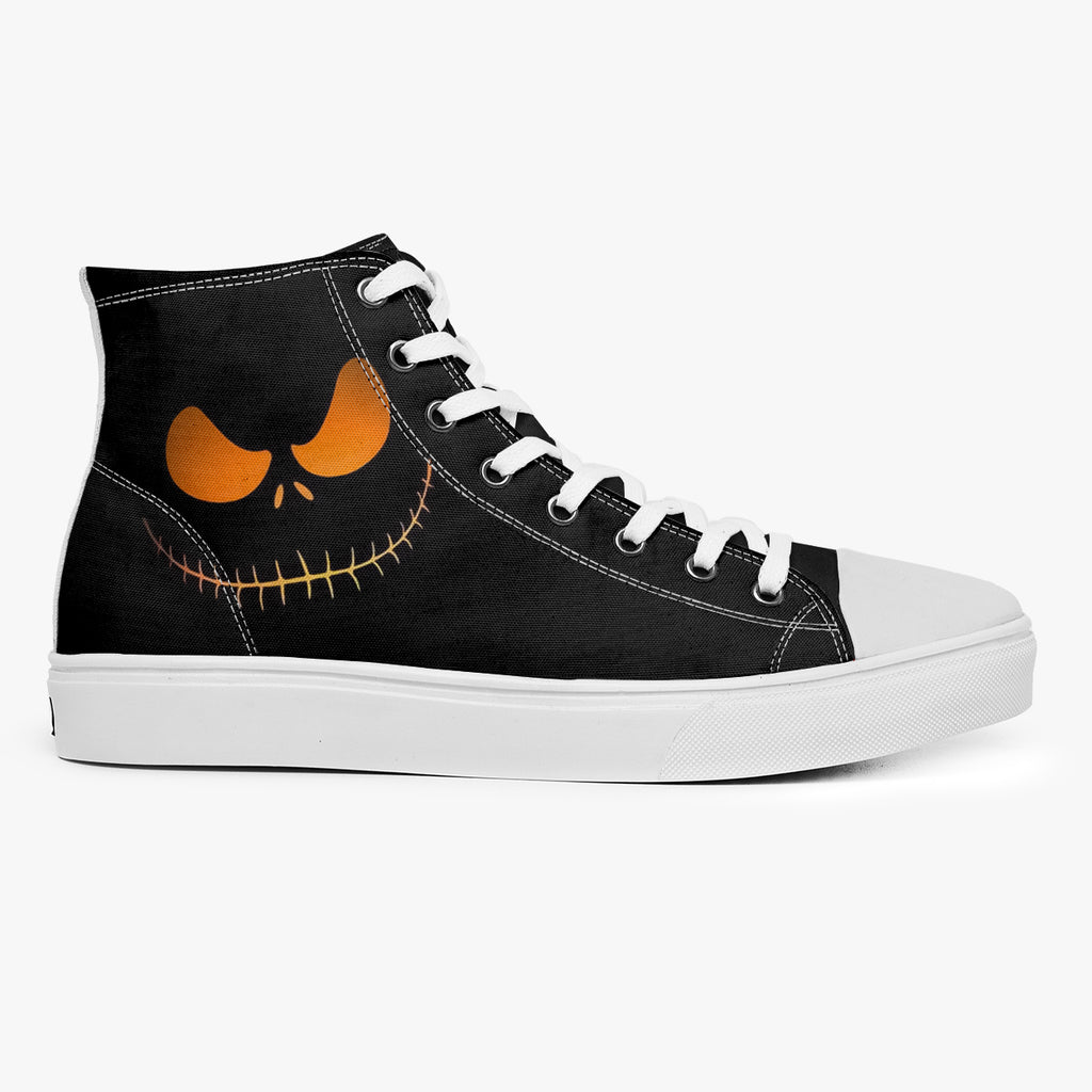 Tênis Cano Alto Preto Jack Skellington Halloween Filmes, confeccionado em lona, com cores e estampas exclusivas.