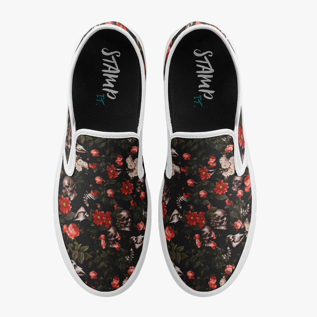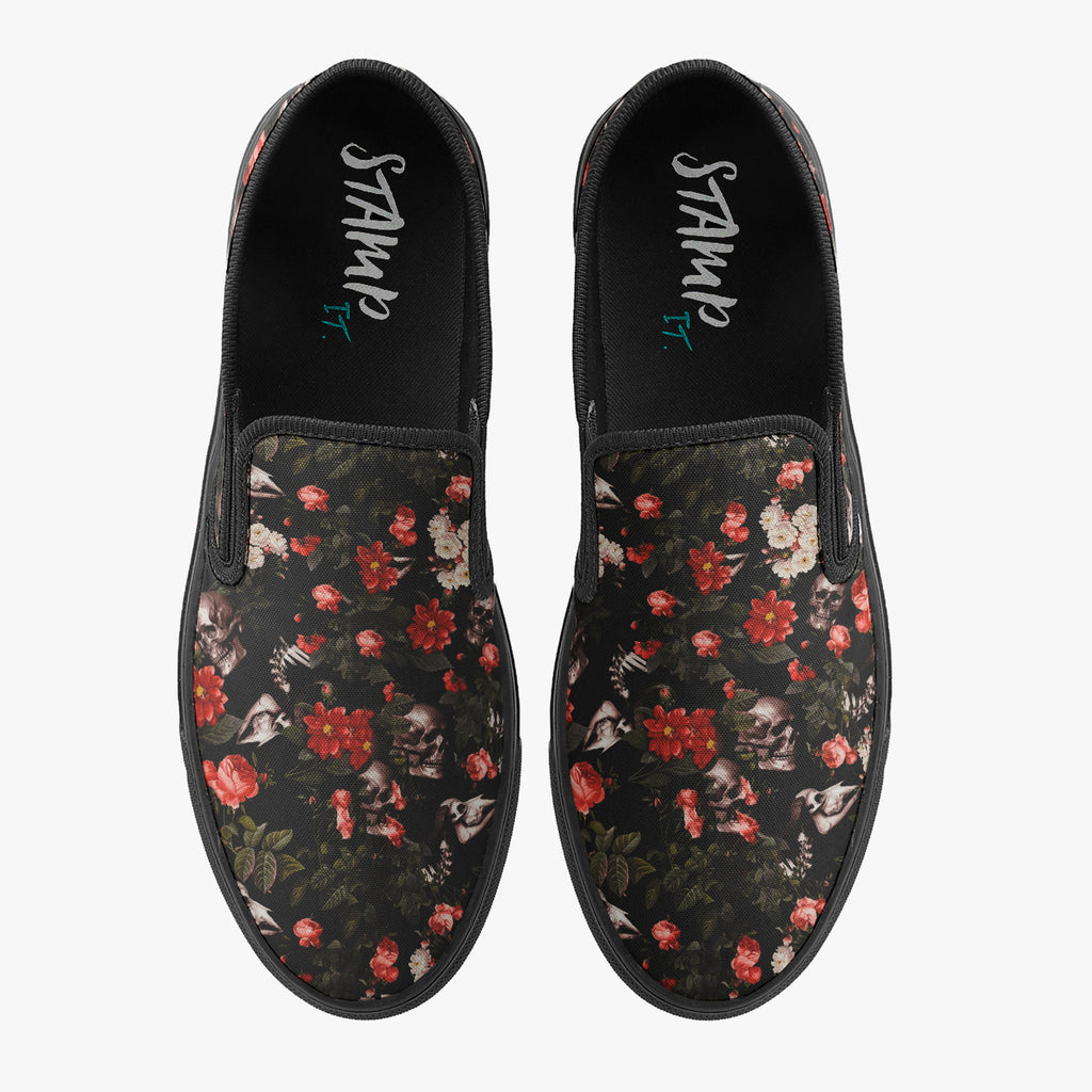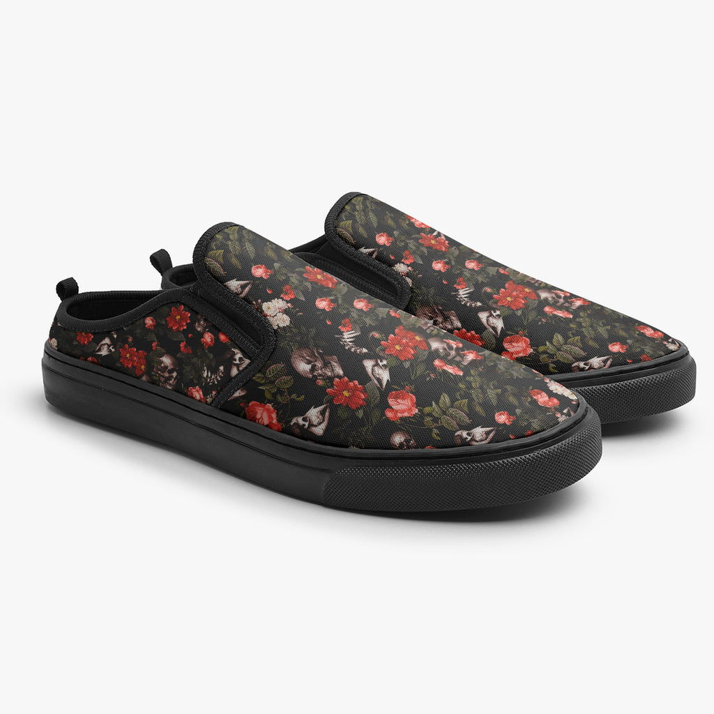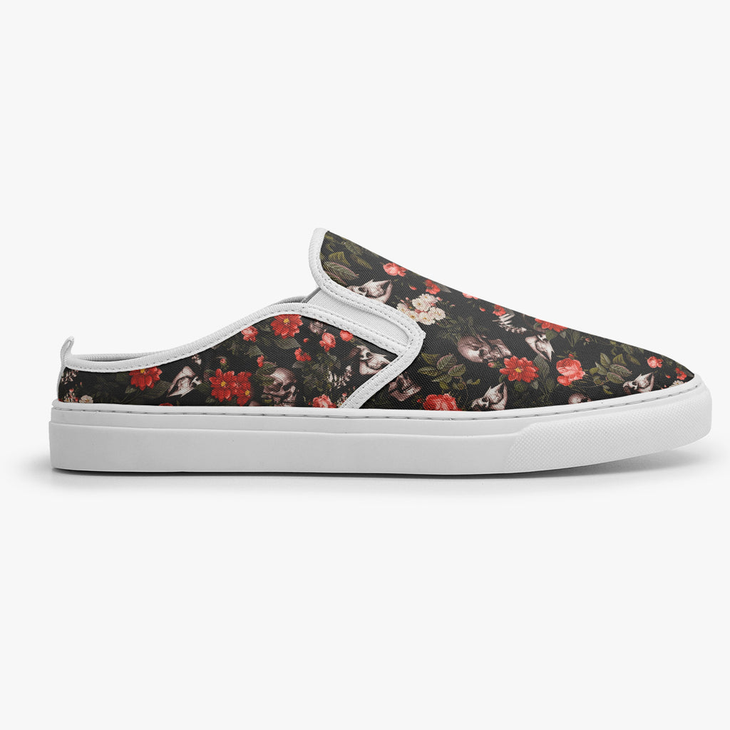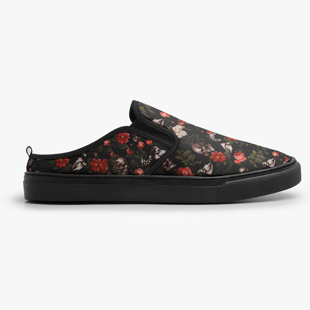 Tênis Mule Preto Caveiras Crânio Flores Caveiras, confeccionado em lona, com cores e estampas exclusivas.