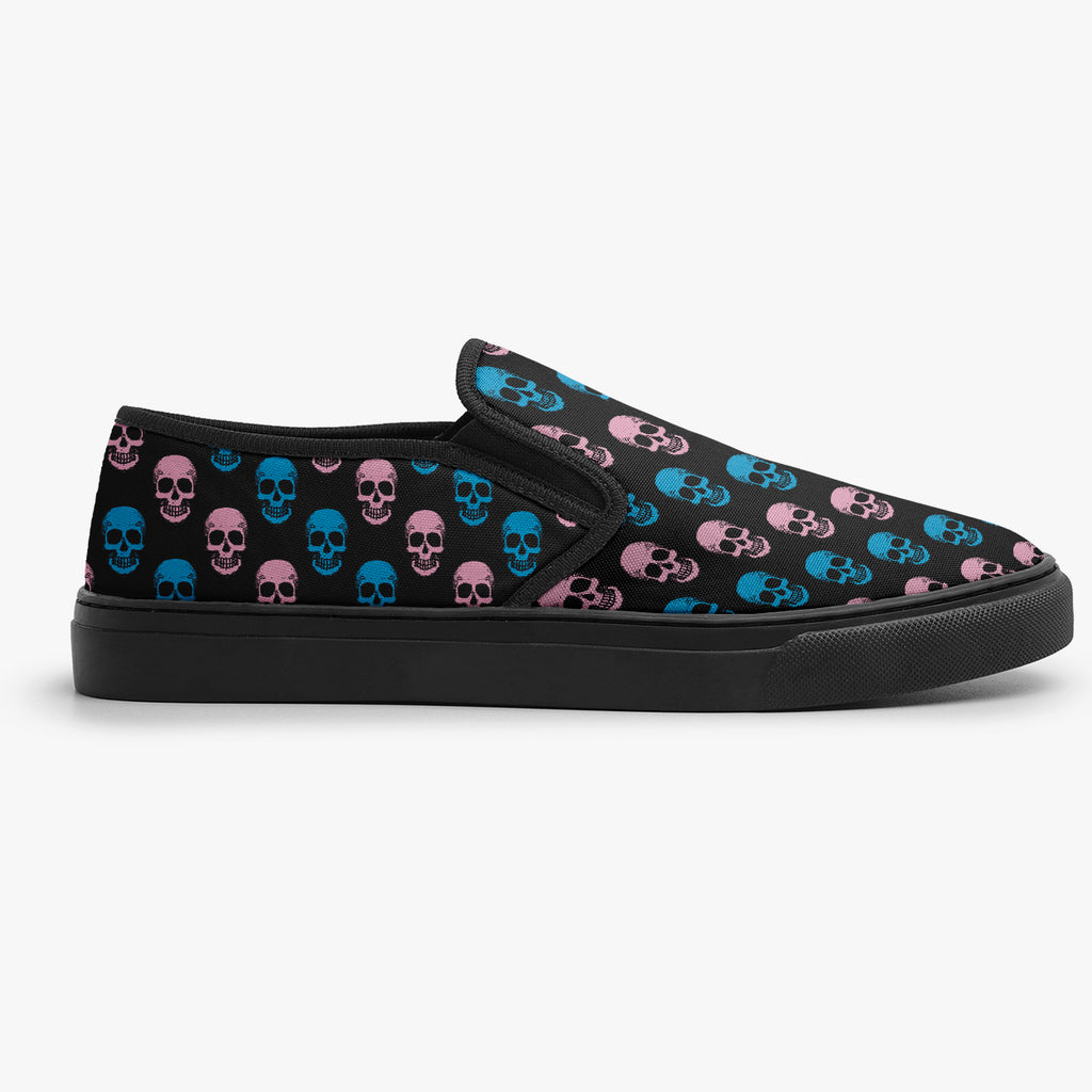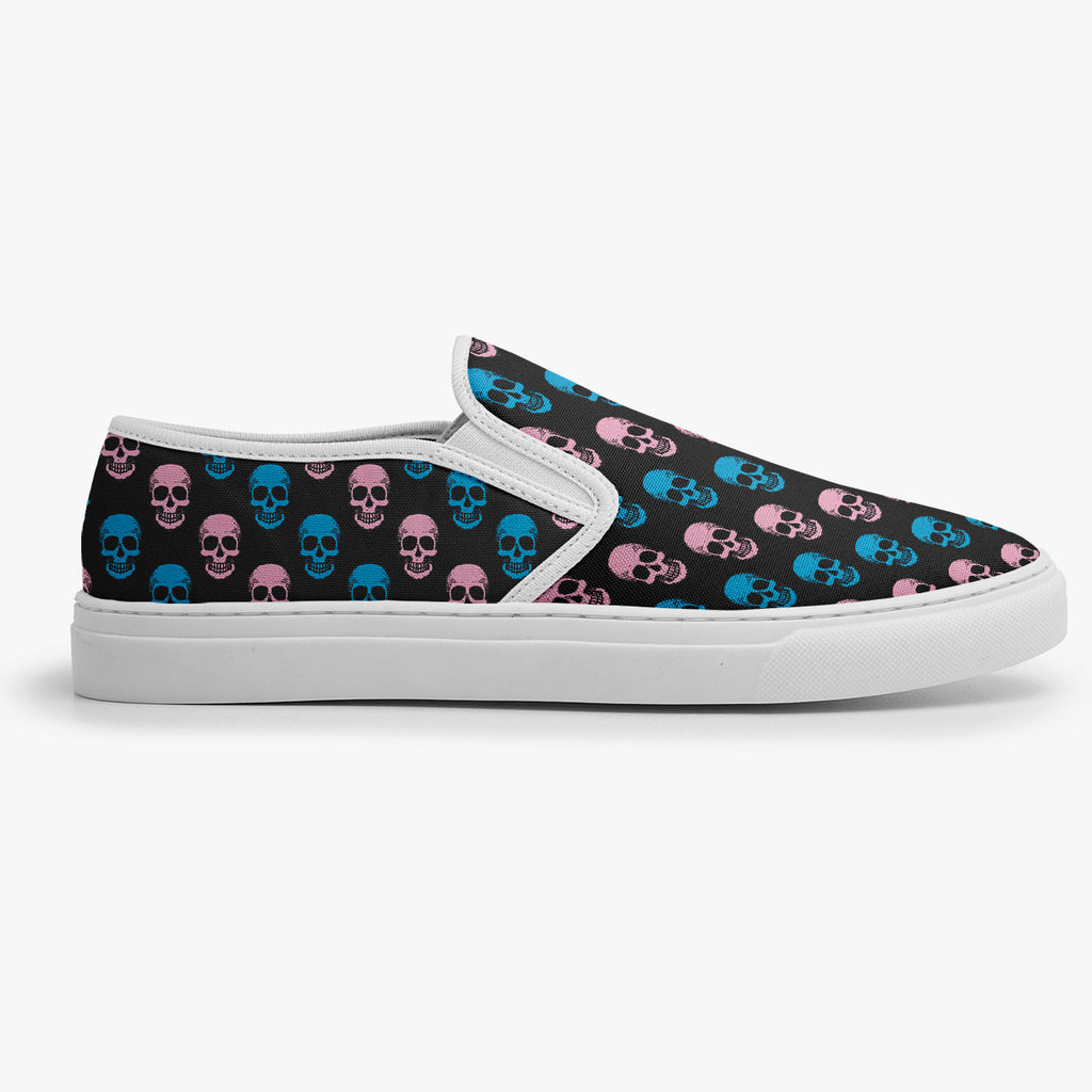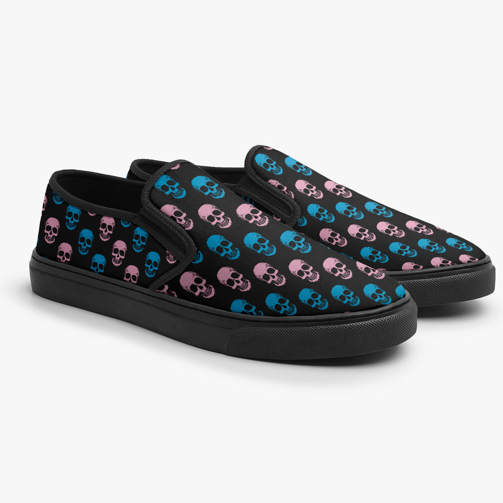 Calçado Slip On Preto Caveiras Coloridas, confeccionado em lona, com cores e estampas exclusivas.