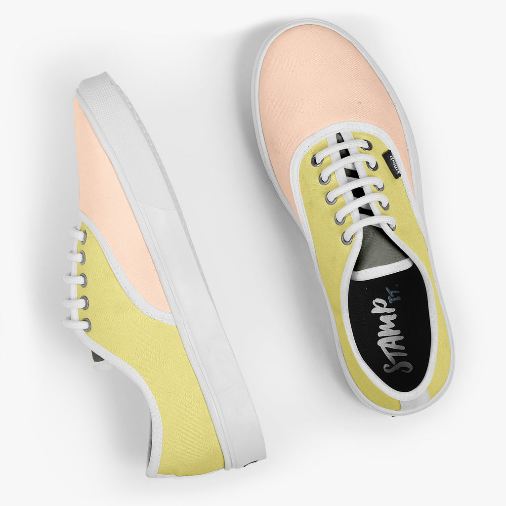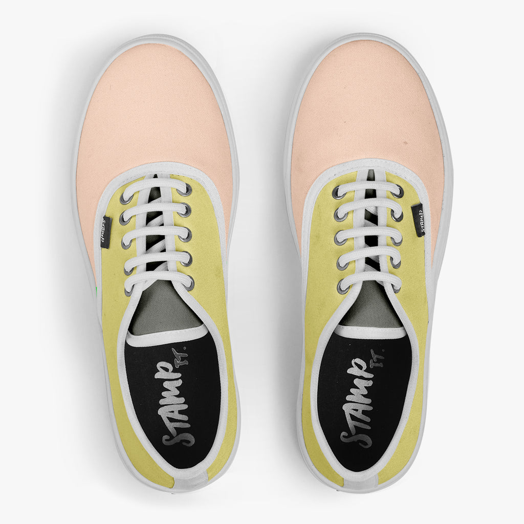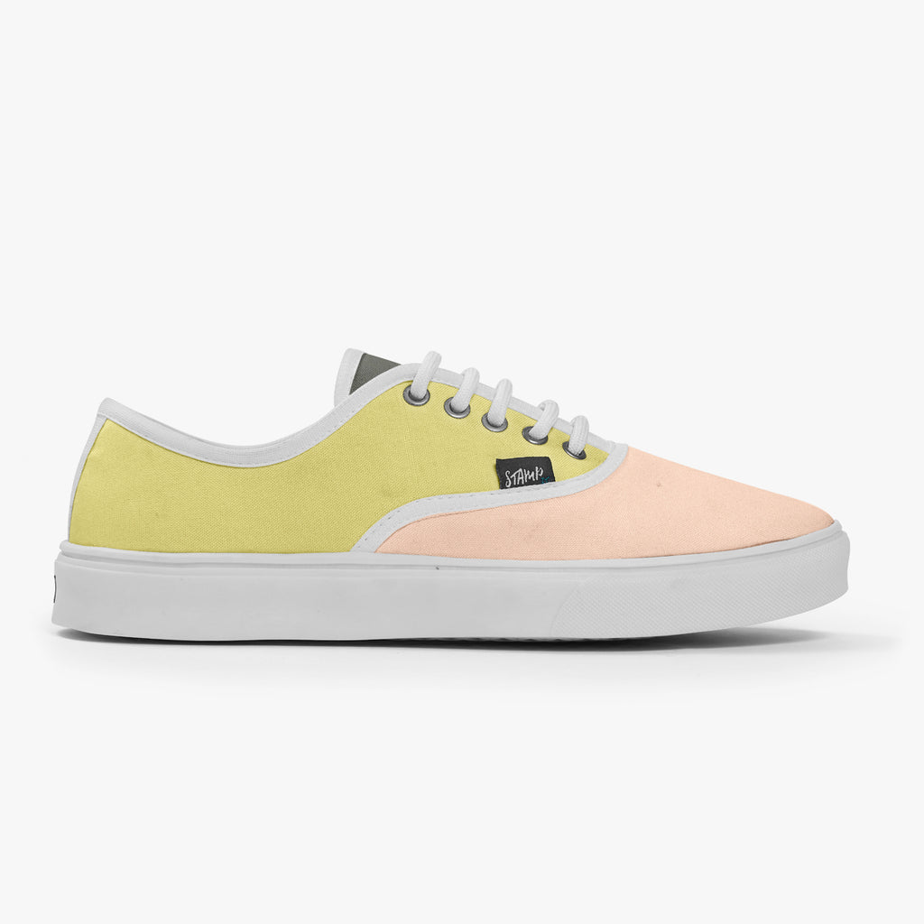 Tênis Casual Unissex Bege Amarelo e Cinza Colors, confeccionado em lona, com cores e estampas exclusivas.