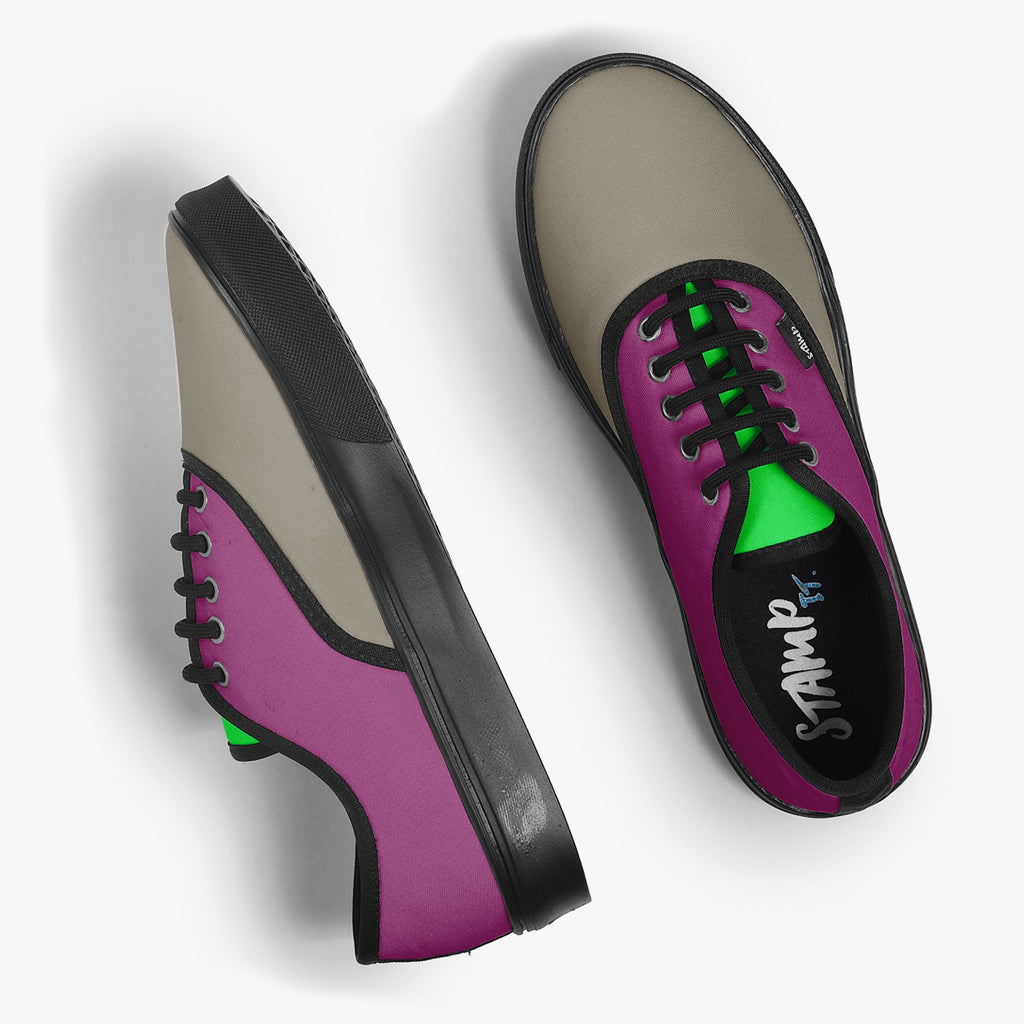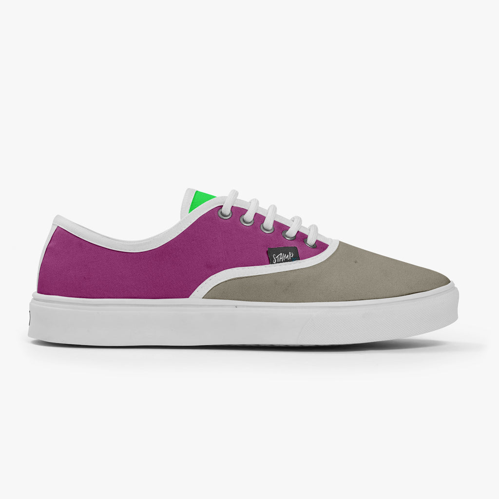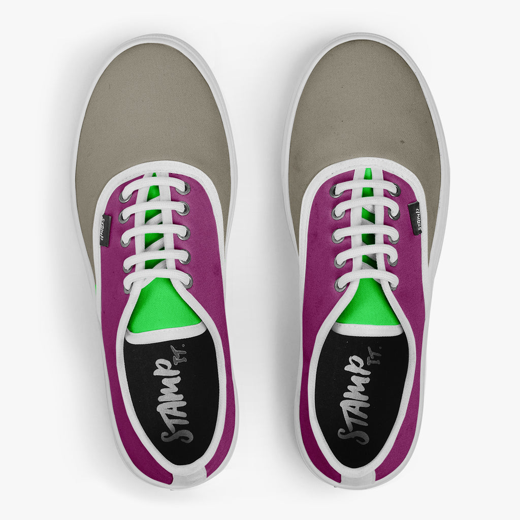 Tênis Casual Unissex Cinza Vinho e Verde Colors, confeccionado em lona, com cores e estampas exclusivas.