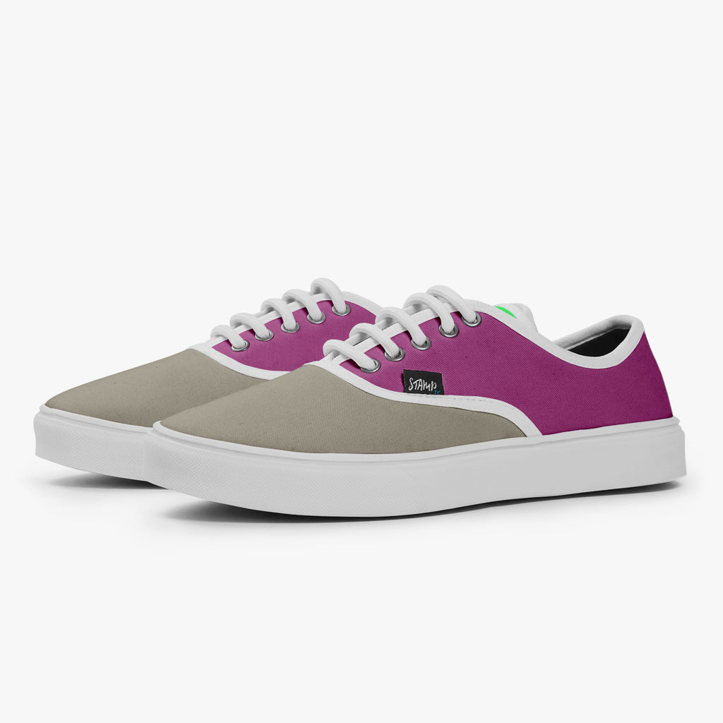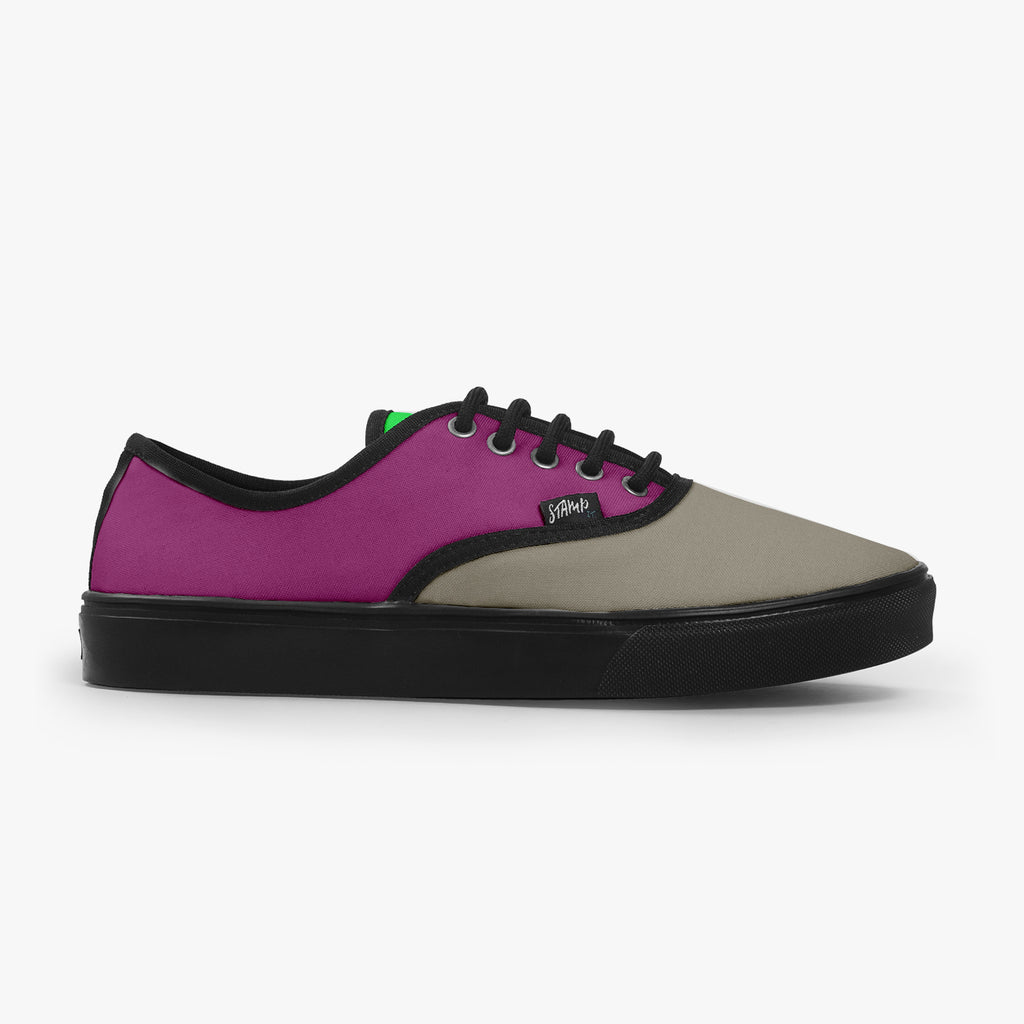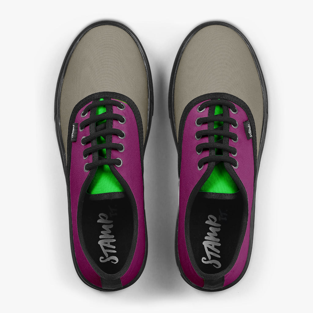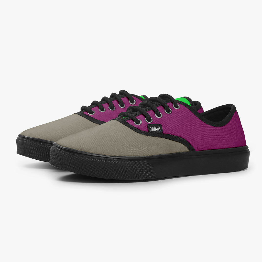 Tênis Casual Unissex Cinza Vinho e Verde Colors, confeccionado em lona, com cores e estampas exclusivas.