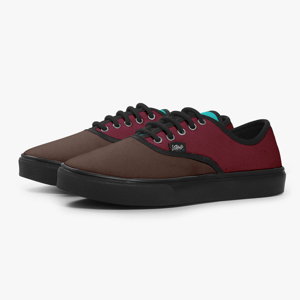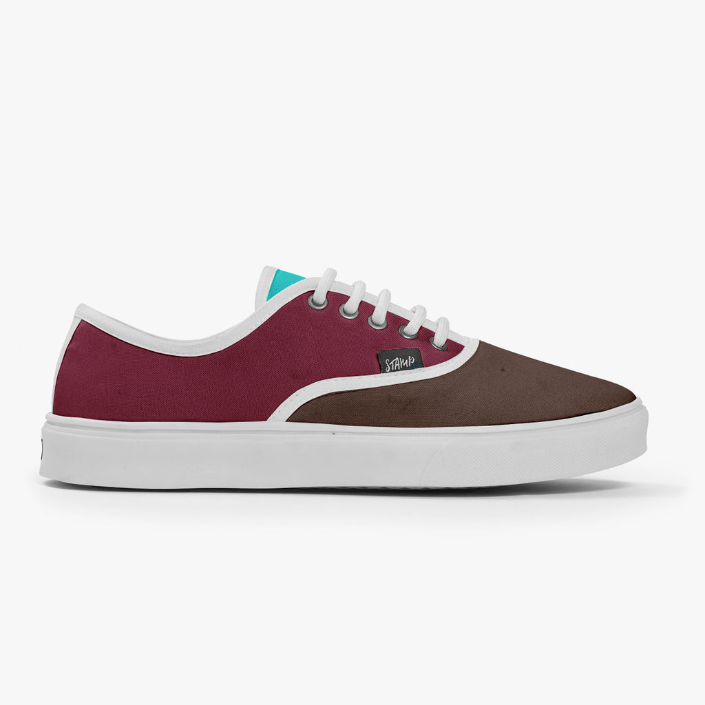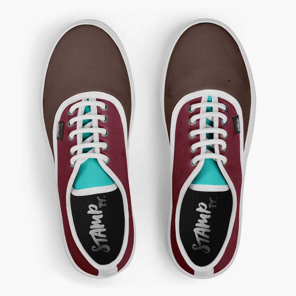 Tênis Casual Unissex Marrom Barro Vinho e Azul Colors, confeccionado em lona, com cores e estampas exclusivas.