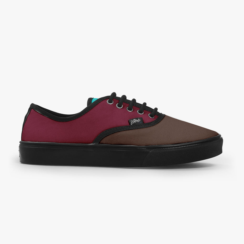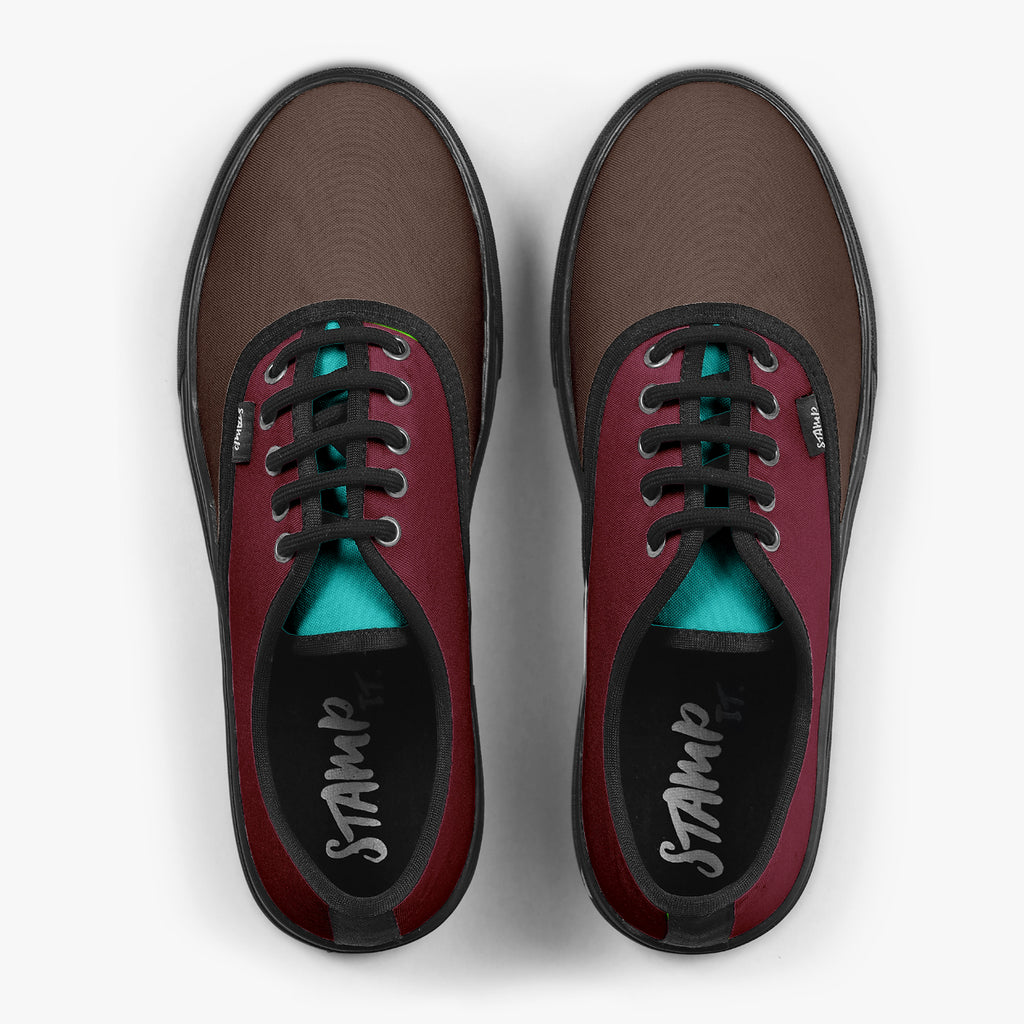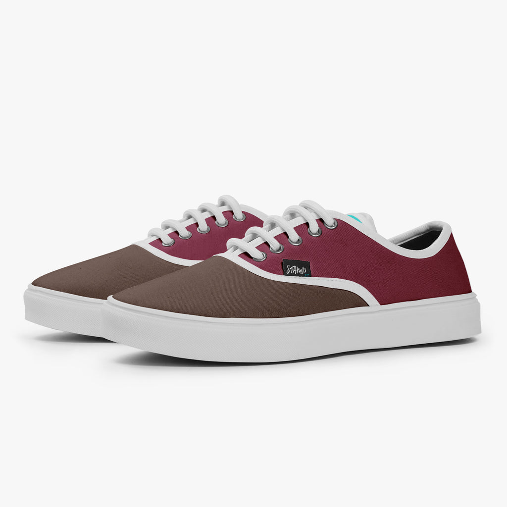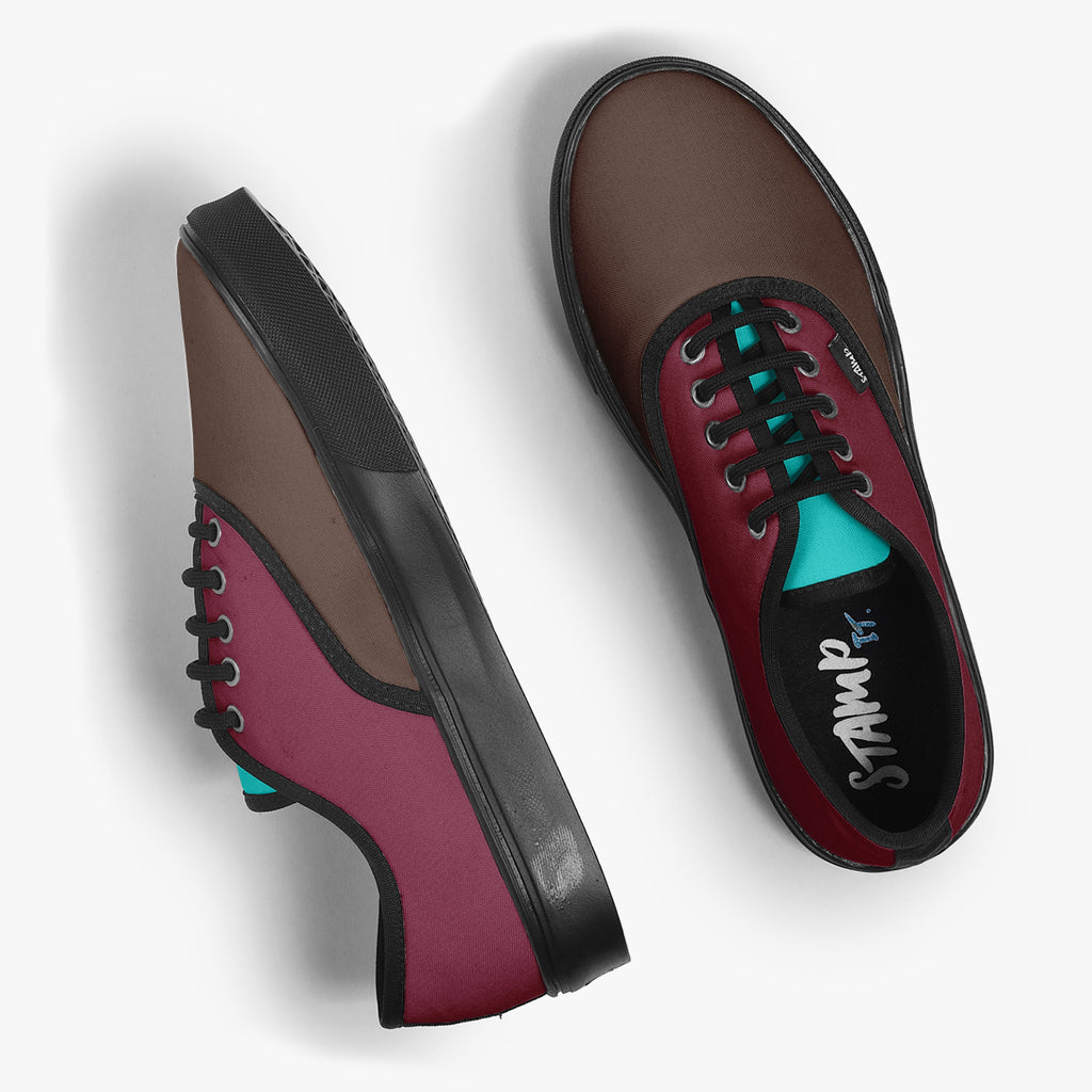 Tênis Casual Unissex Marrom Barro Vinho e Azul Colors, confeccionado em lona, com cores e estampas exclusivas.