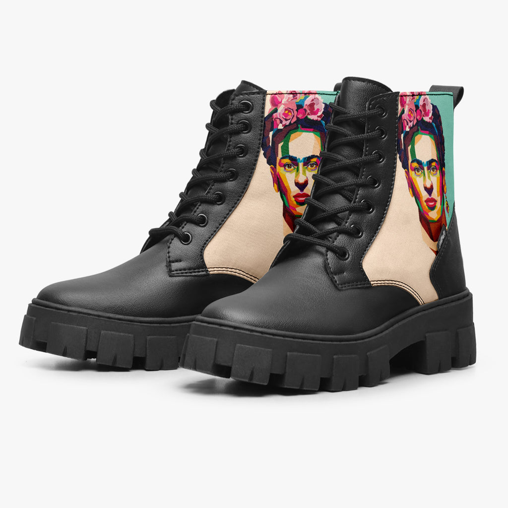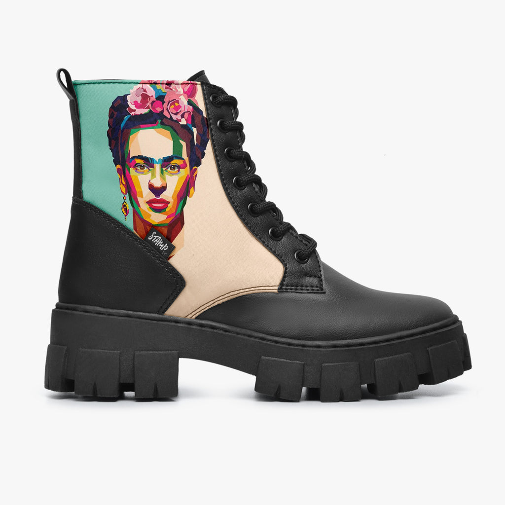 Bota Coturno Tratorada Cano Médio Arte Frida Kahlo Cubista Dual Color Azul e Creme Cultura e Arte