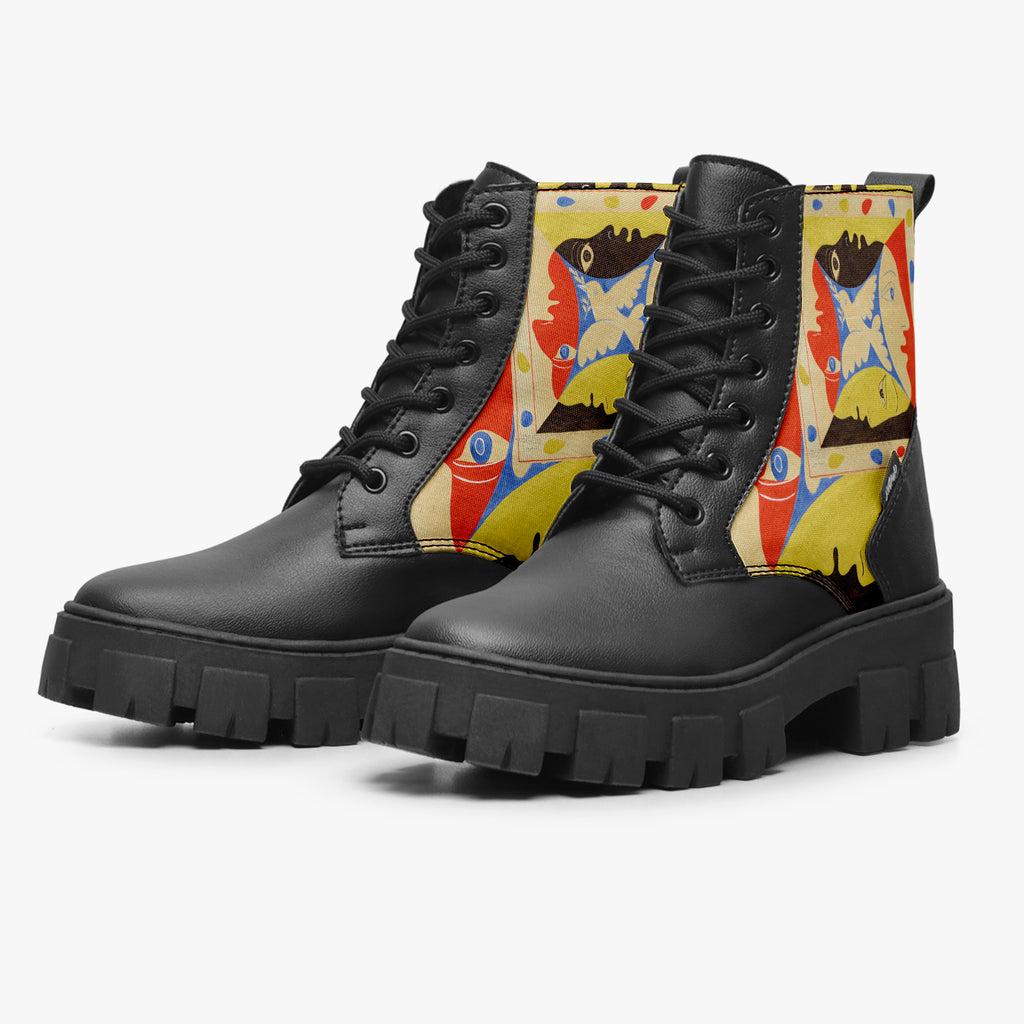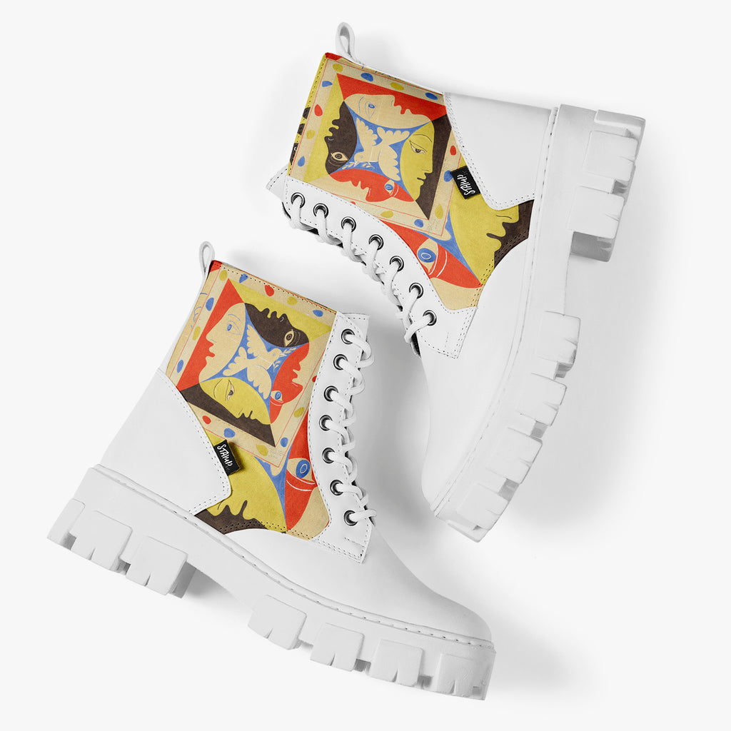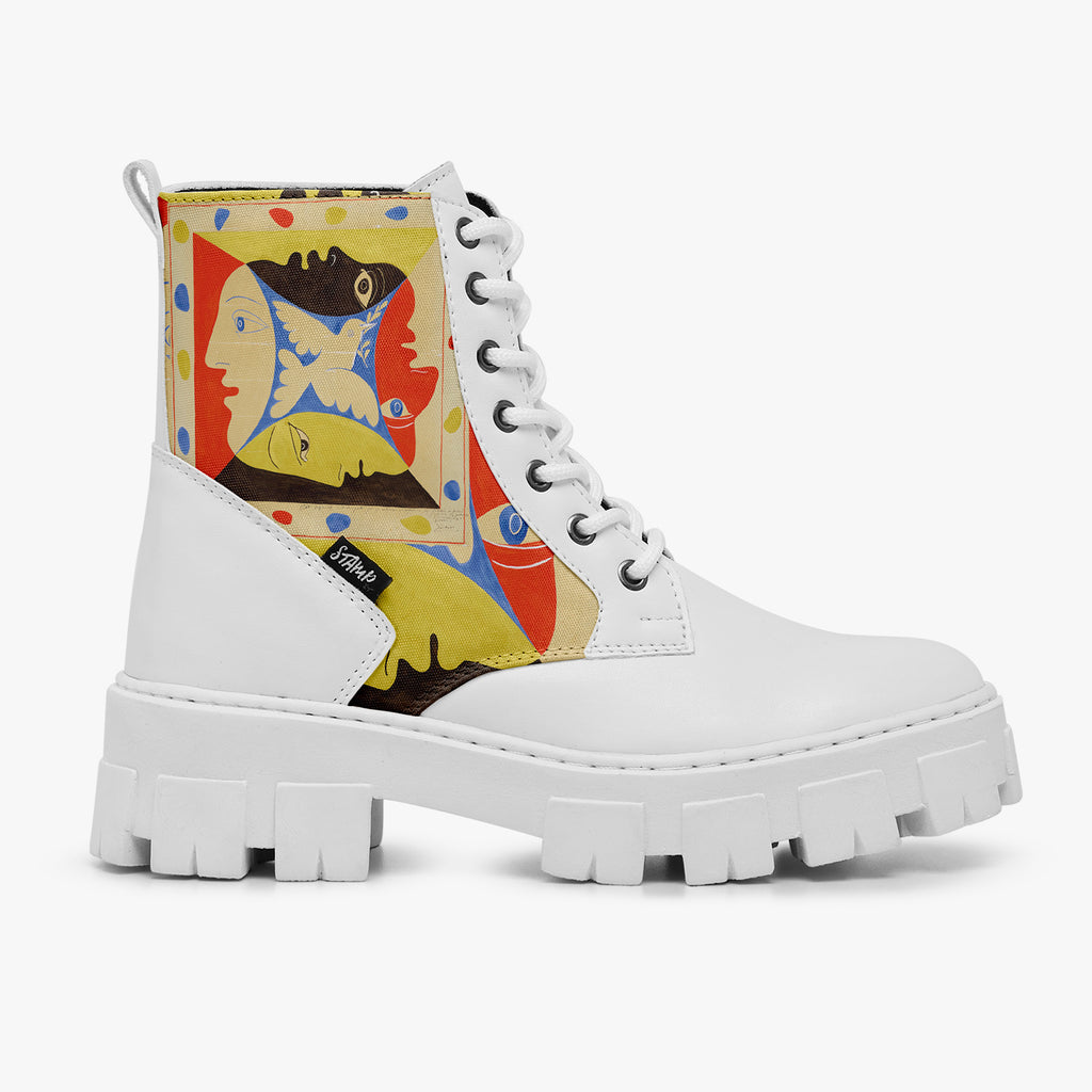 Bota Coturno Tratorada Cano Médio Picasso Les Quatre Visages Cultura e Arte, confeccionado em lona e couro sintético com cores e estampas exclusivas.