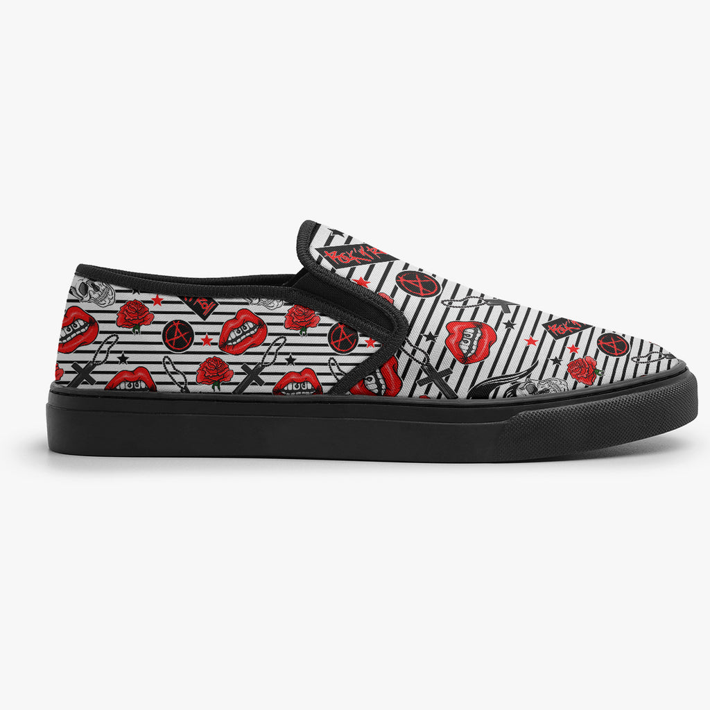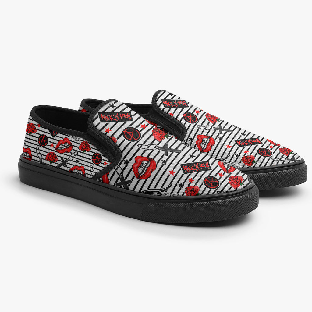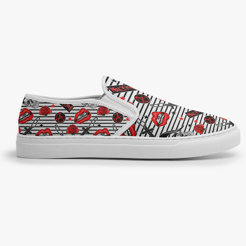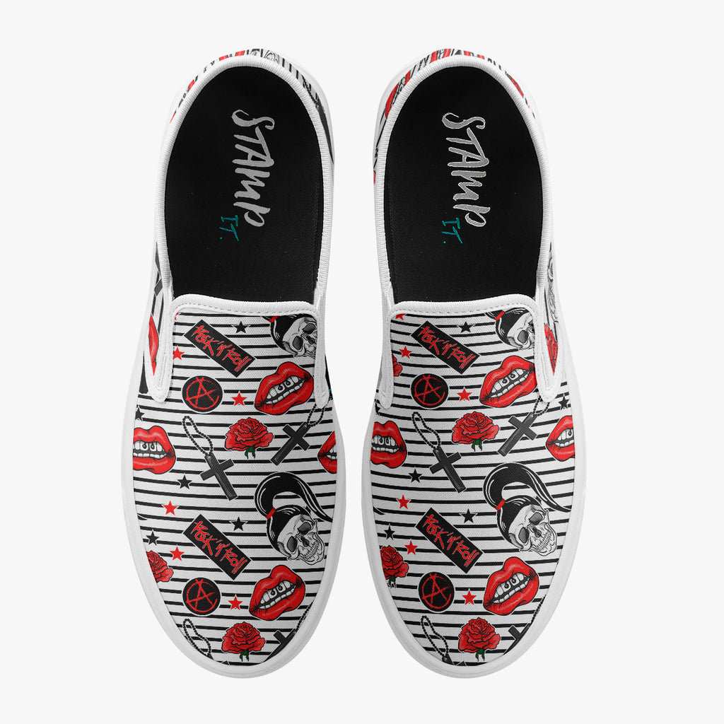 Calçado Slip On Branco Rock And Roll Cultura e Arte, confeccionado em lona, com cores e estampas exclusivas.
