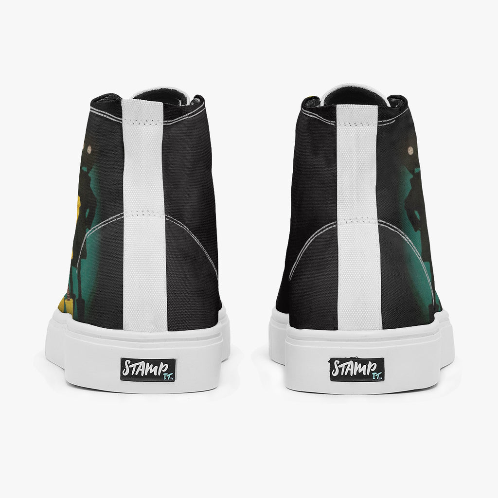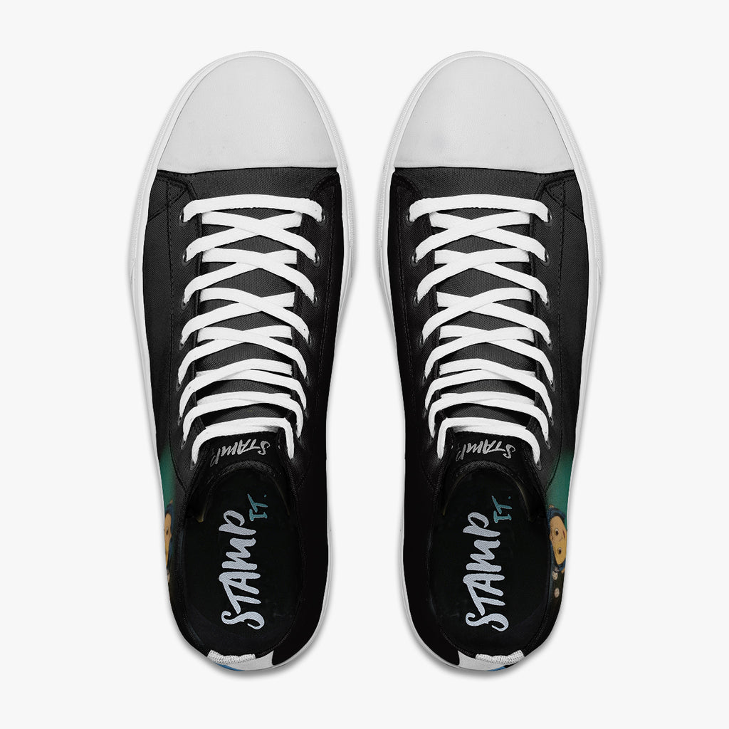 Tênis Cano Alto Preto Coraline e o Mundo Secreto Filmes, confeccionado em lona, com cores e estampas exclusivas.