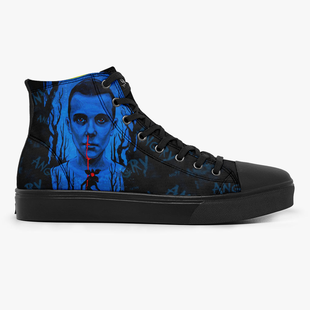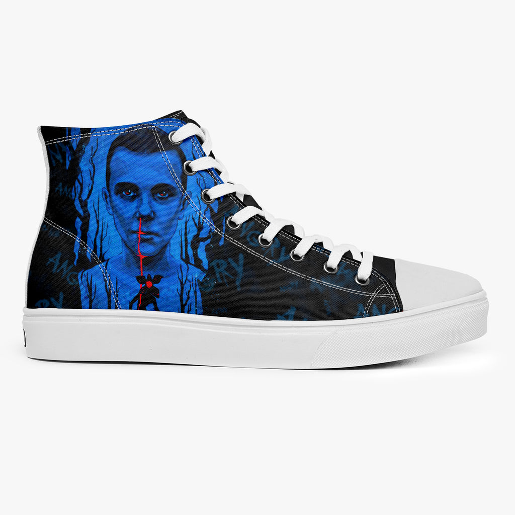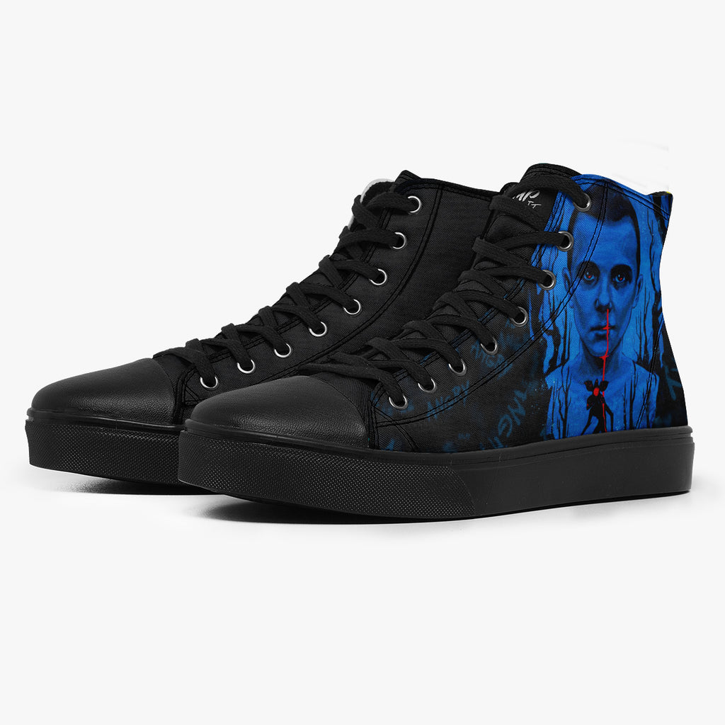 Tênis Cano Alto Preto Stranger Things Eleven Bleeding Séries e Filmes, confeccionado em lona, com cores e estampas exclusivas.