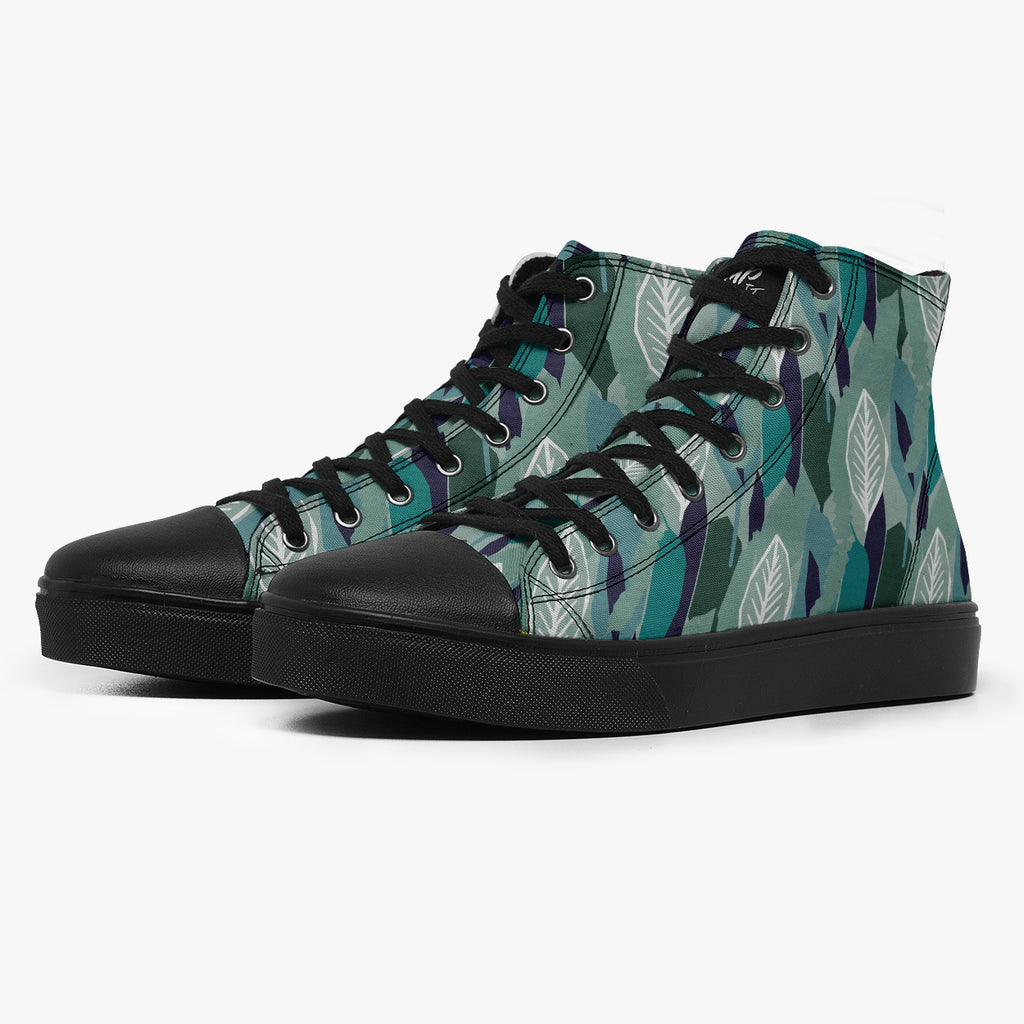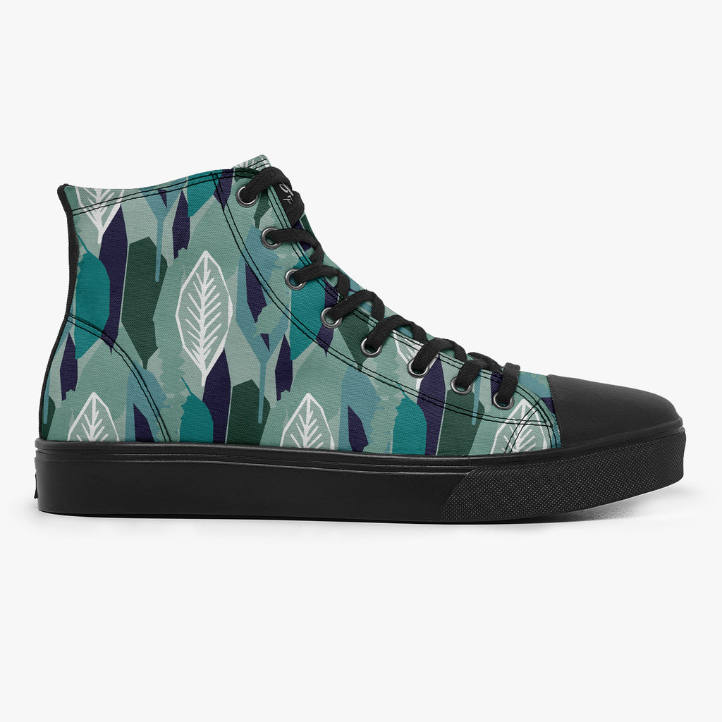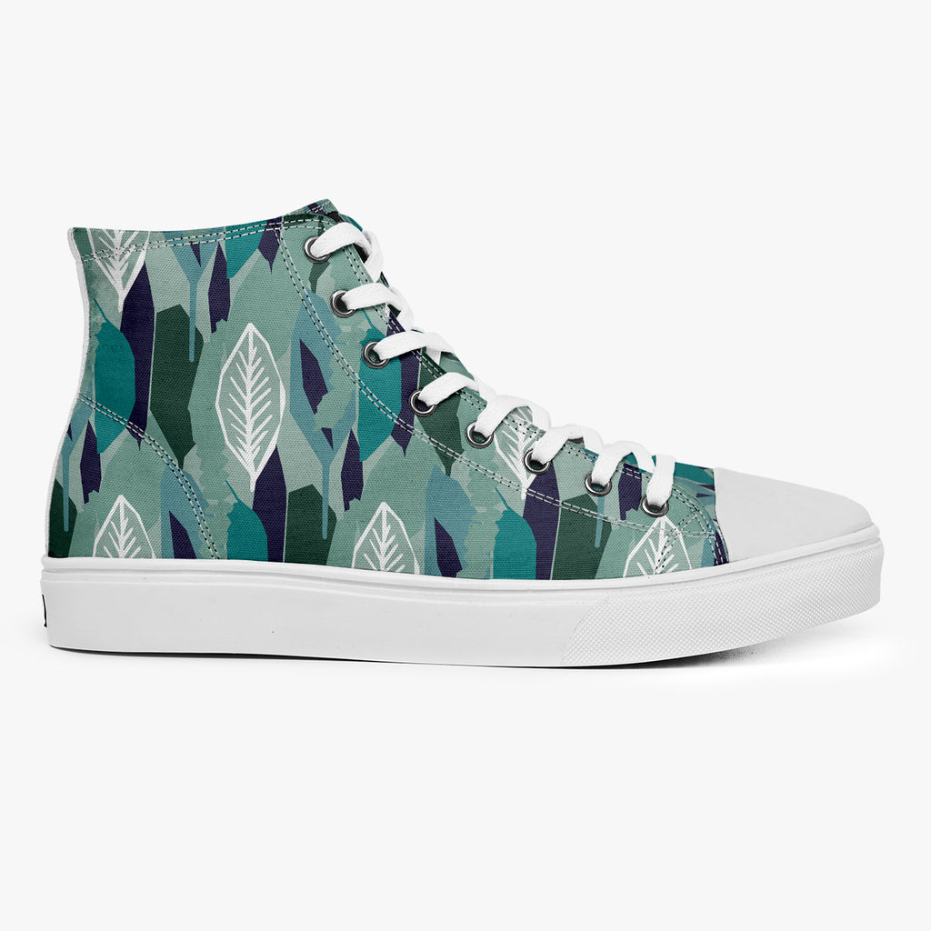 Tênis Cano Alto Tons de Azul Folhas Lisas Flores e Folhas, confeccionado em lona, com cores e estampas exclusivas.