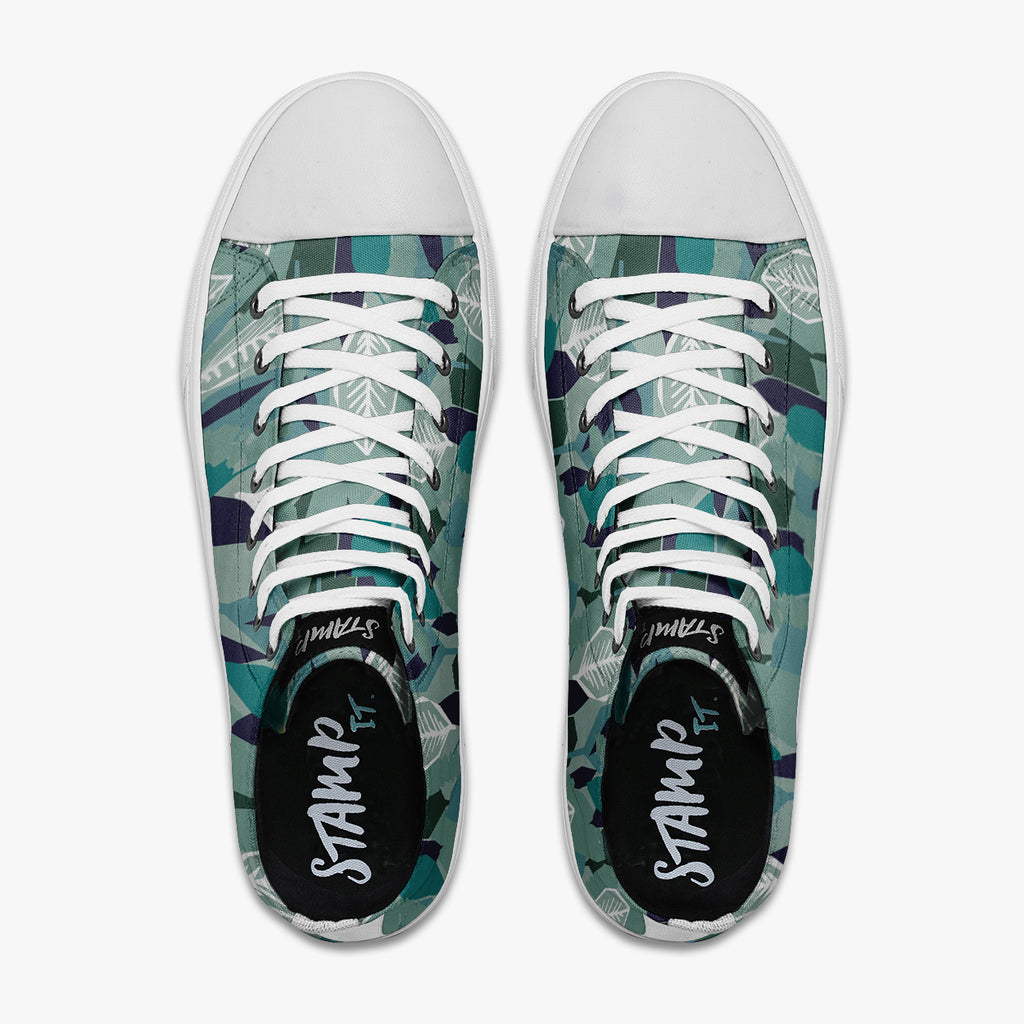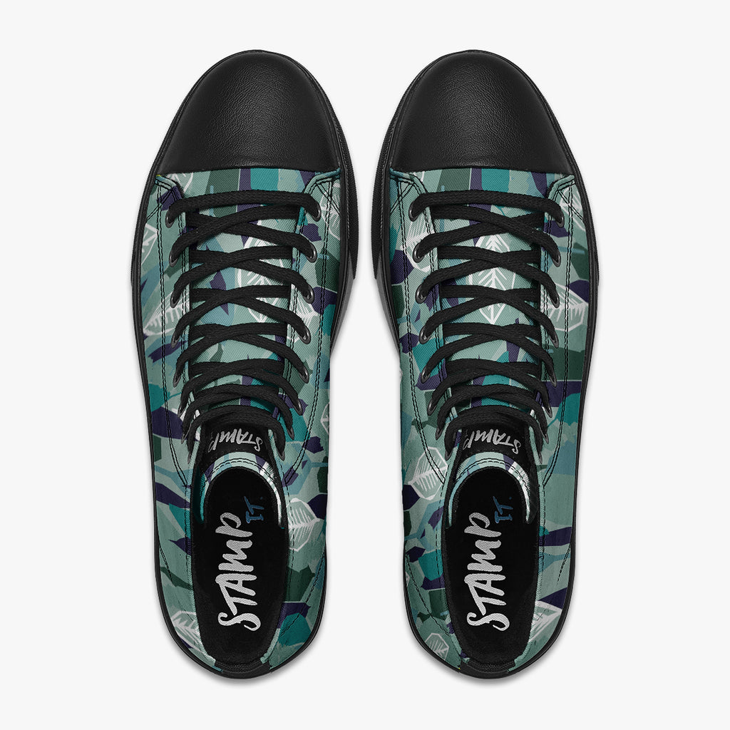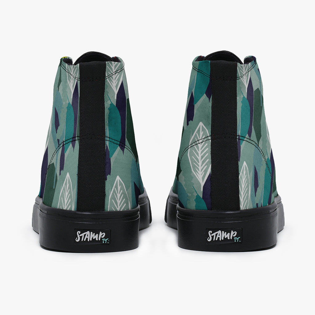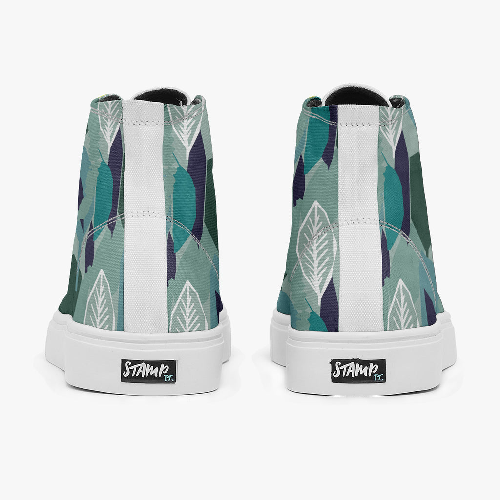 Tênis Cano Alto Tons de Azul Folhas Lisas Flores e Folhas, confeccionado em lona, com cores e estampas exclusivas.