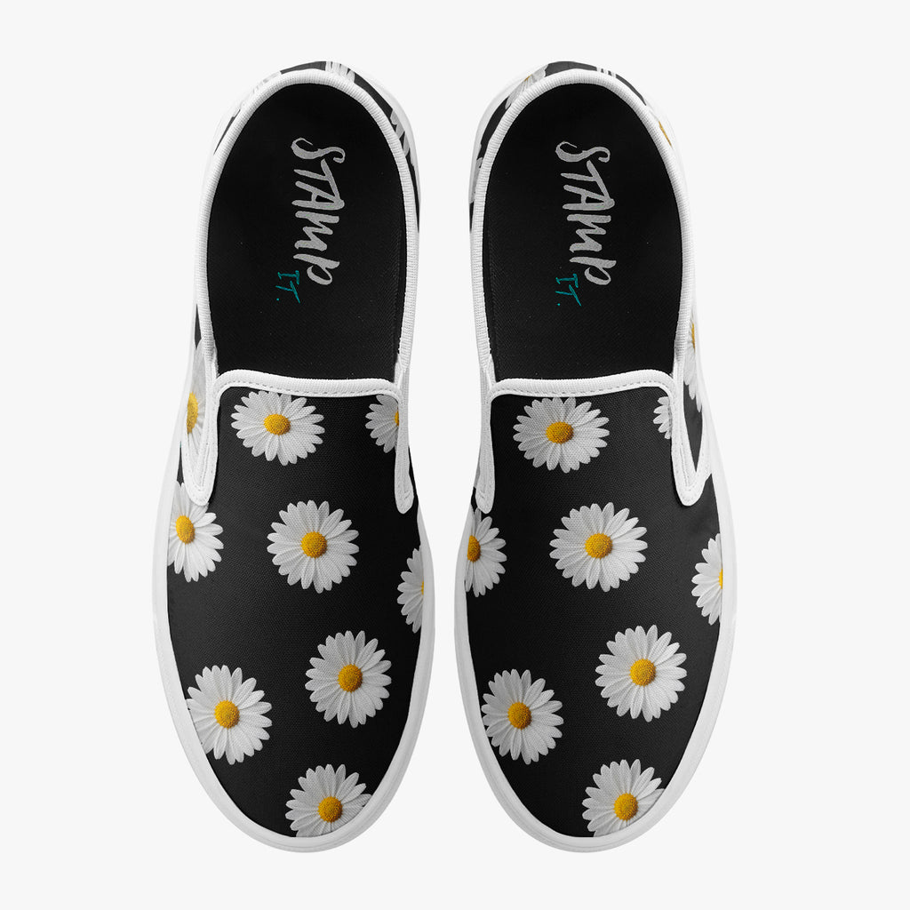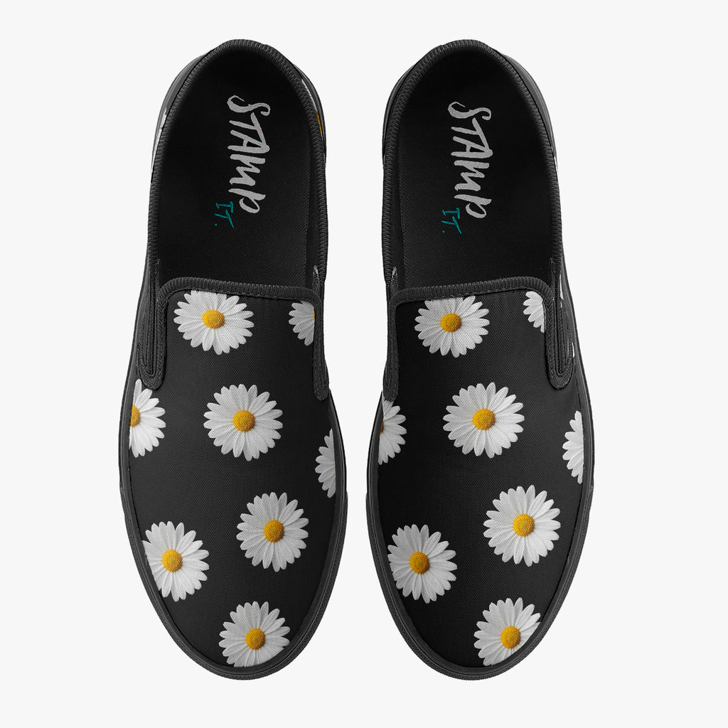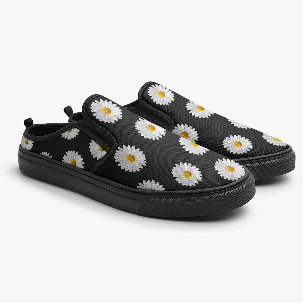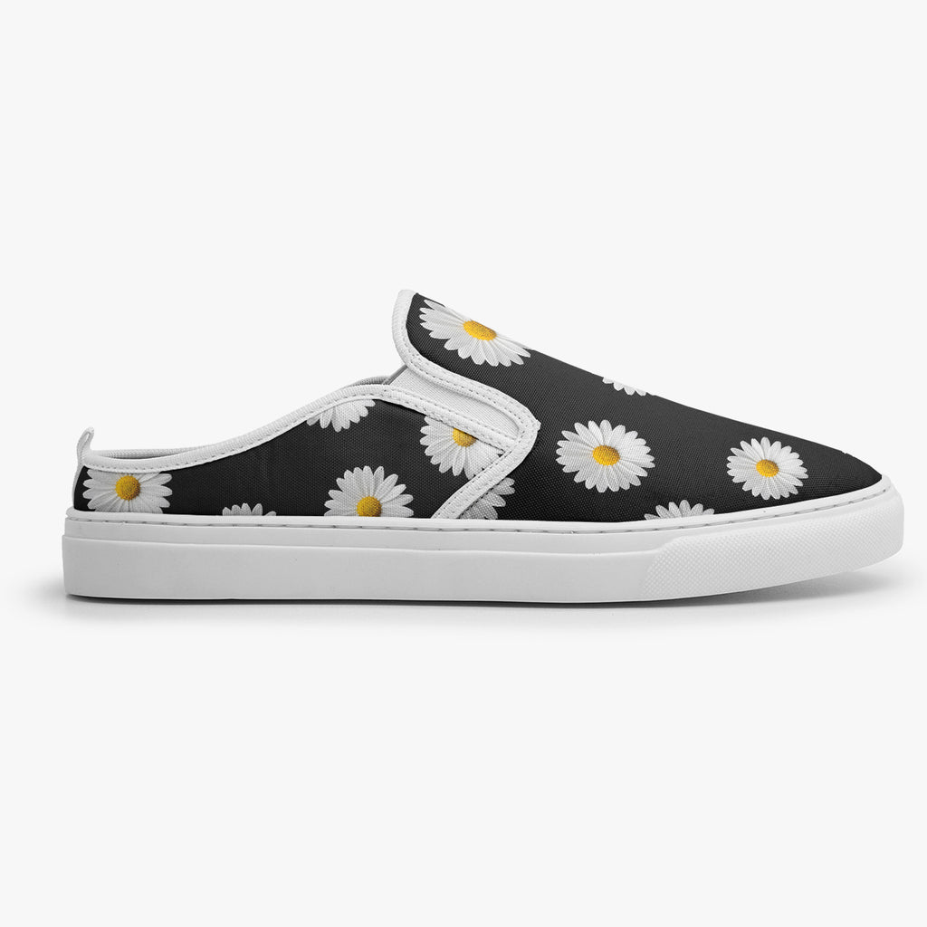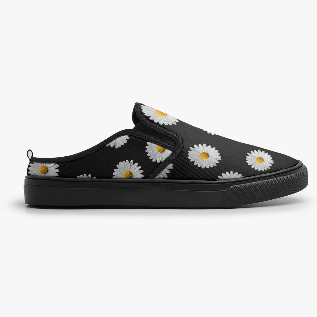 Calçado Mule Preto Margarida Flores e Folhas, confeccionado em lona, com cores e estampas exclusivas.