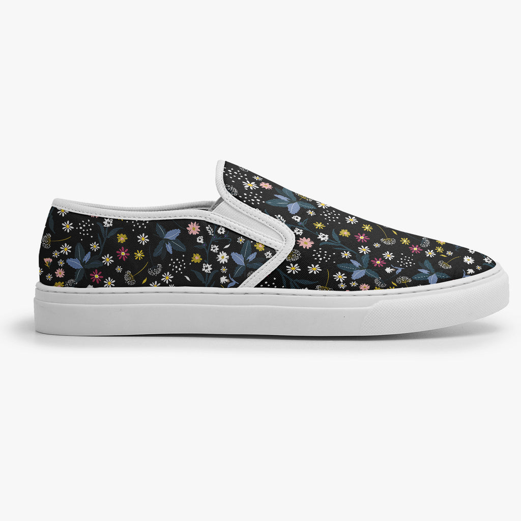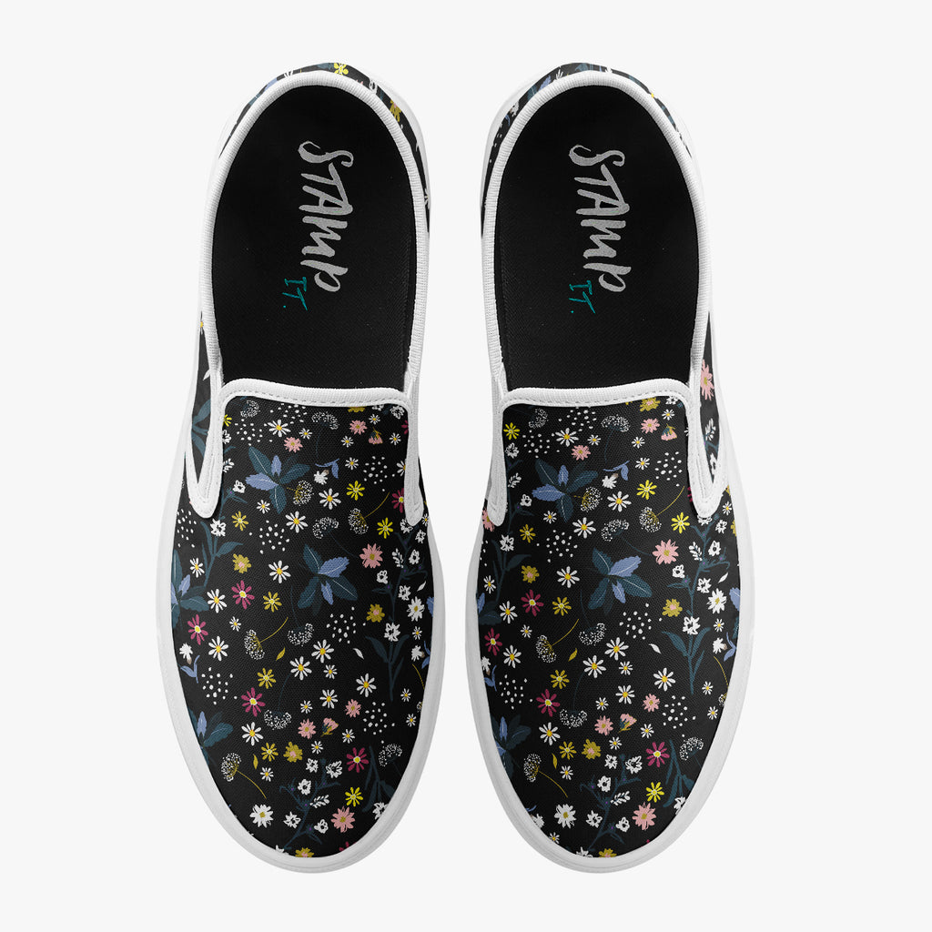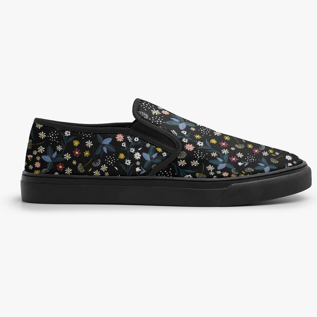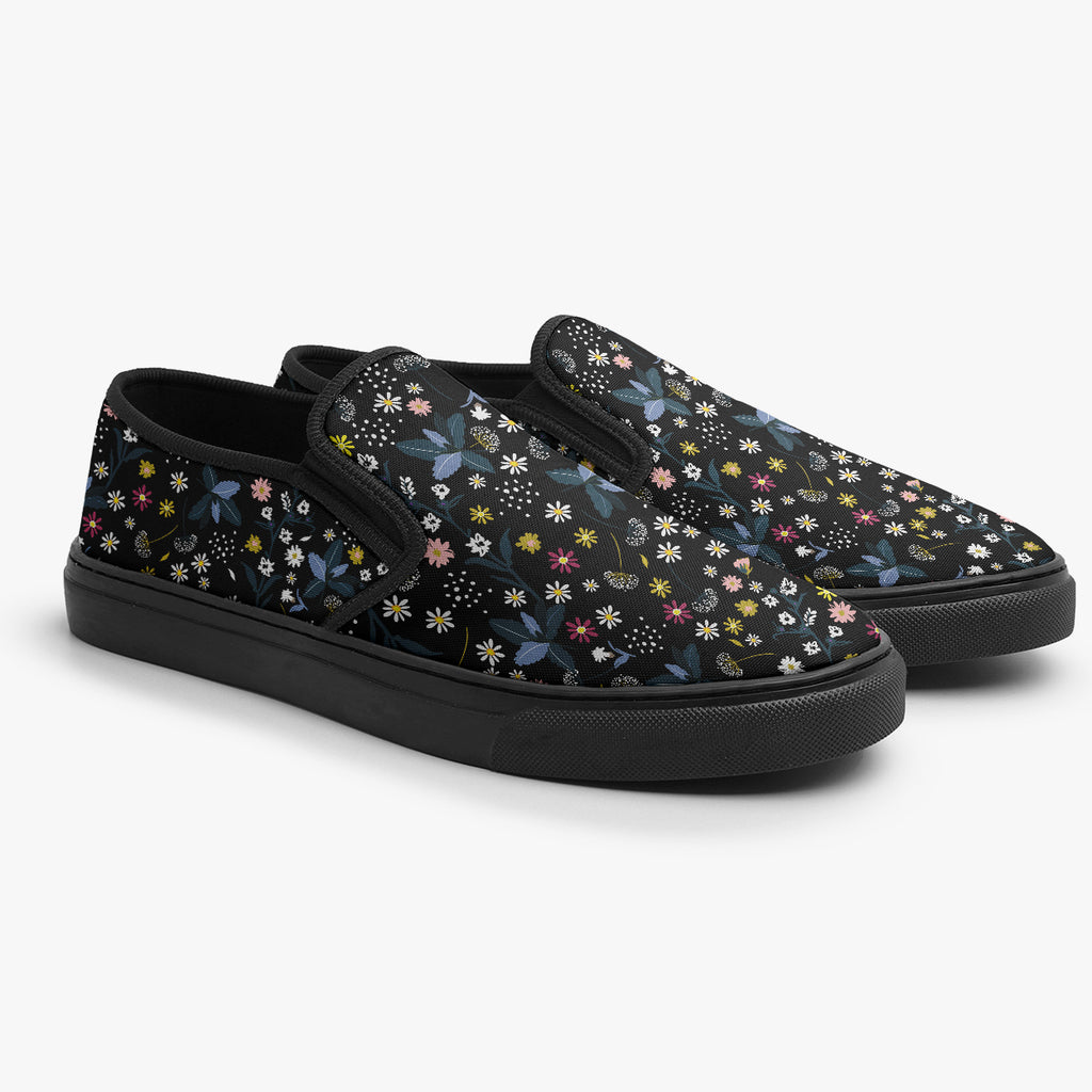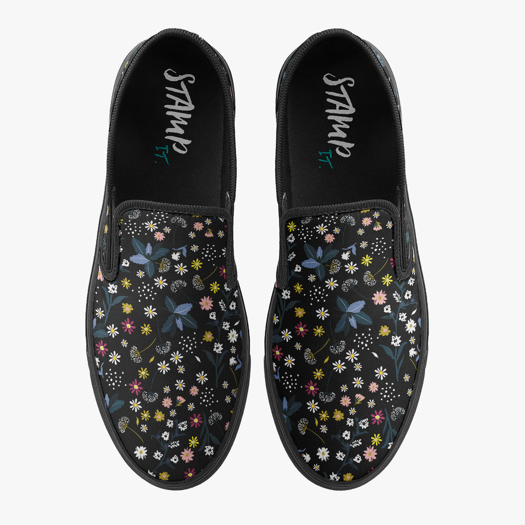 Tênis Slip On Preto Mini Flores e Folhas Flores e Folhas