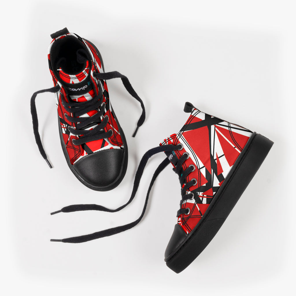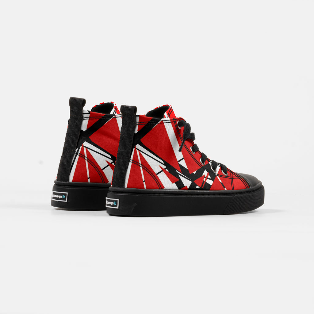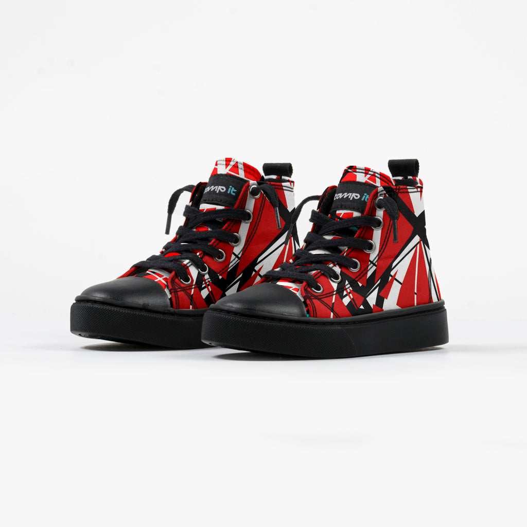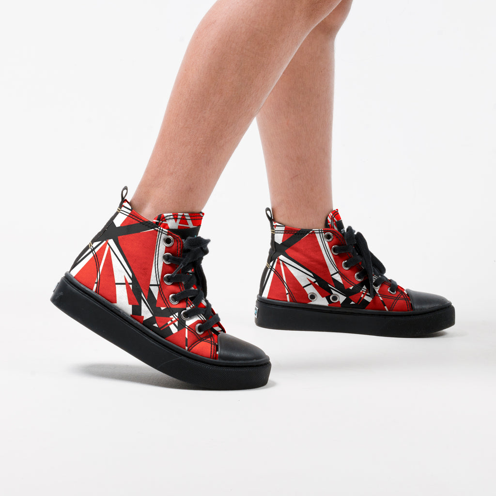 Tênis Cano Alto Infantil Preto Vermelho Branco Grafismo Van Halen Bandas de Rock, confeccionado em lona, com cores e estampas exclusivas.