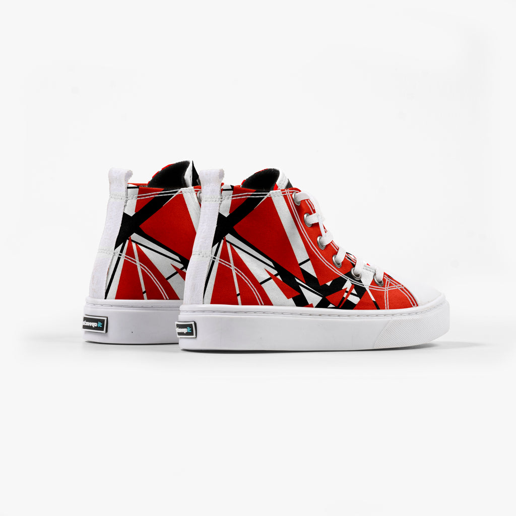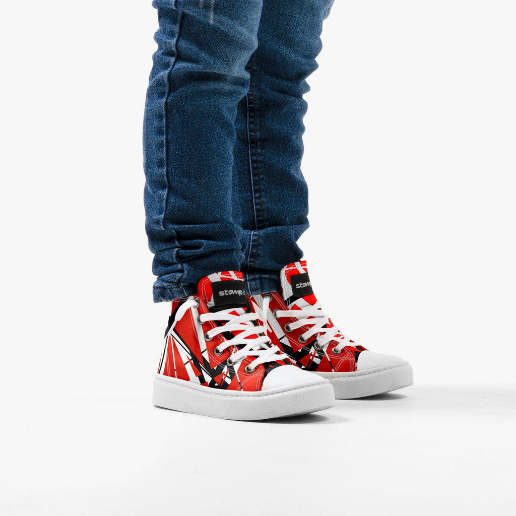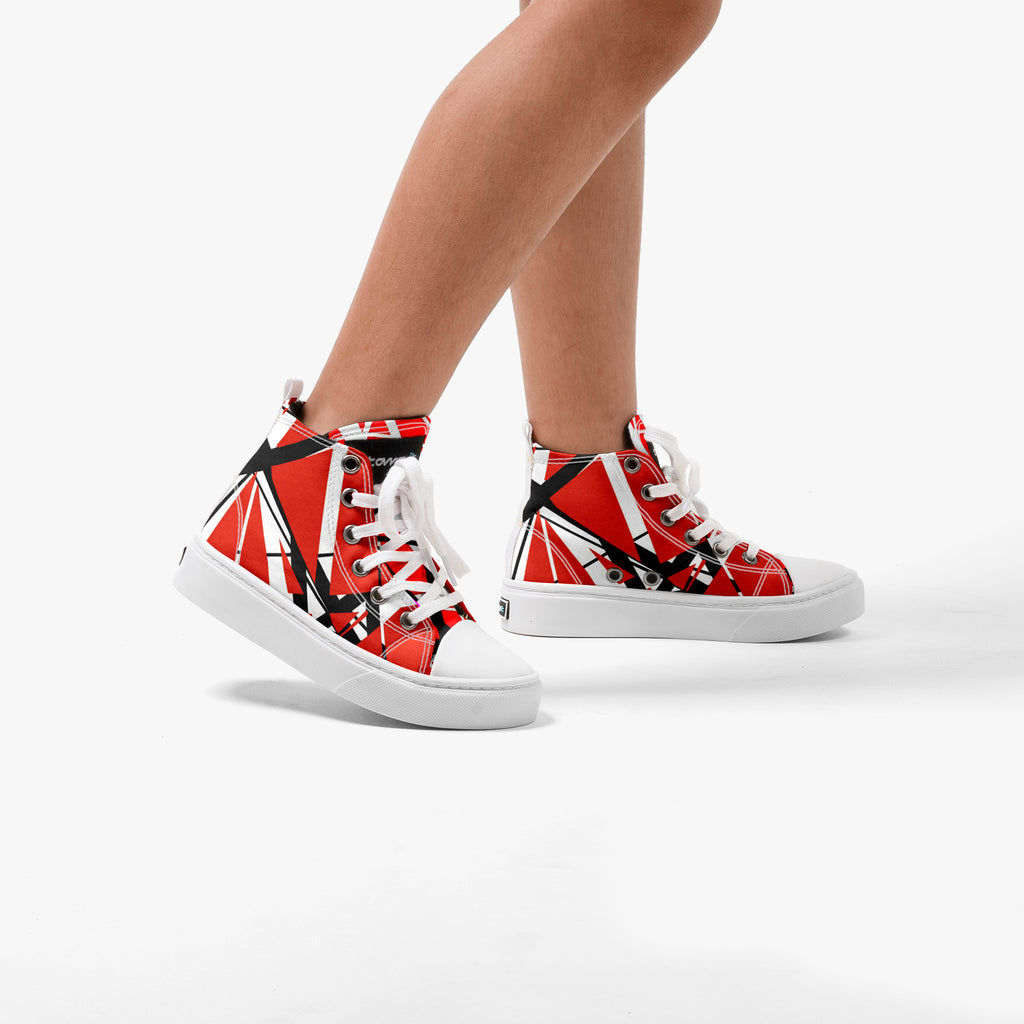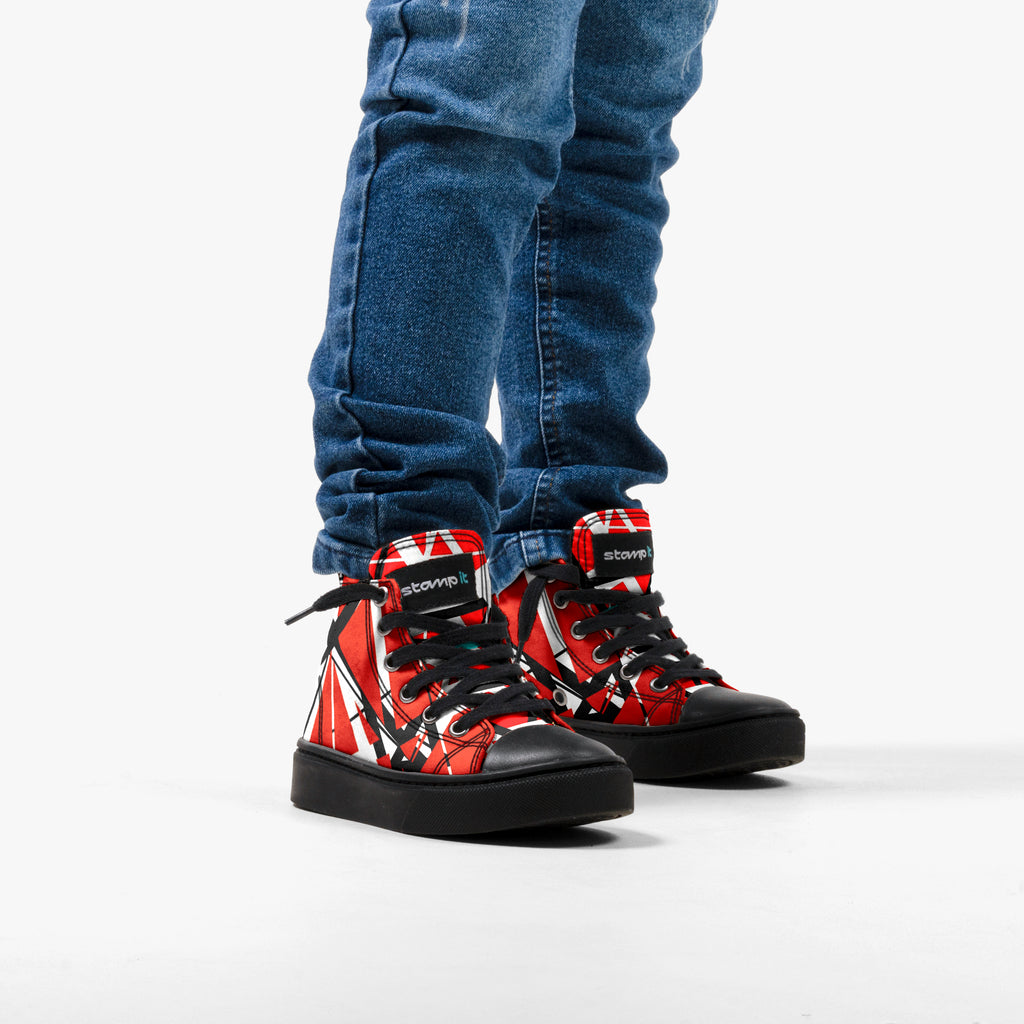 Tênis Cano Alto Infantil Preto Vermelho Branco Grafismo Van Halen Bandas de Rock, confeccionado em lona, com cores e estampas exclusivas.