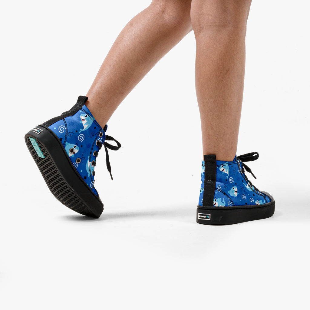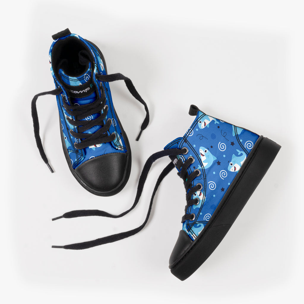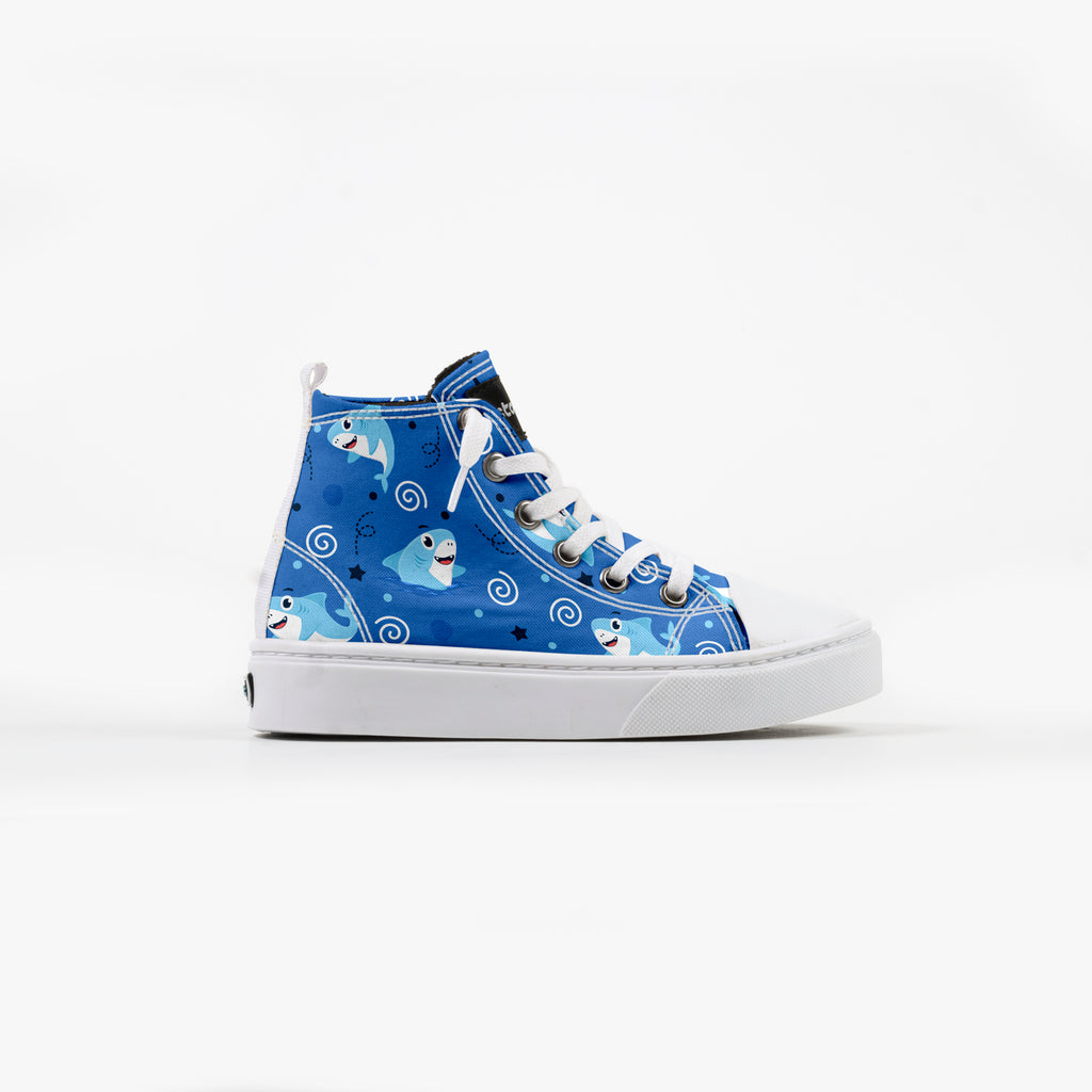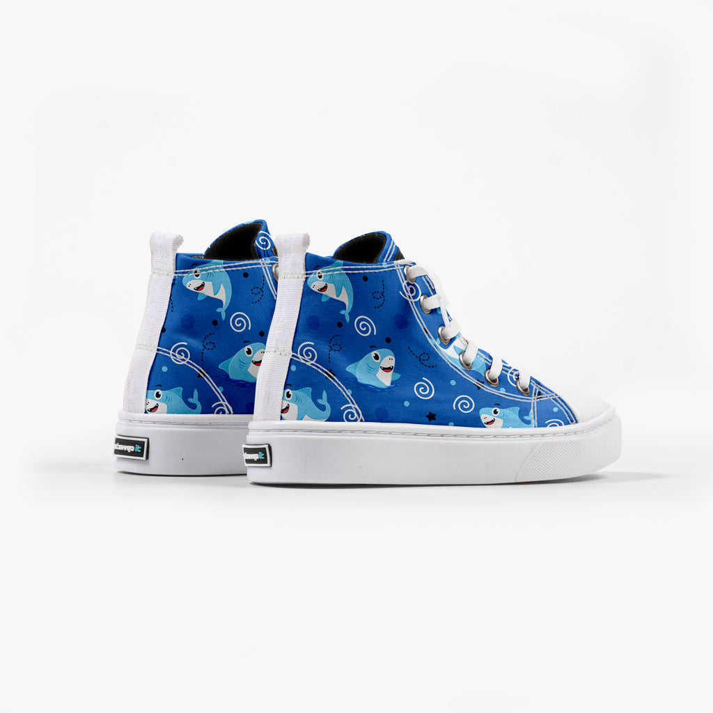 Tênis Cano Alto Infantil Shark Having Fun, confeccionado em lona, com cores e estampas exclusivas.