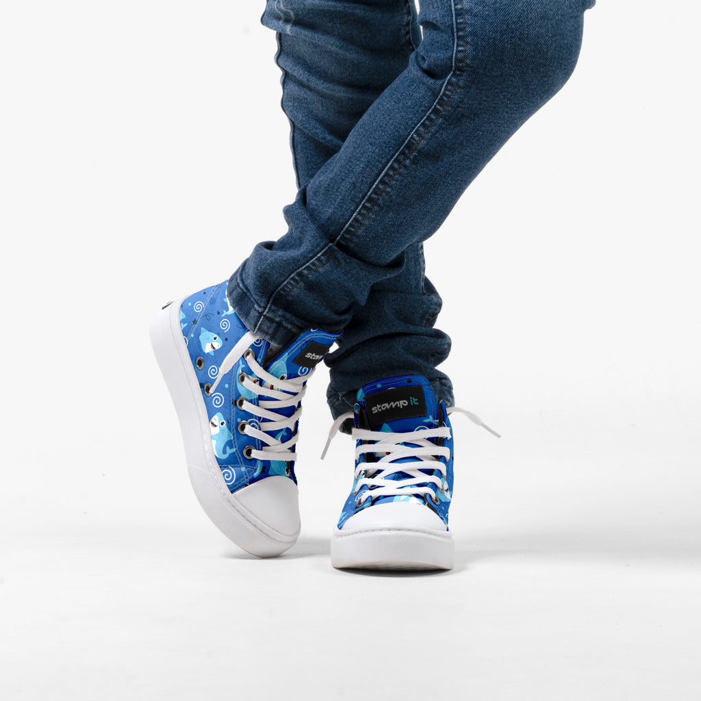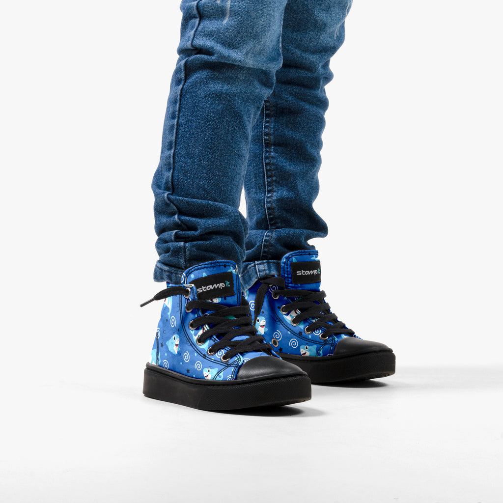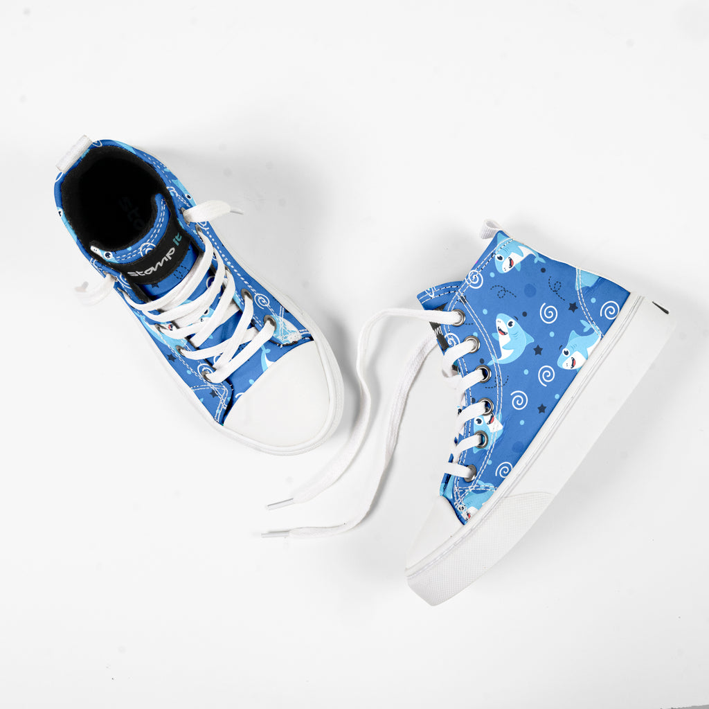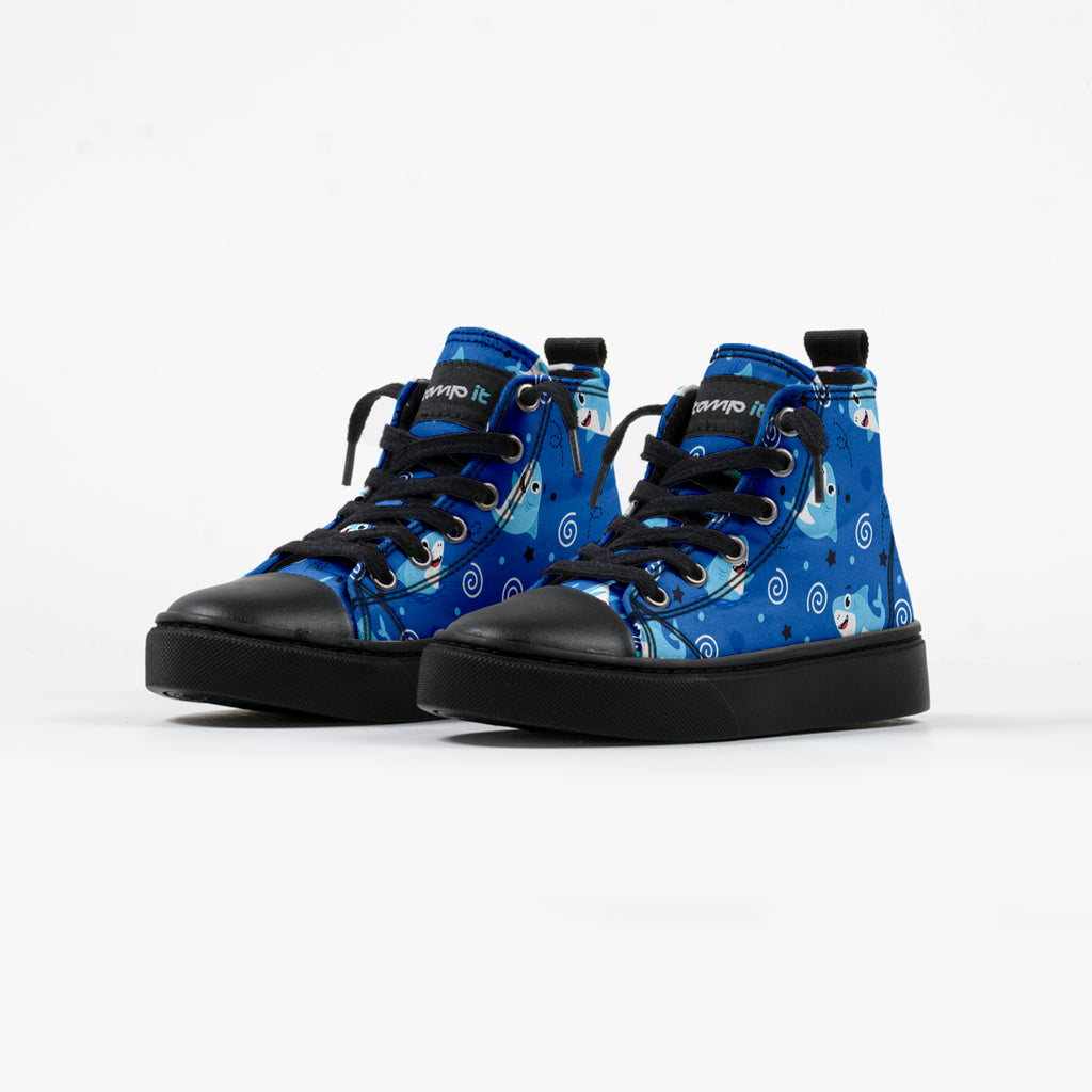 Tênis Cano Alto Infantil Shark Having Fun, confeccionado em lona, com cores e estampas exclusivas.