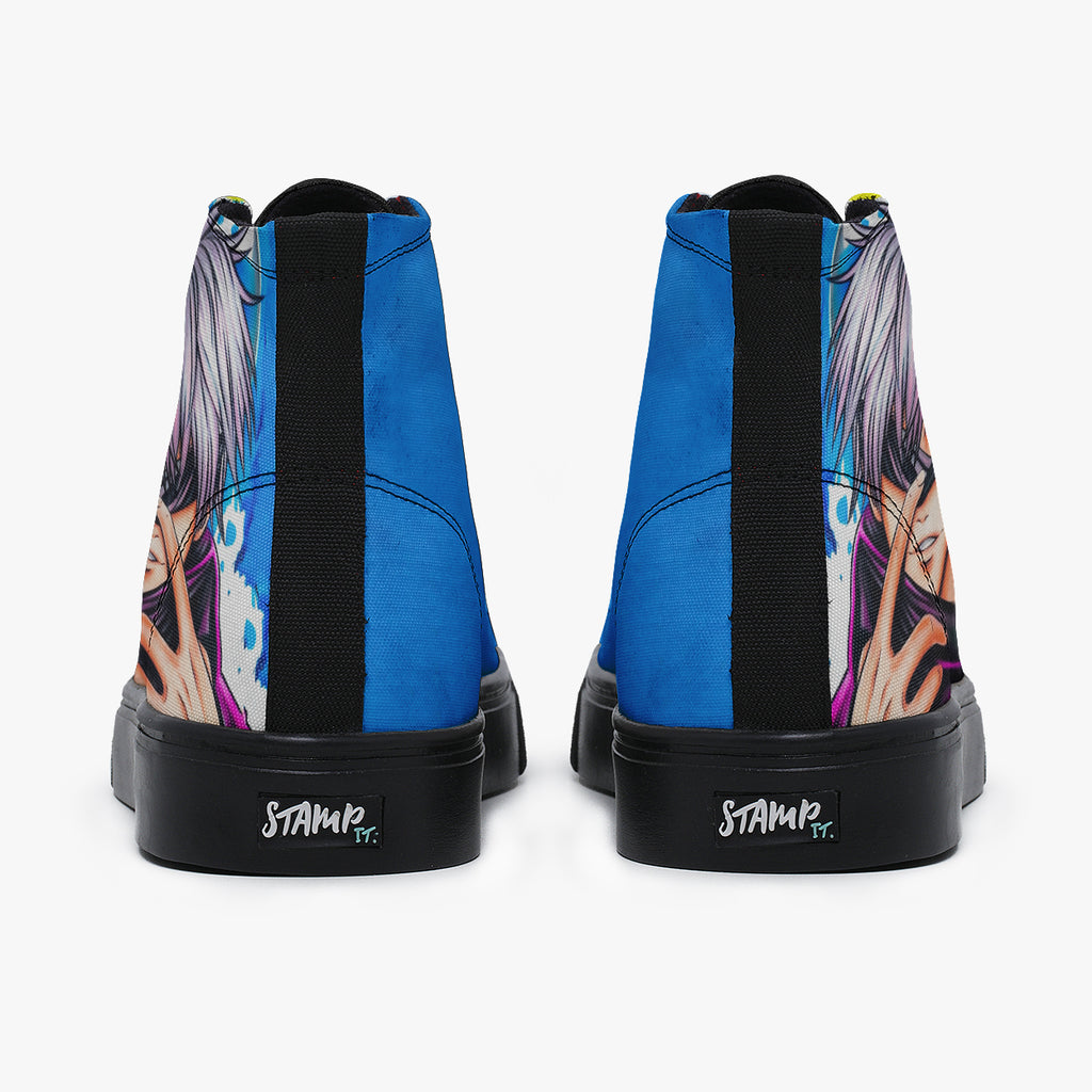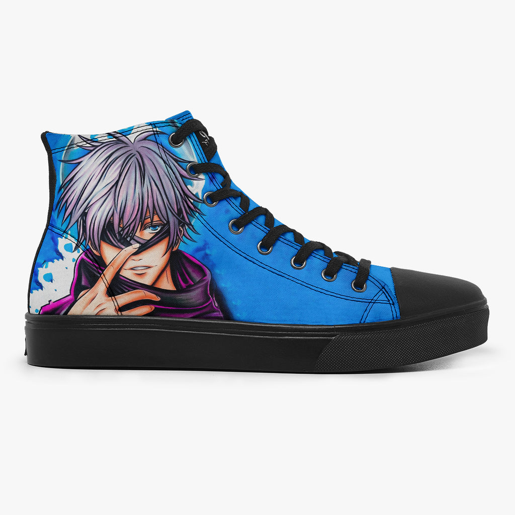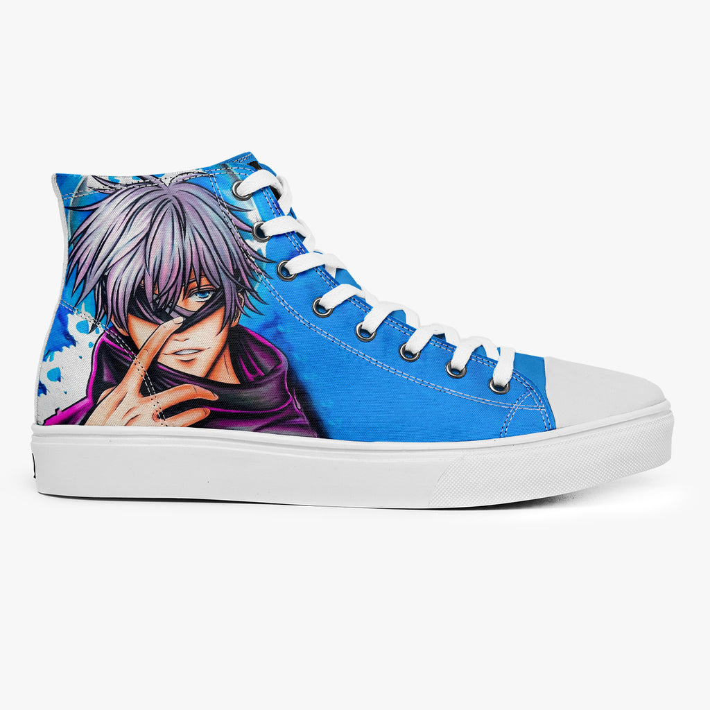 Tênis Cano Alto Azul Jujutsu Kaisen Gojo Satoru Johnsaniarts, confeccionado em lona, com cores e estampas exclusivas.
